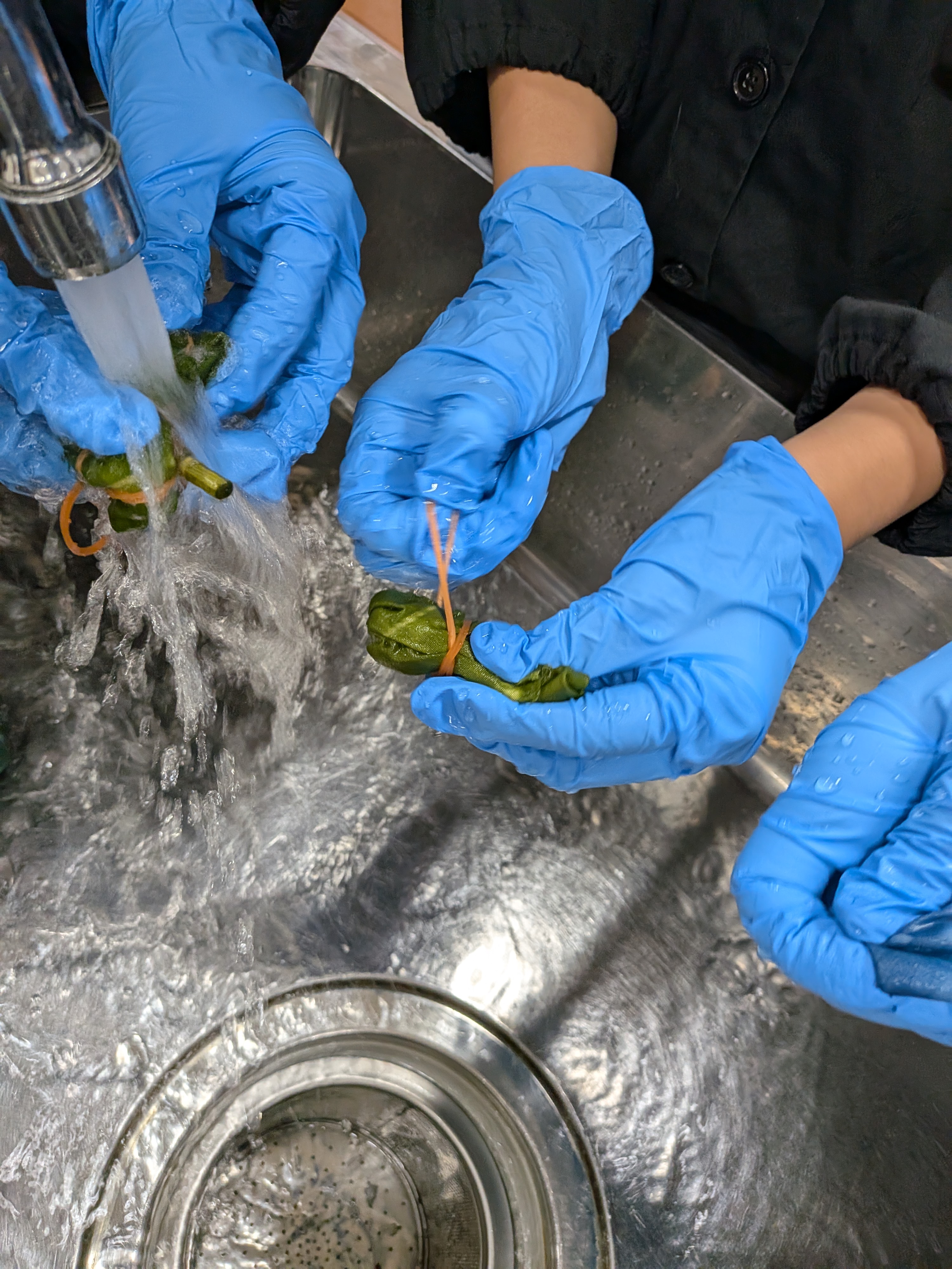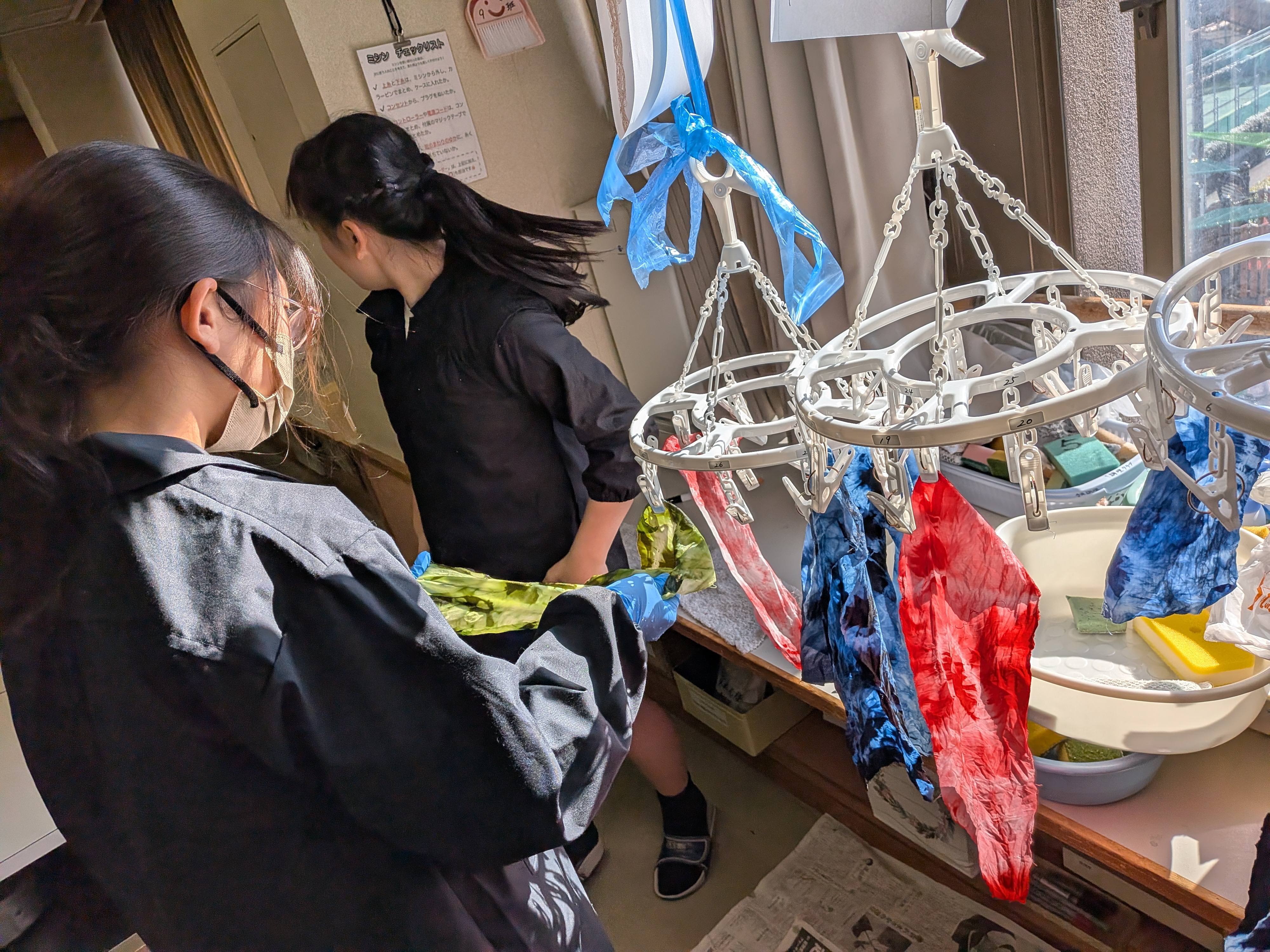 オリジナルの布を使って、ティッシュケースづくりを進めています。今週は、その布を染めるために、それぞれが思い思いの方法で絞り、染料につけ、すすいで干すところまで取り組みました。
