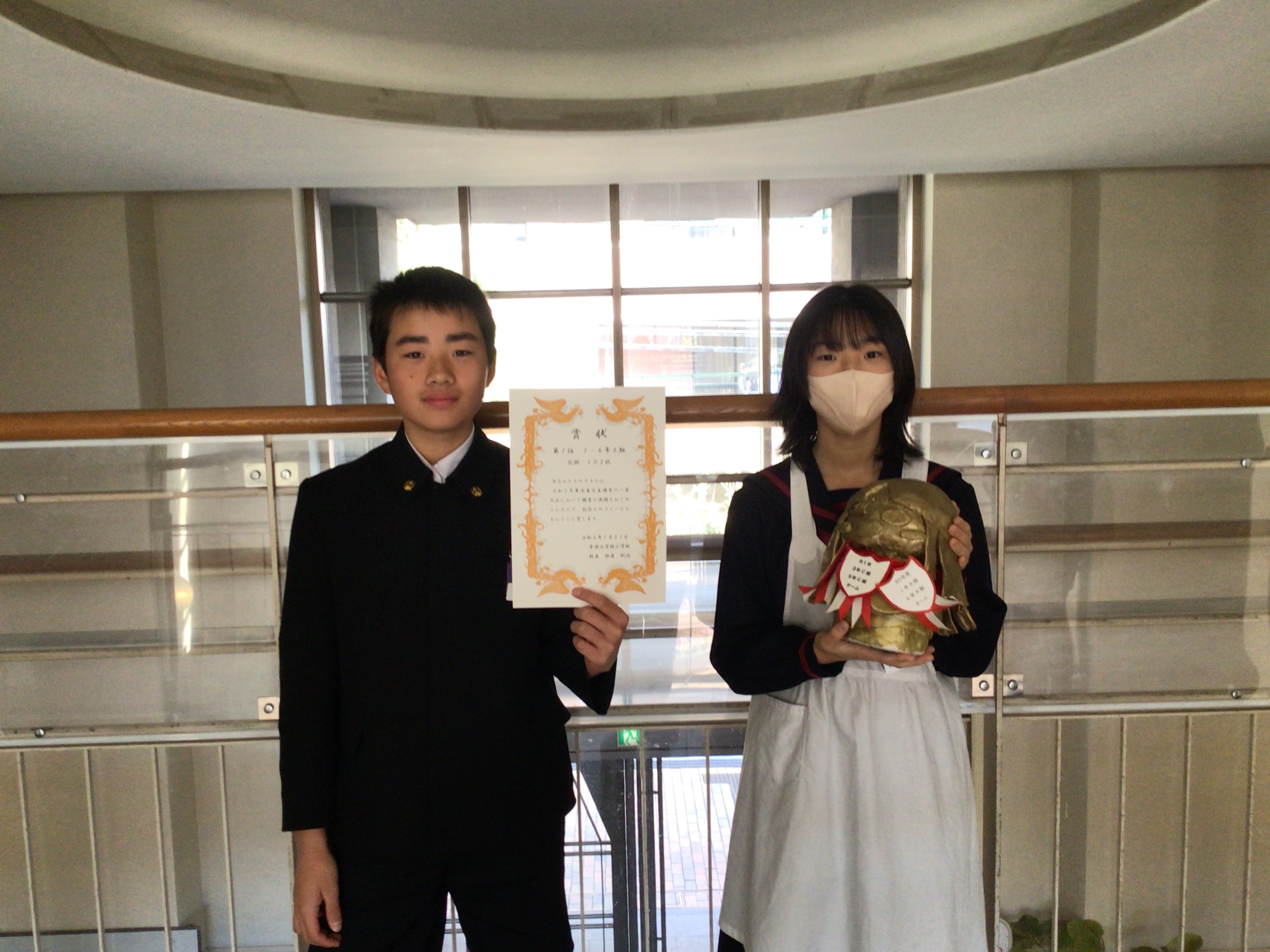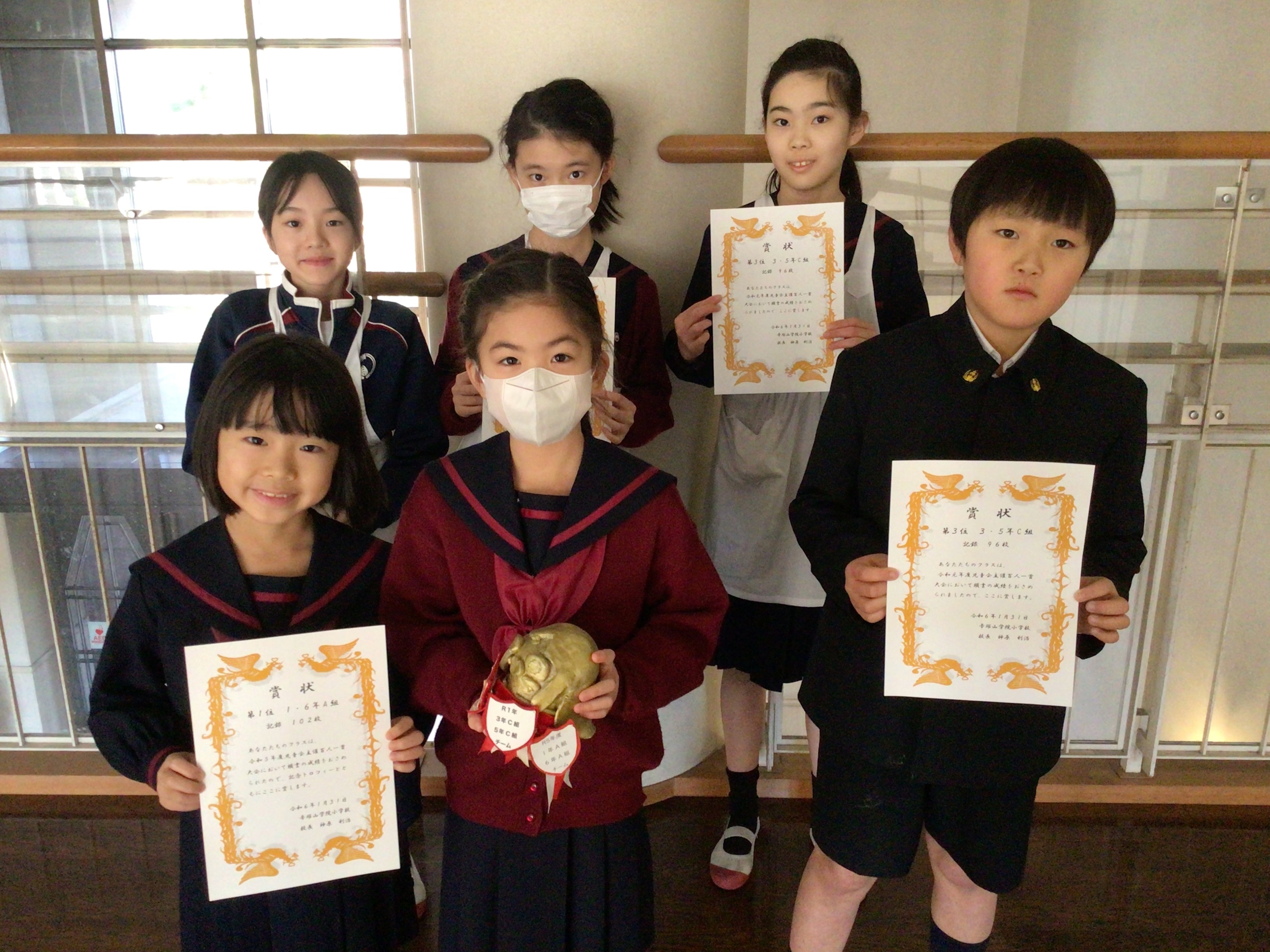 本日、TV朝礼にて百人一首大会の表彰が行われ、賞状とトロフィーが優勝・準優勝のクラスに授与されました。