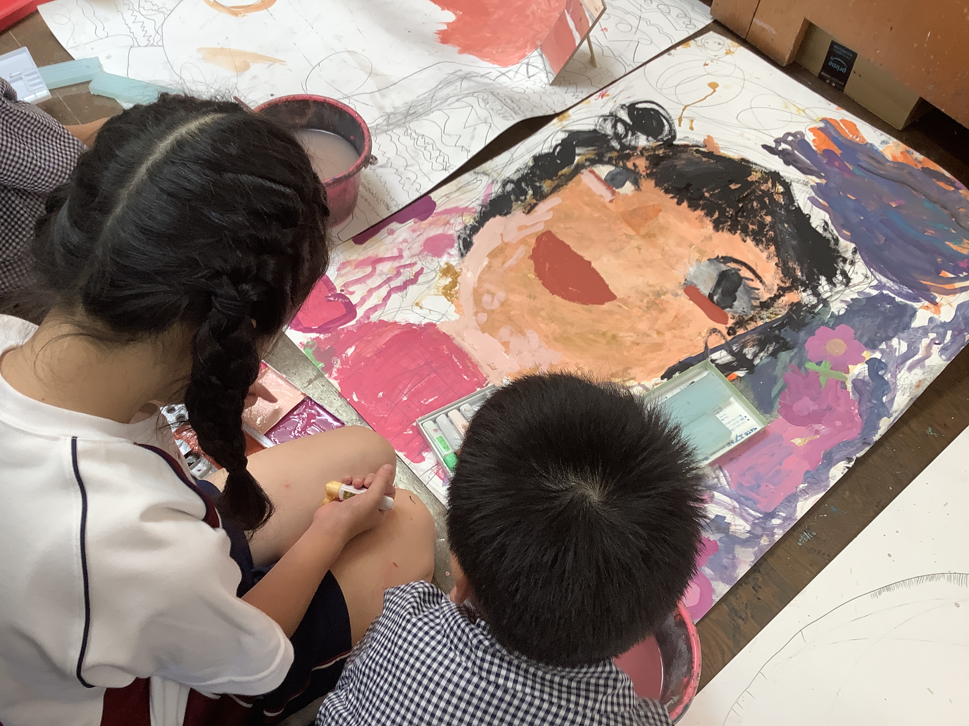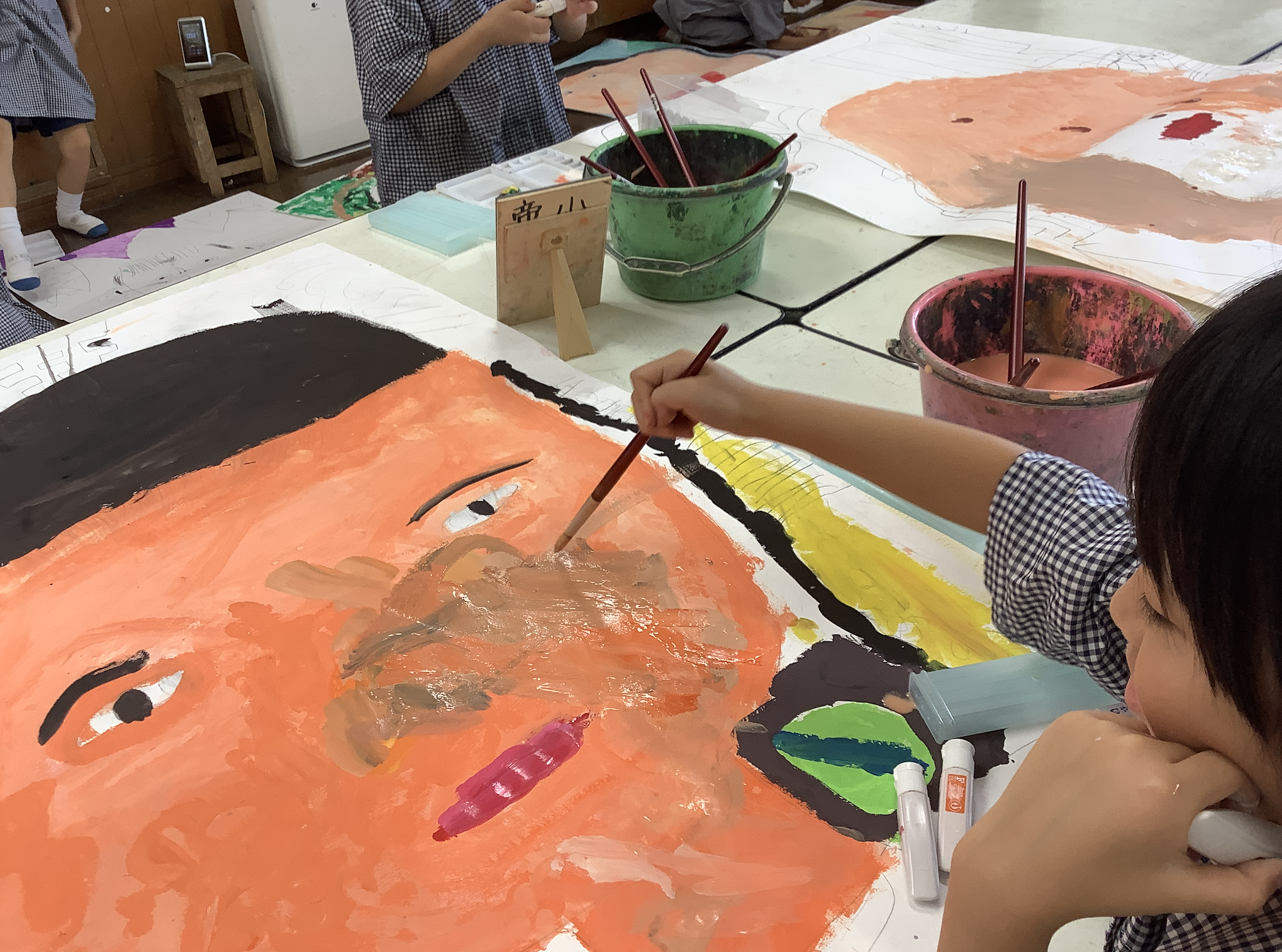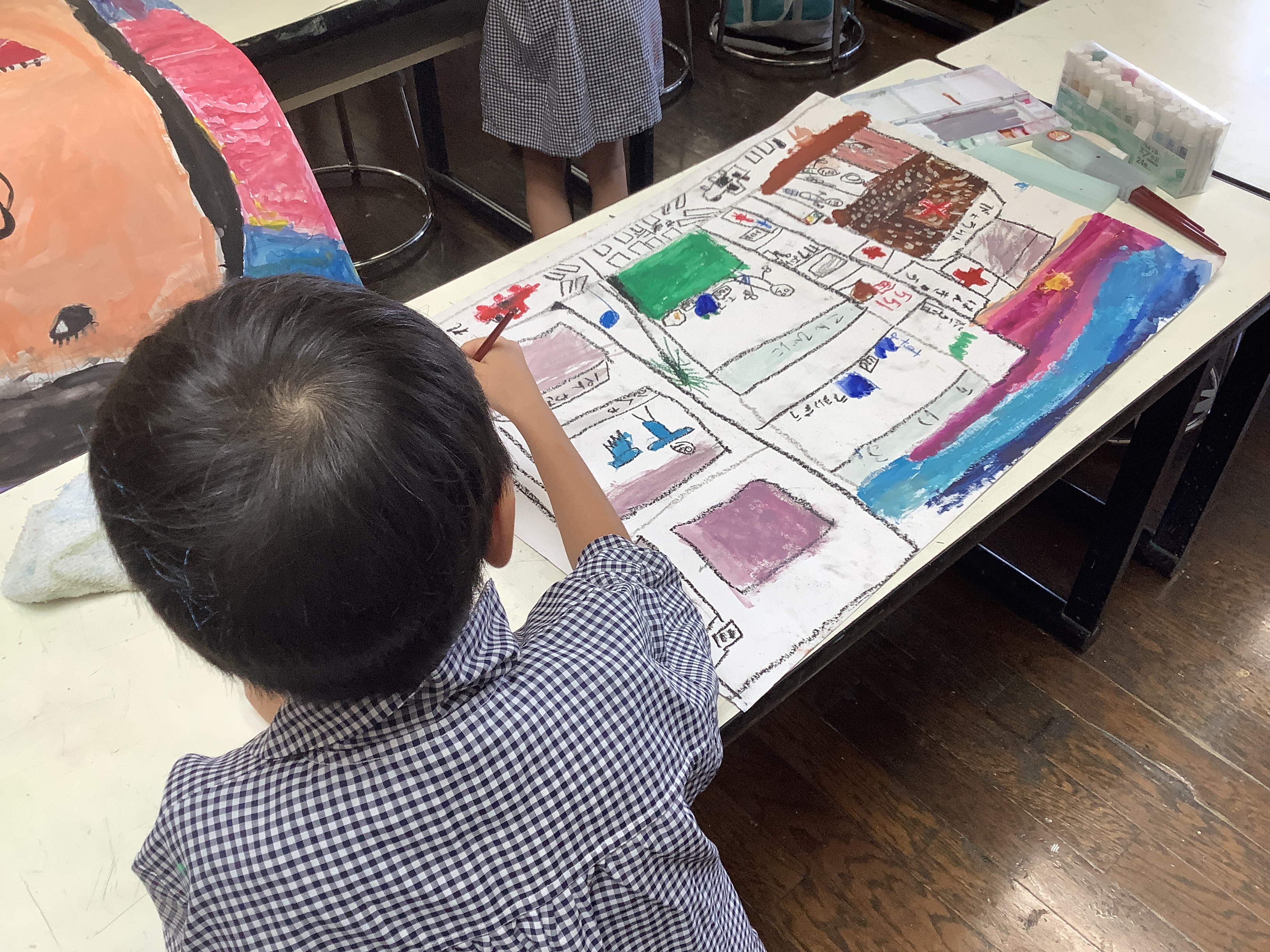 1年生の図工の授業では『自分の顔』『まちの素敵なお店やさん』というテーマで作品づくりを進めています。