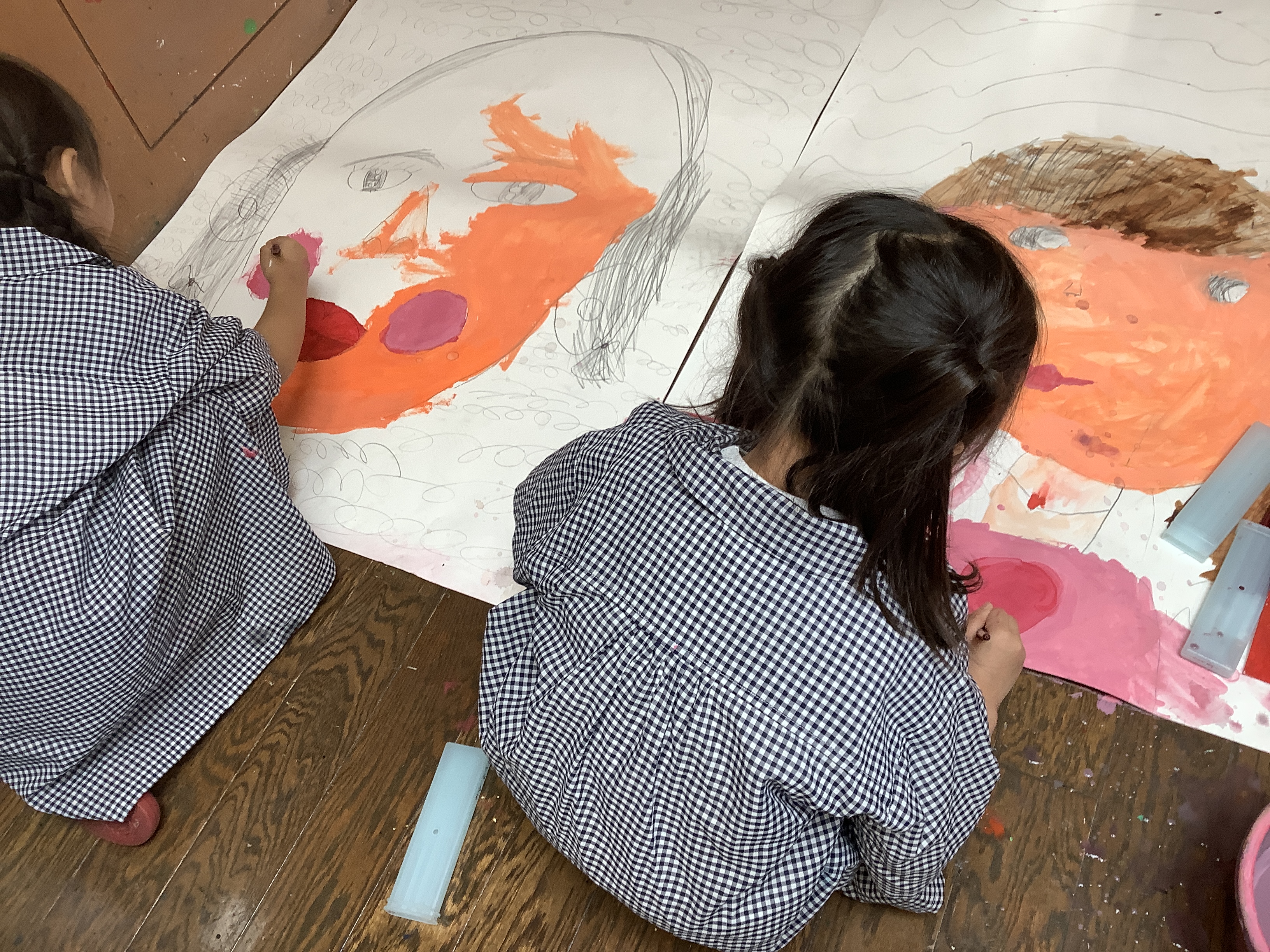 子どもたちは大きな紙に、全身を使って表現してくれています。