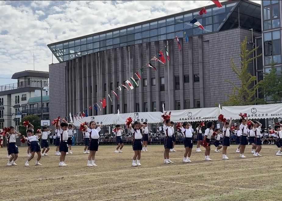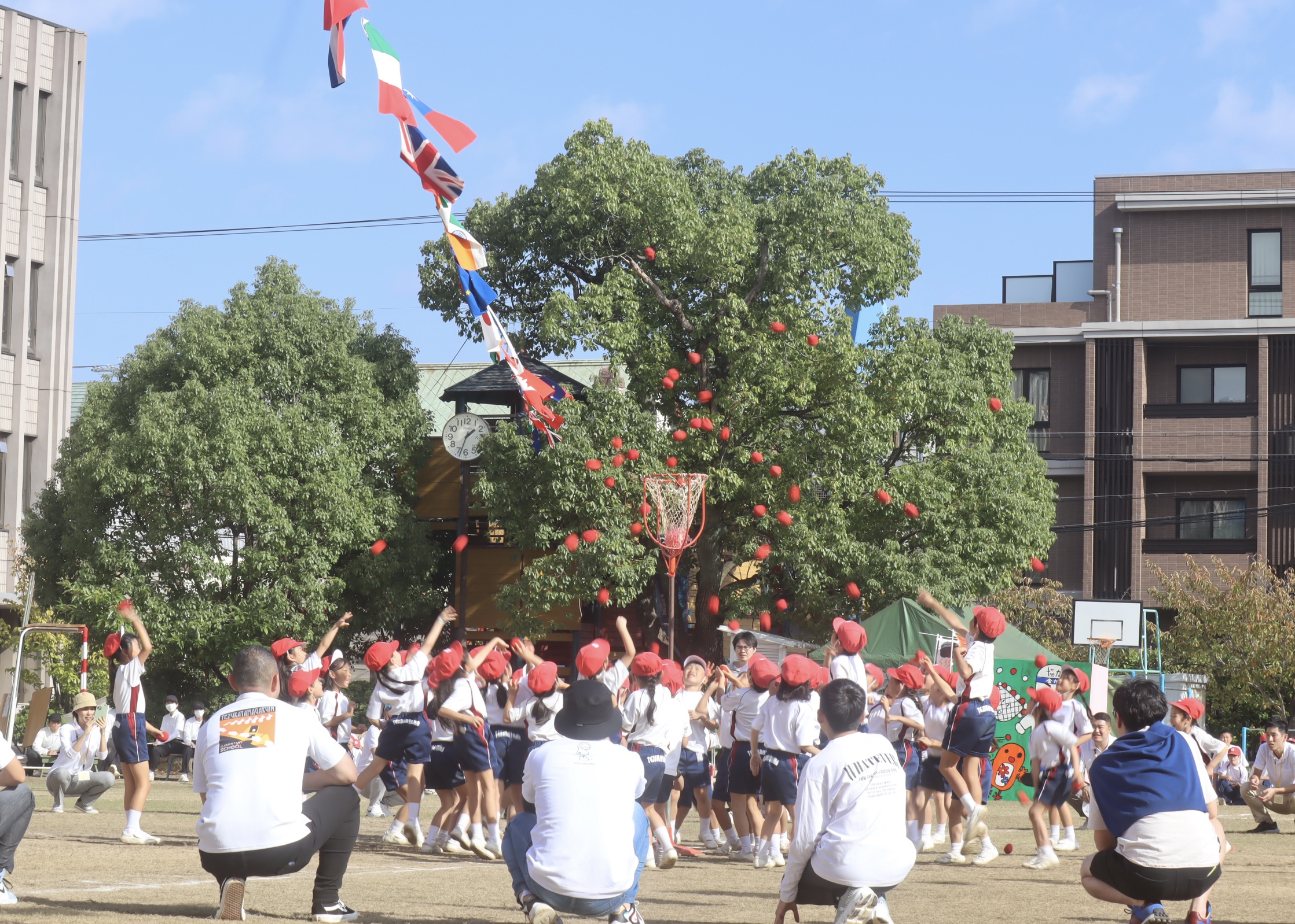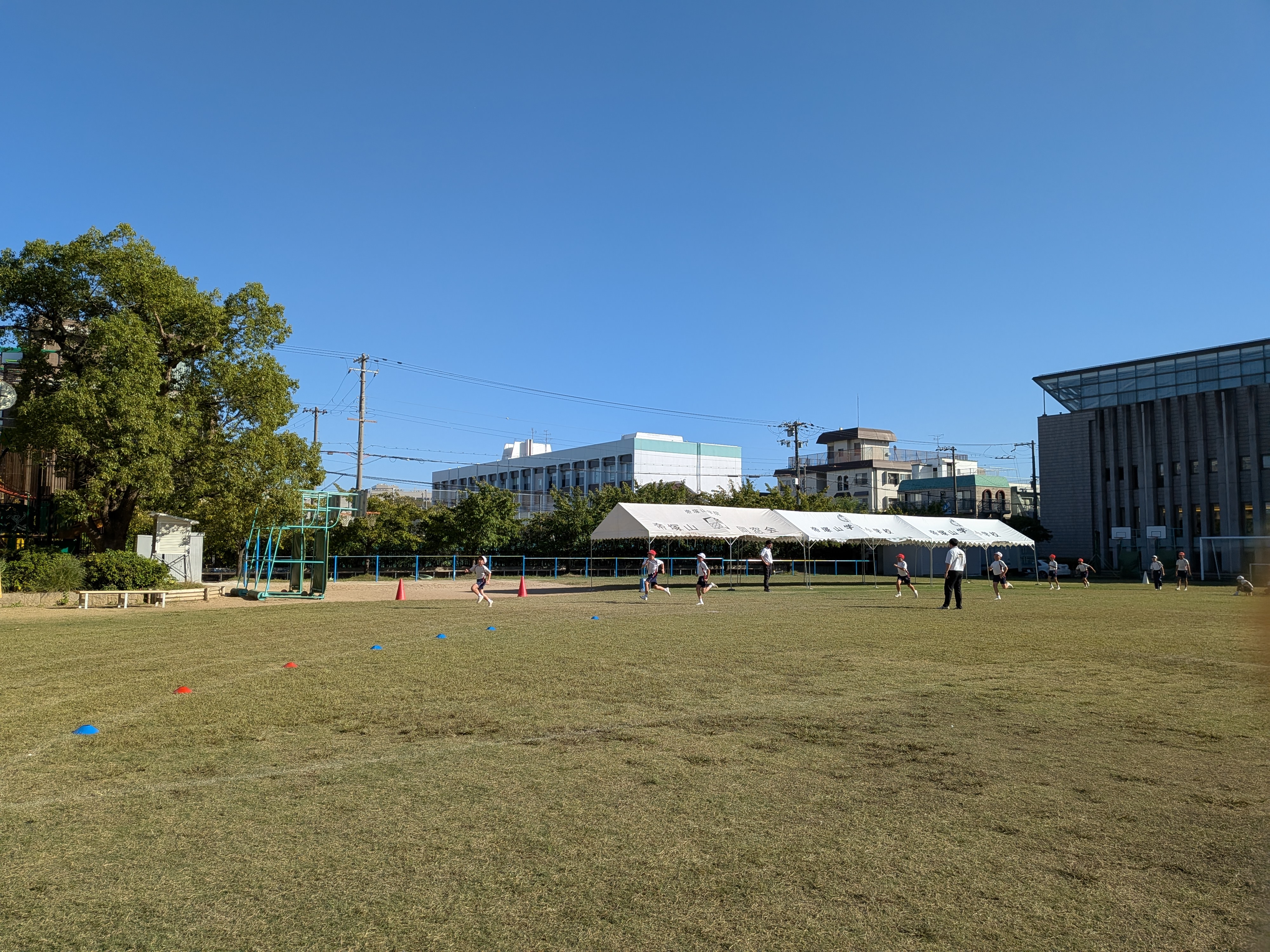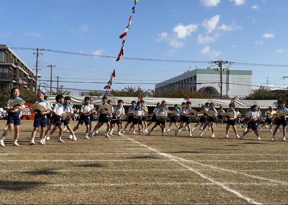 秋空の下、トンボが飛び交う運動場で、1年生が元気いっぱいに練習を重ねています。