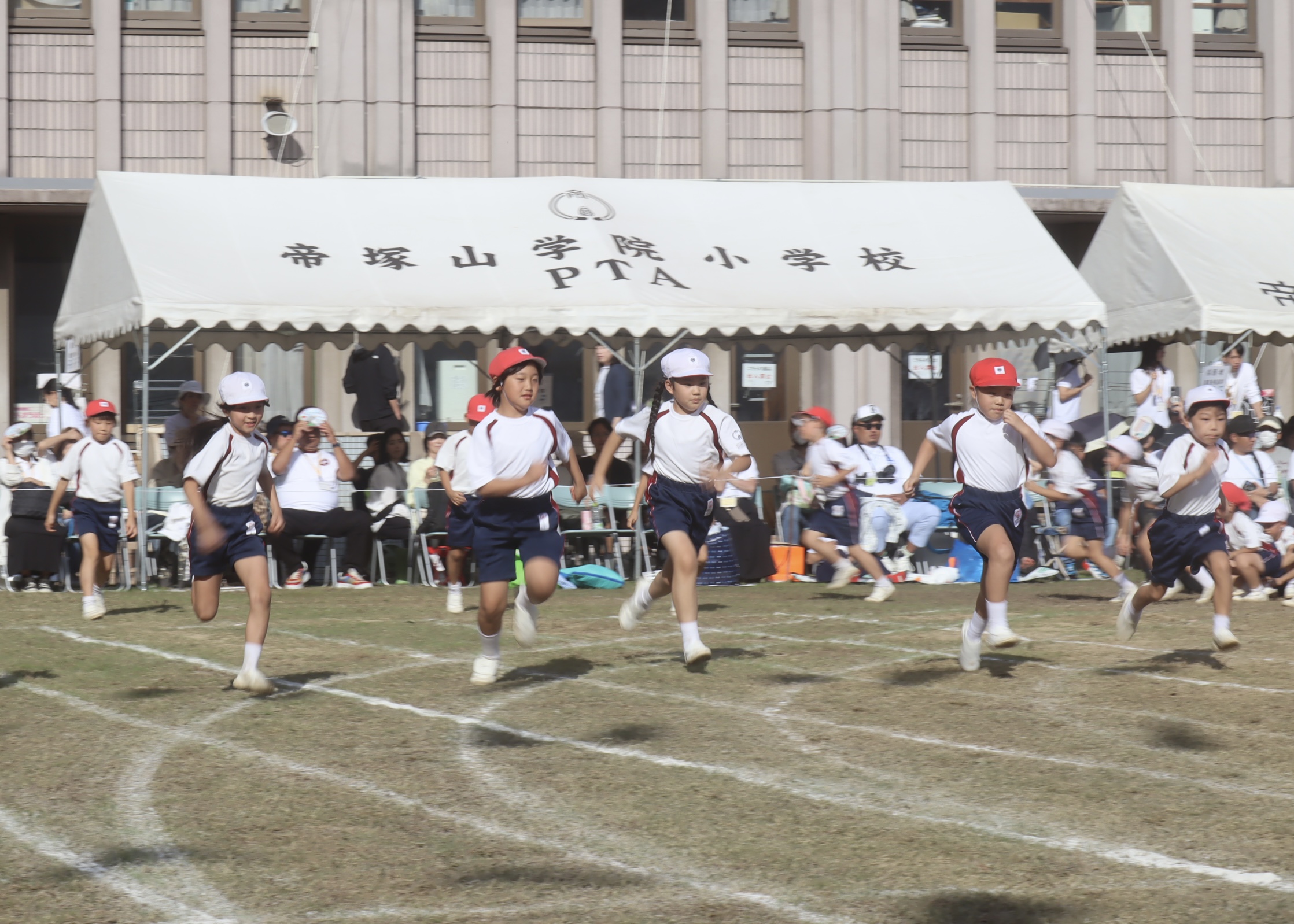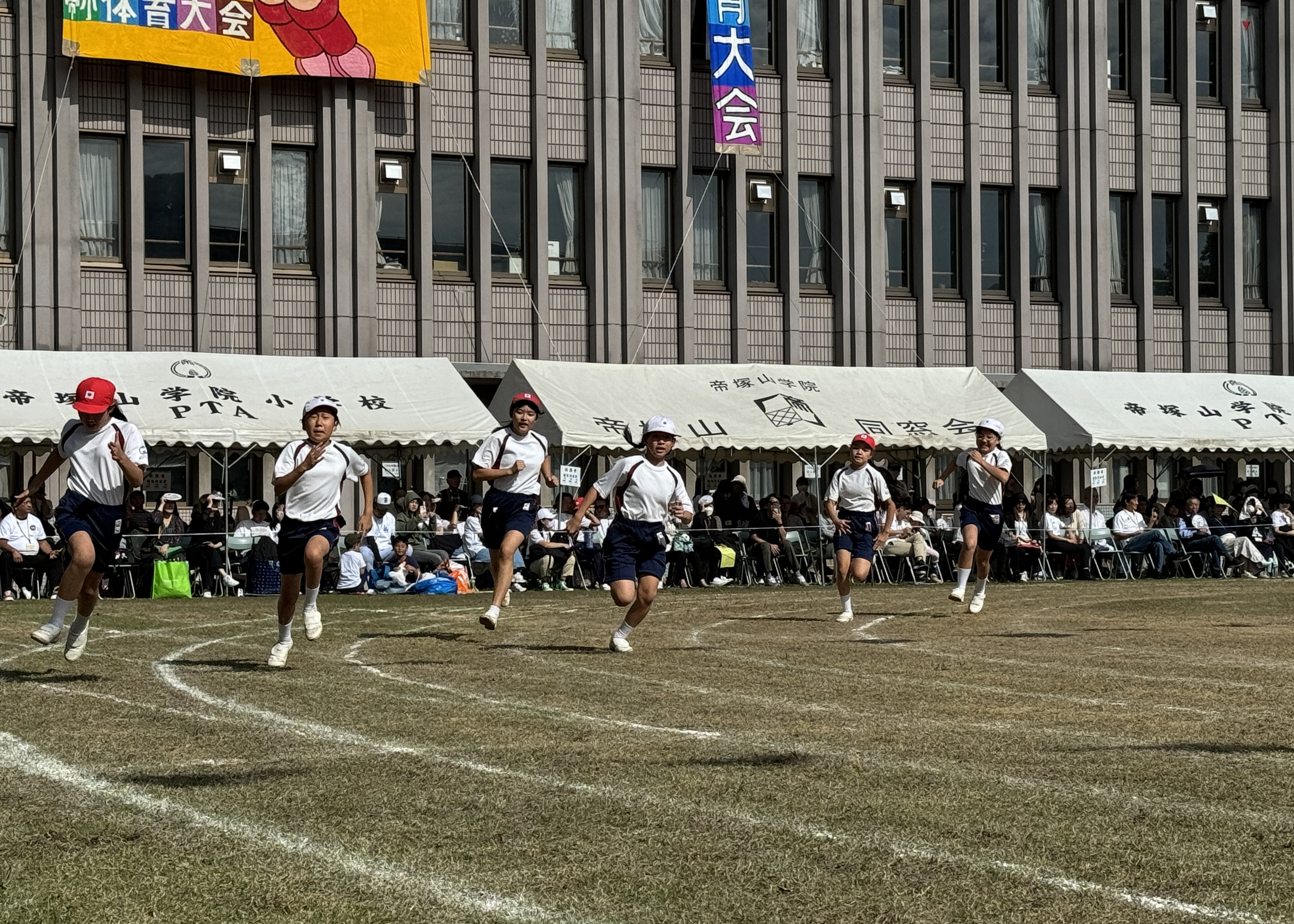 (写真は2年生の大玉転がし、3年生の台風の目、4年生の80m走です)