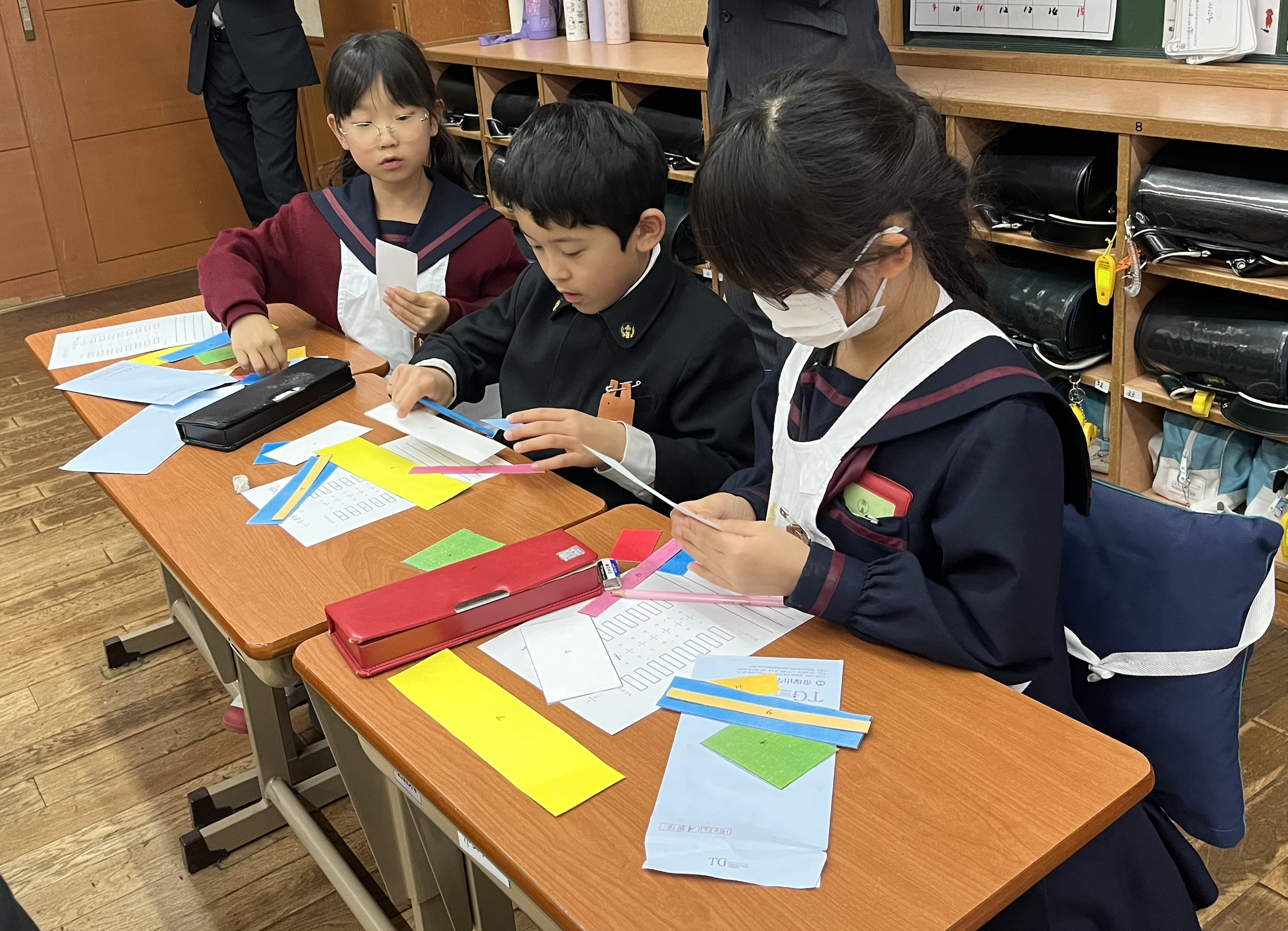 2年生の算数科で、色板を使い、分数の学習を行いました。お友だちと協力し、たくさんの色板の中から、3分の1の大きさの色板を探し出すことができました。