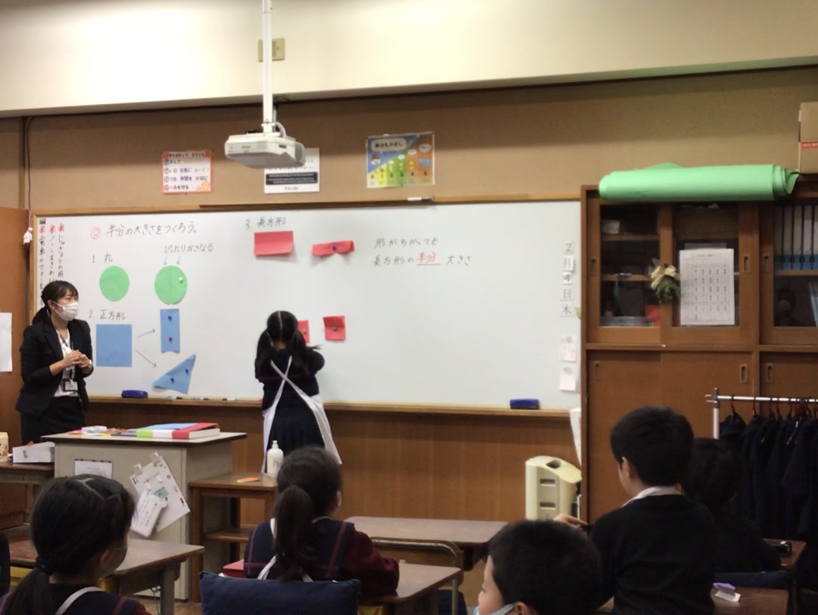 難しい課題でしたが、2年生なりに一生懸命考え、これから新しく学ぶ、「分数」に対して意欲を持てる授業になりました。