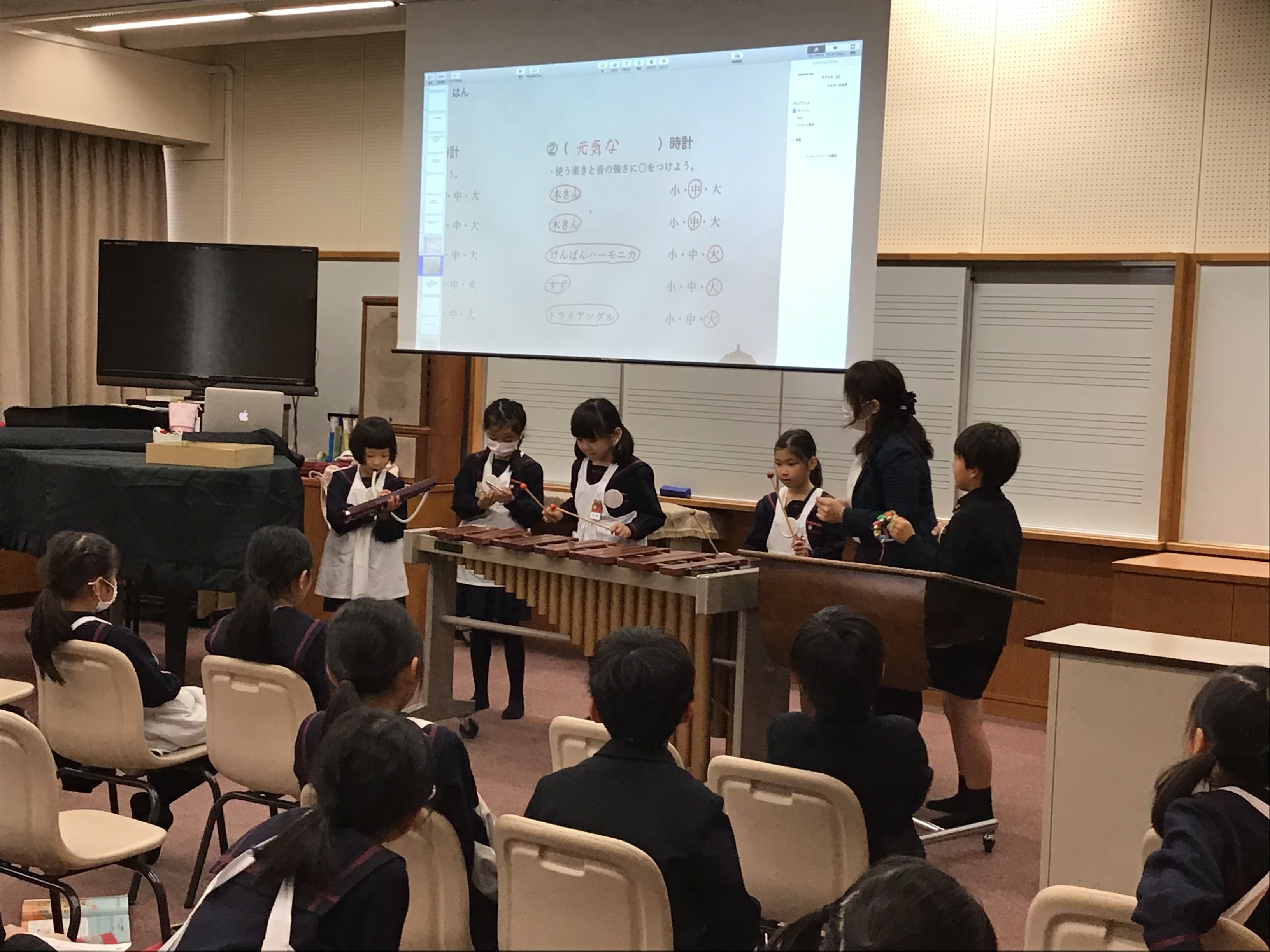 ハーリヤノーシュの「ウィーンの音楽時計」を元にした、音楽づくりをしました。使う楽器や音の強弱を工夫して、自分たちの時計の音楽をつくりました。