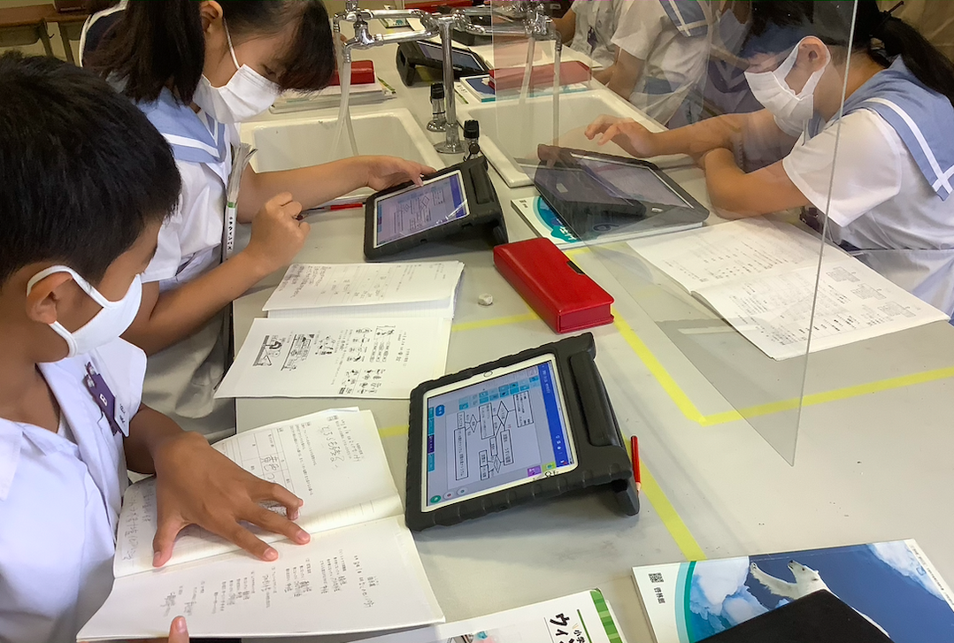 6本の試験管の中に、どの水溶液が入っているのかを当てるという課題でした。今までに学習した水溶液の分類方法を用いて、子どもたちはグループごとにフローチャートで計画を立てました。中間発表では、実験の方法や順序の違いに気がついたり、iPadをうまく使い編集しているグループもあり驚きでした。さて、実験はうまくいくのでしょうか。楽しみです。