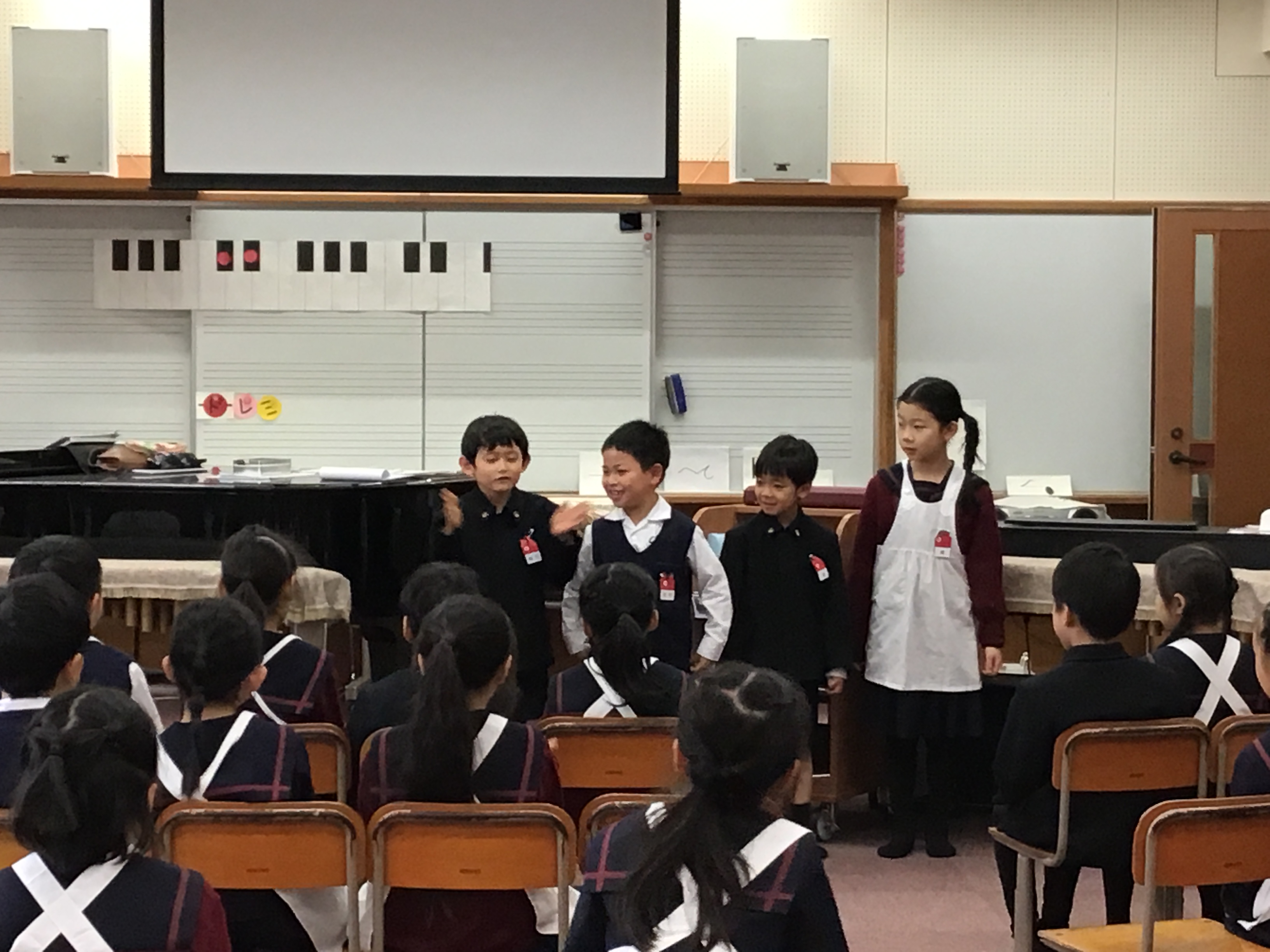 4拍分のリズムをつくってまねっこをしたり、鍵盤ハーモニカでド、レ、ミの3音を使って4拍分の旋律をつくって発表したりしました。旋律づくりでは、どんなことを考えながらつくったのか、自分の考えも発表しました。「音がだんだん上がるようにしたよ」「明るい感じにするために高い音にしたよ」など、自分の考えたこともしっかり伝えていました。