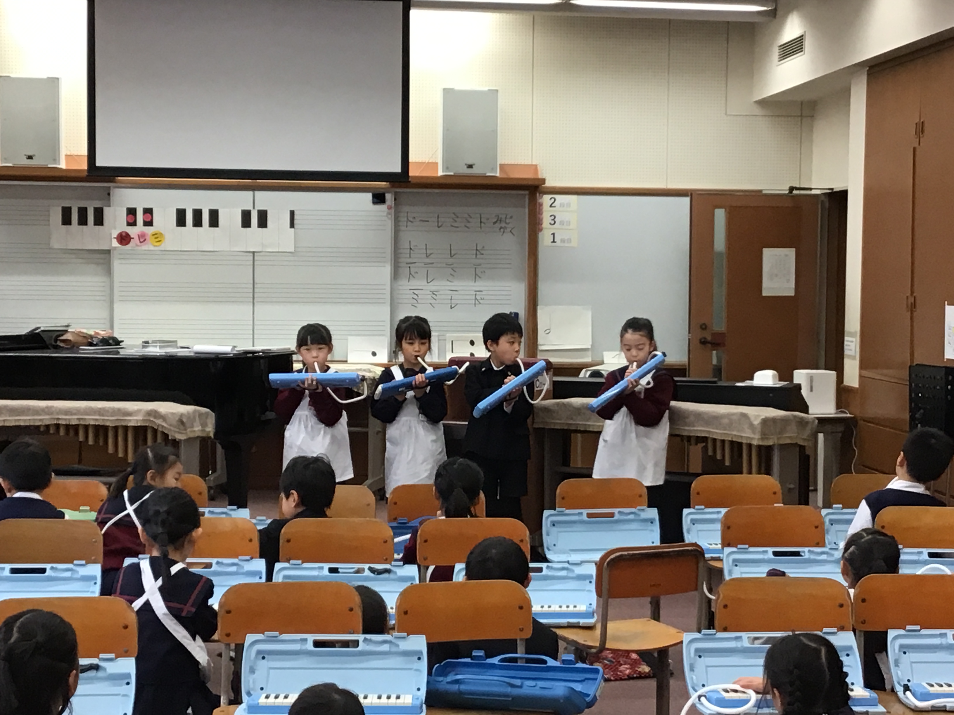 1年生の音楽では、ドレミの旋律をつくって考えを伝え合うという内容で研究授業を行いました。