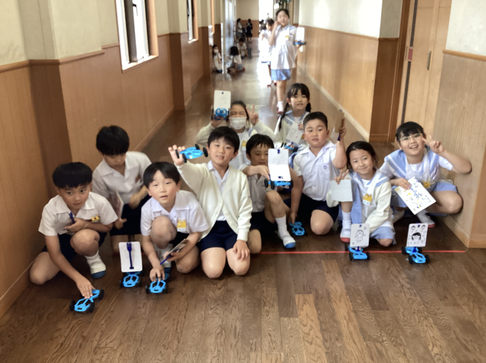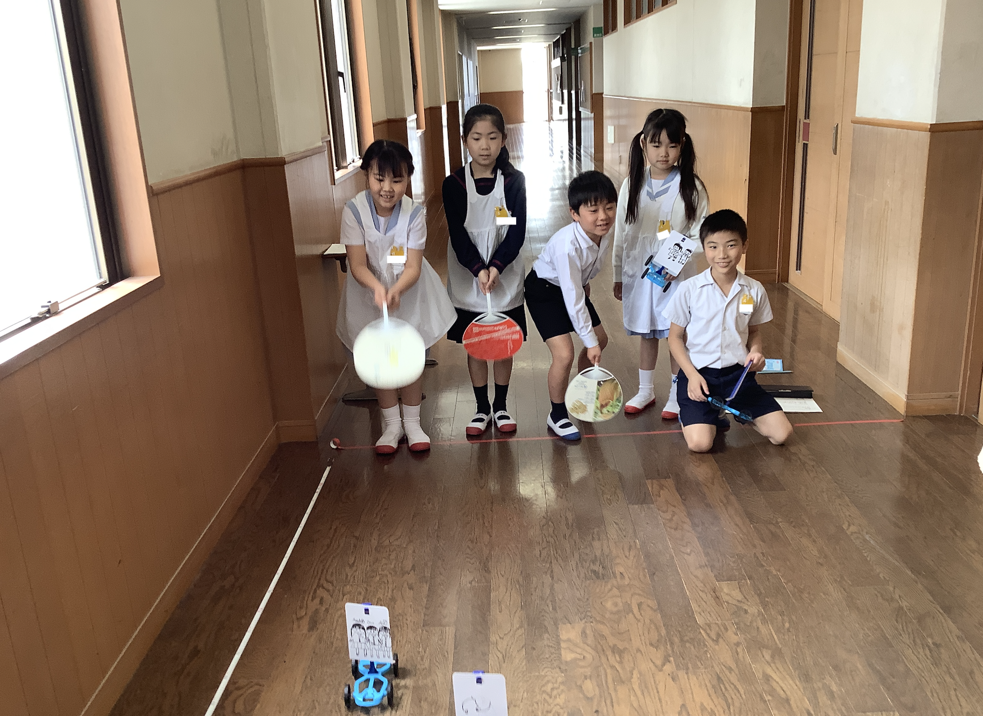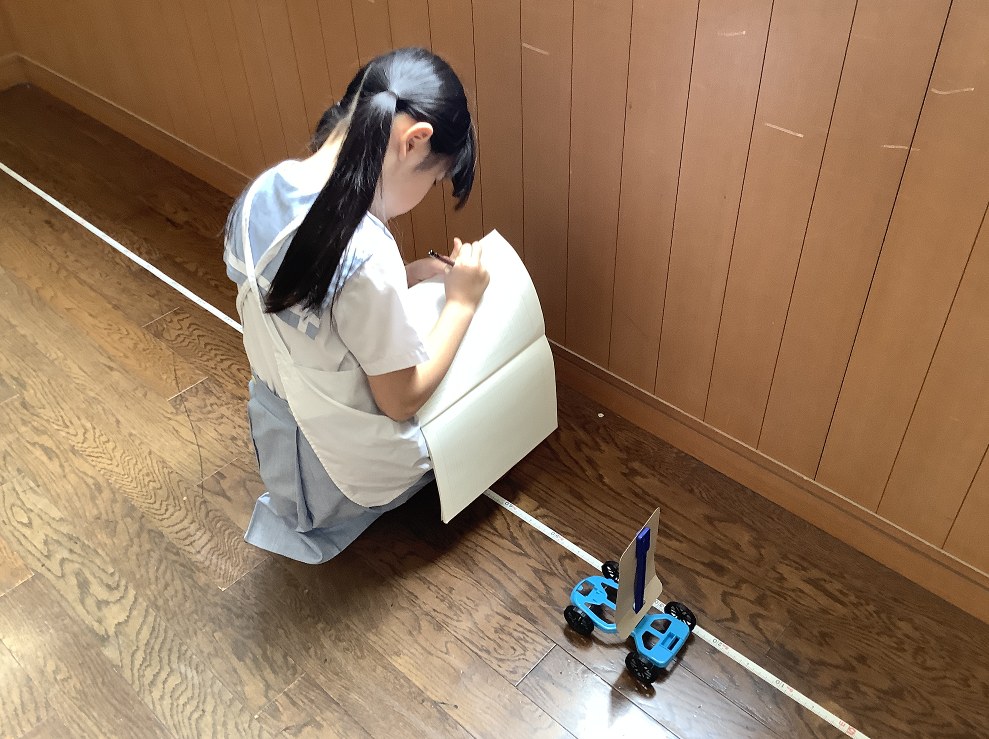 子どもたちは自分で組み立てた車を使って、風の強さによってどのように進み方が変化するのかを確かめました。