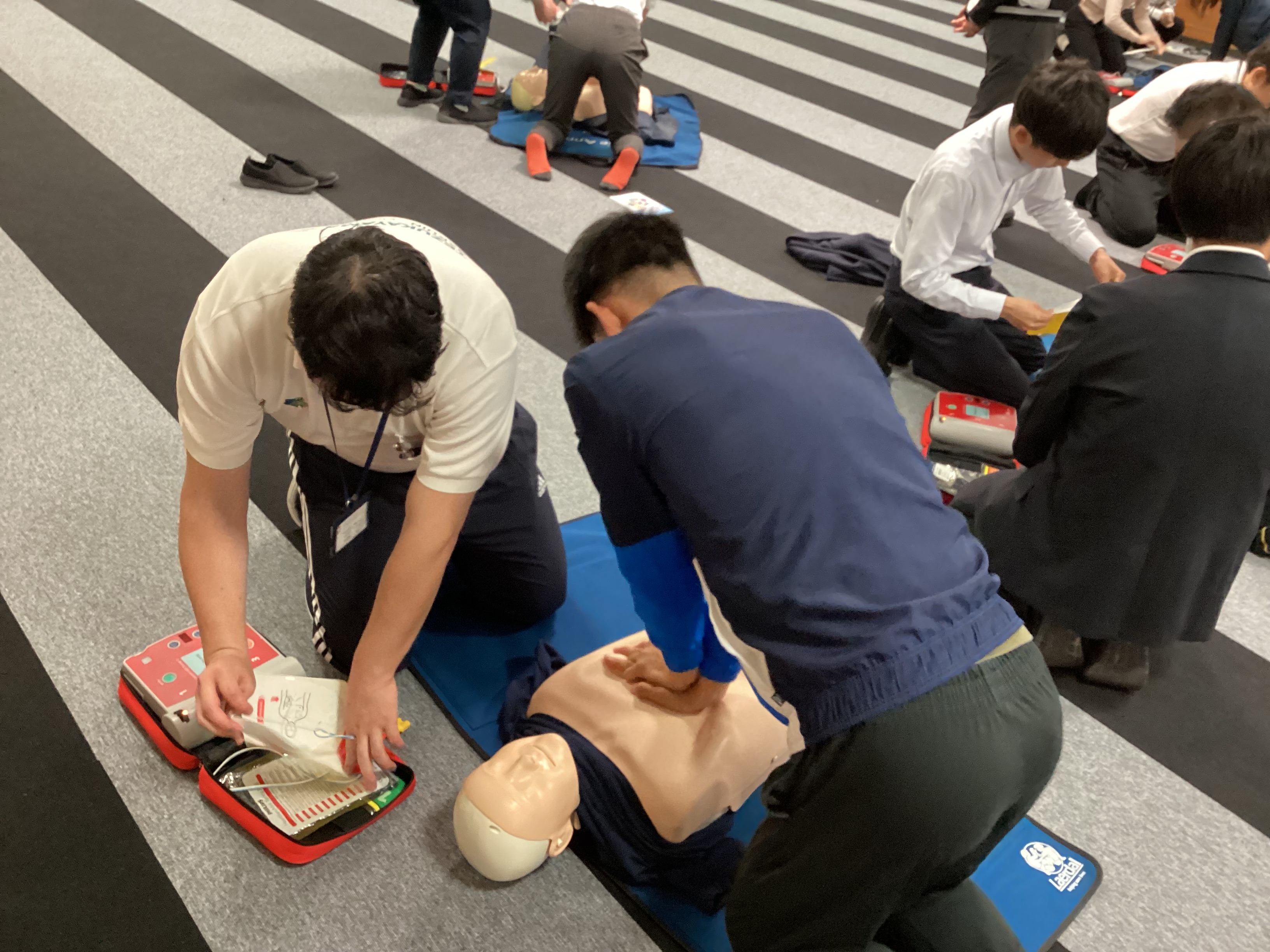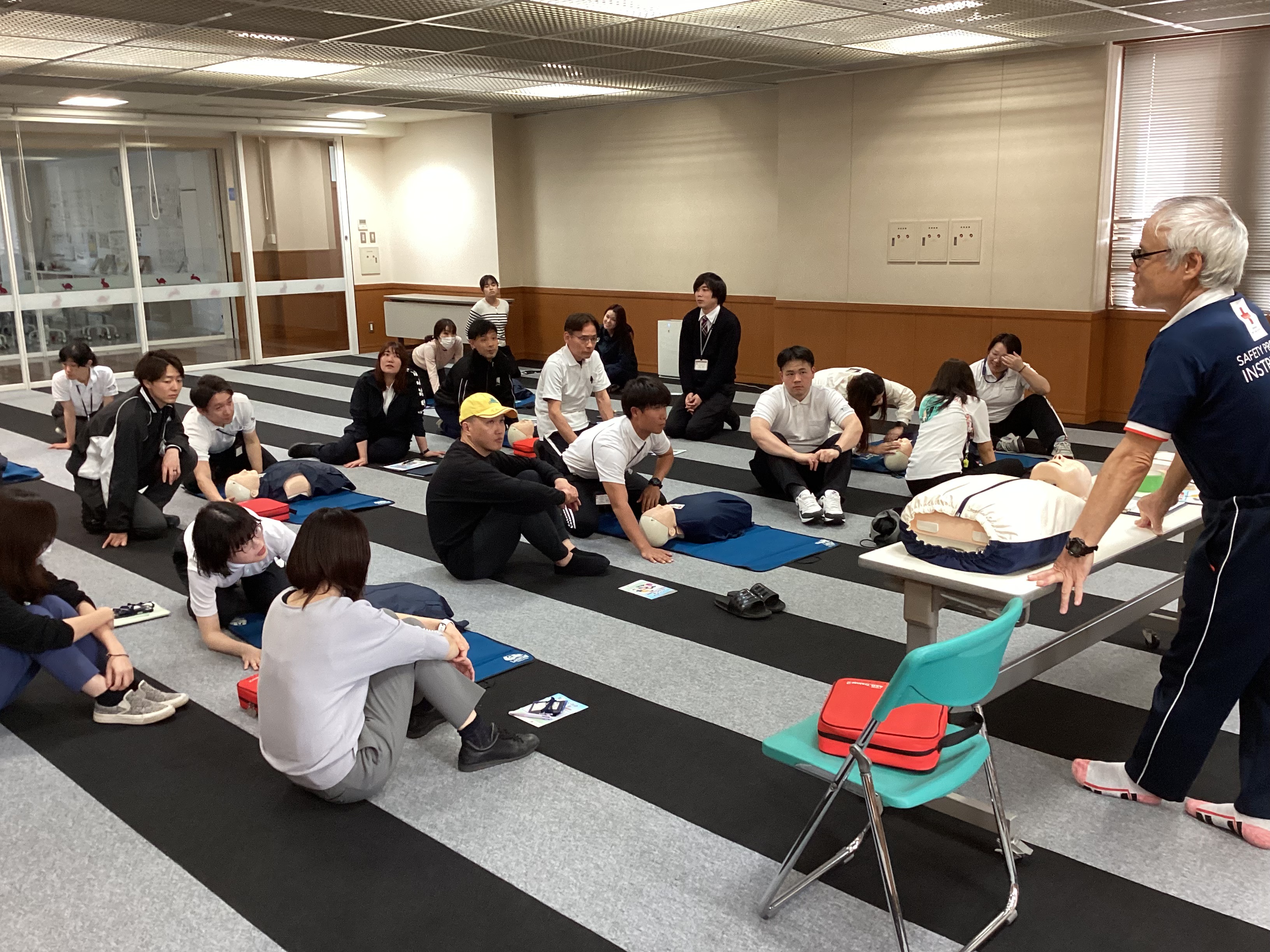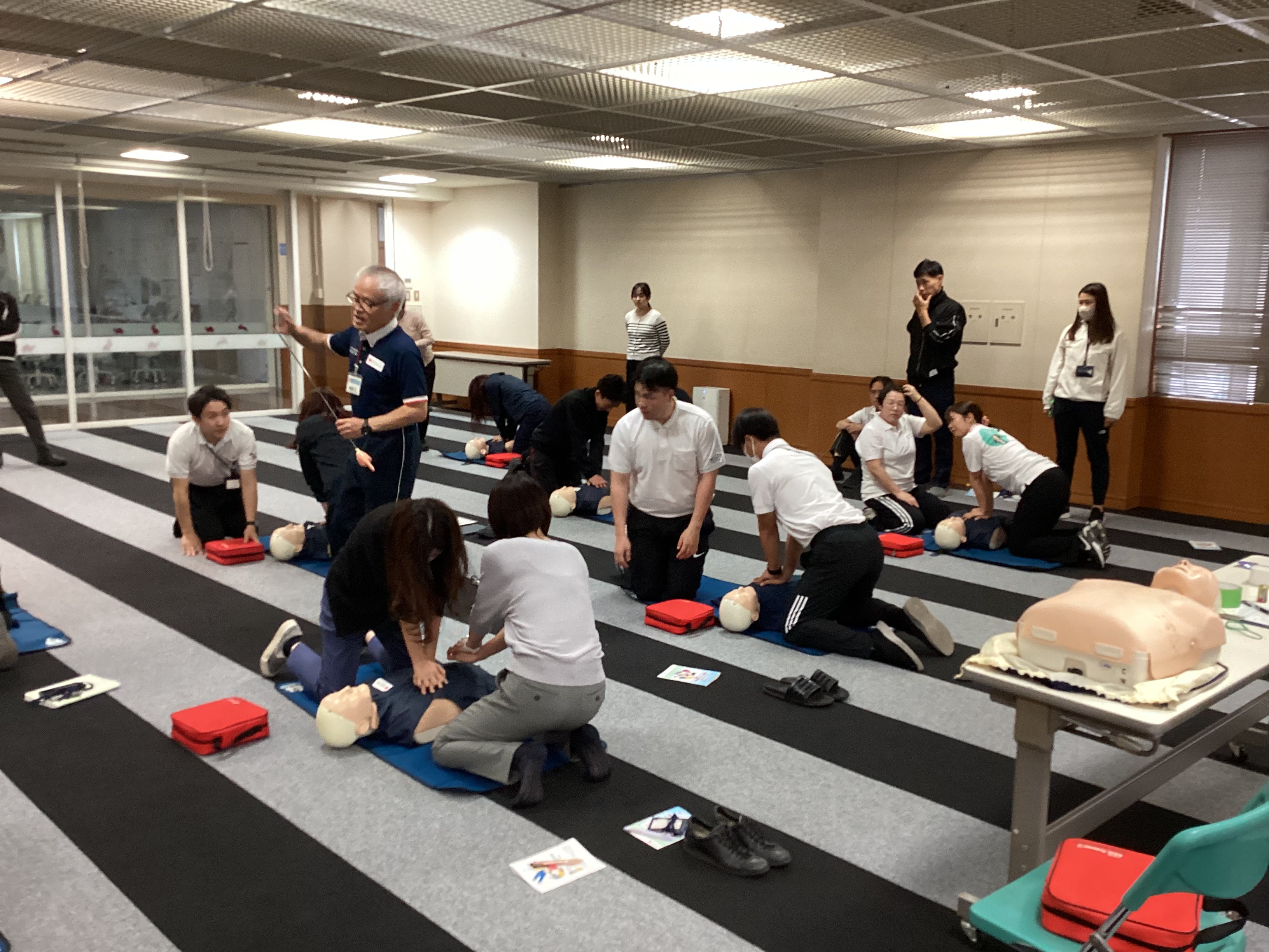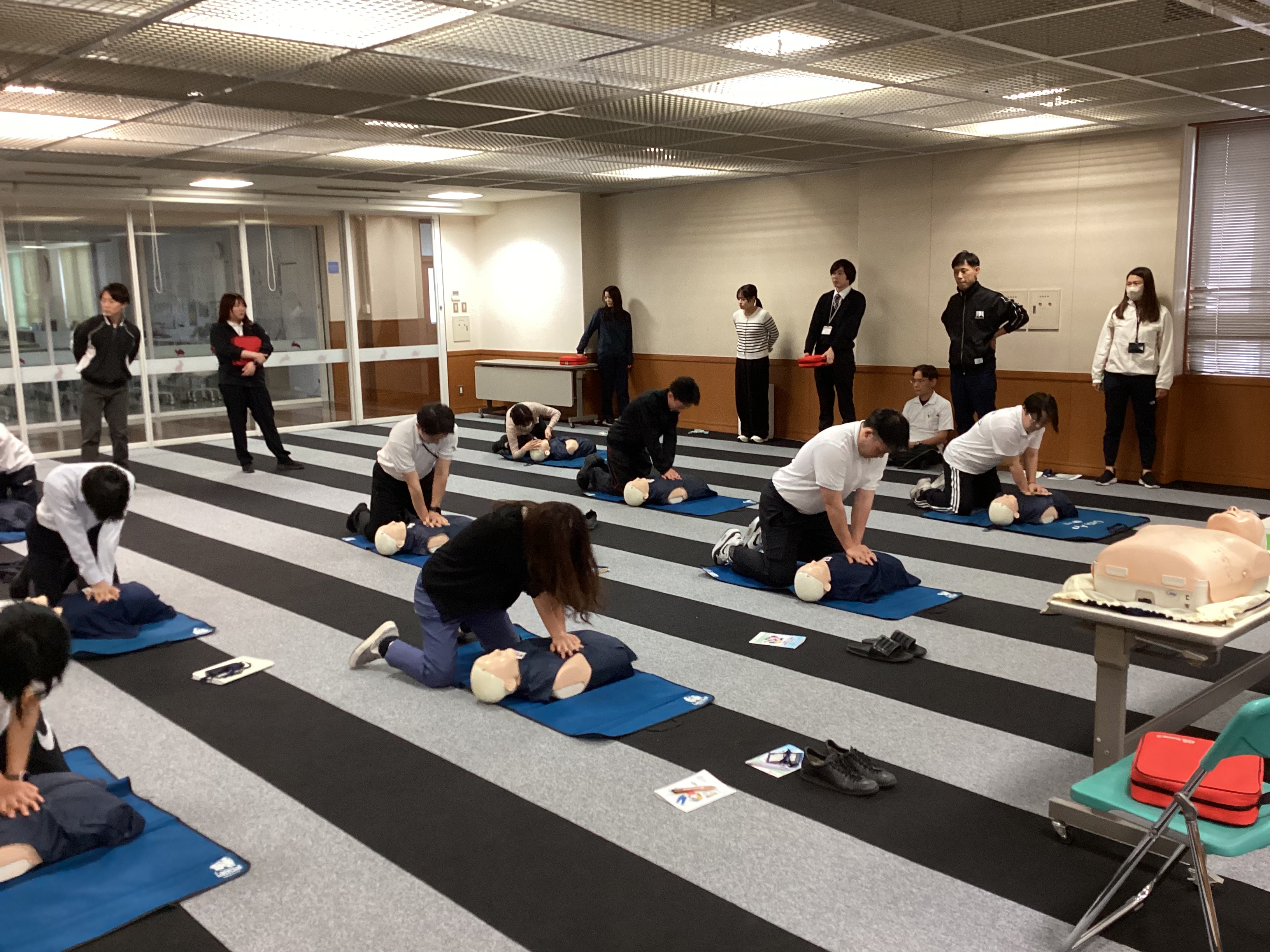 本日は、日本赤十字社の本村様に来ていただき、一次救命処置についての講義と実技研修を行いました。