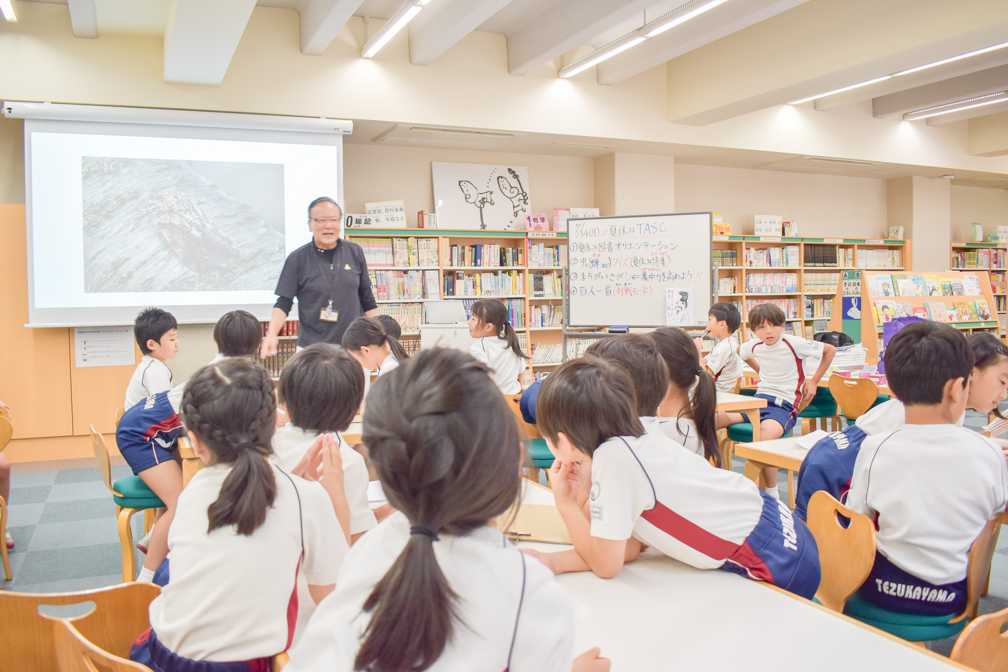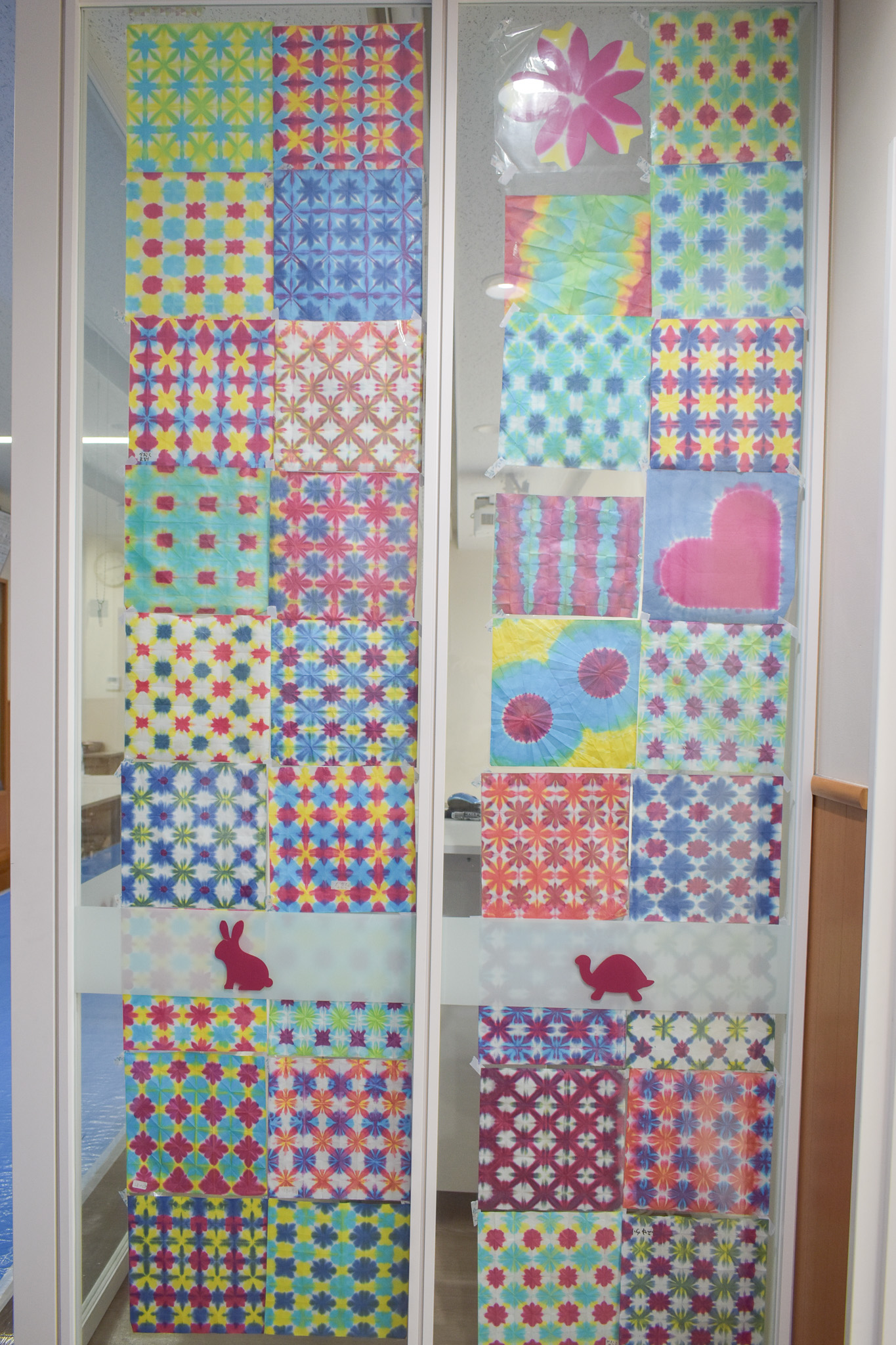 子どもたちがつくった折り染めの一部は2階のイノベーションルームに飾っています。