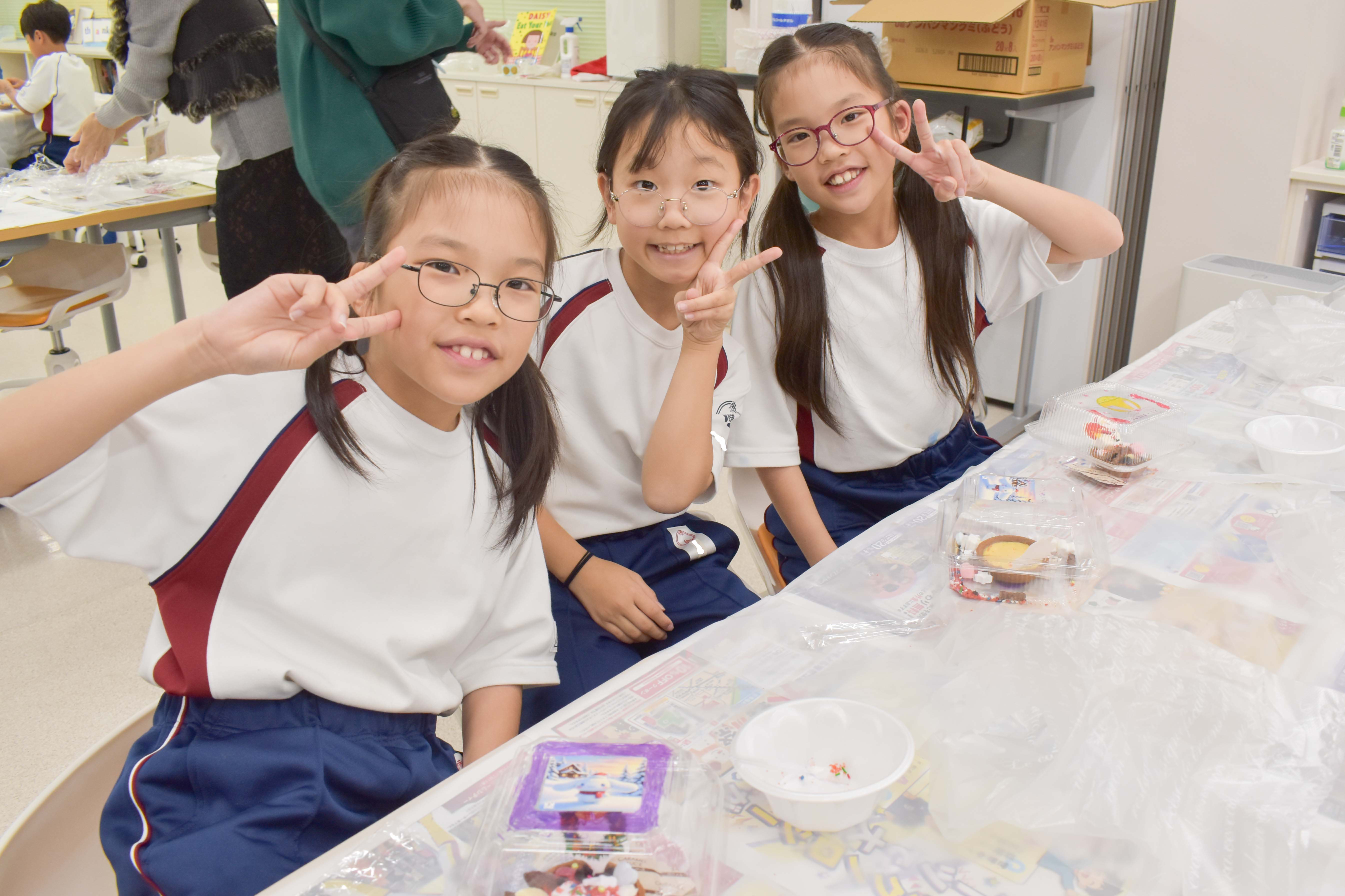 タルトデコレーションでは容器に好きな絵を描いたりシールを貼ったり、タルトに可愛いお菓子で飾り付けを行いました。