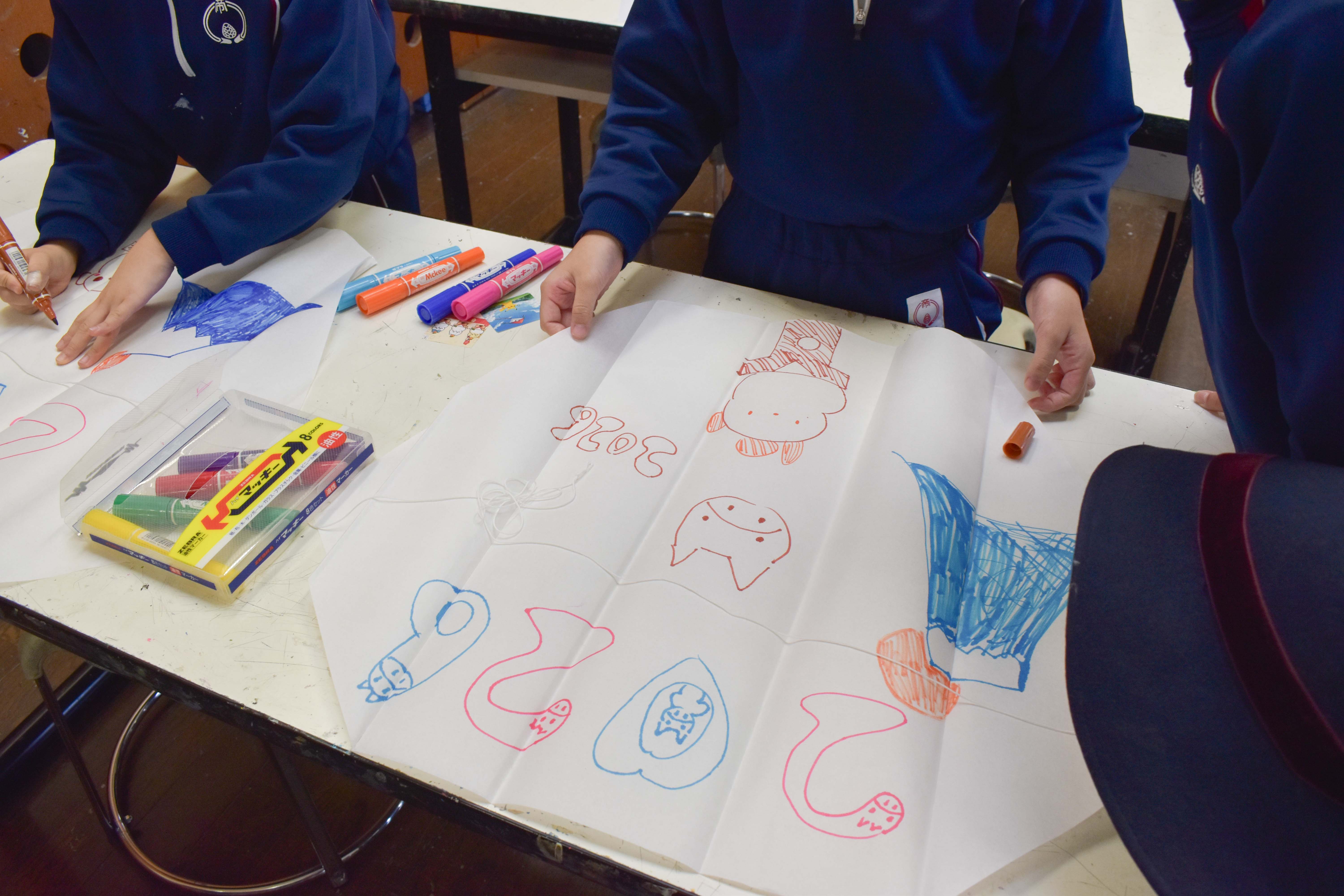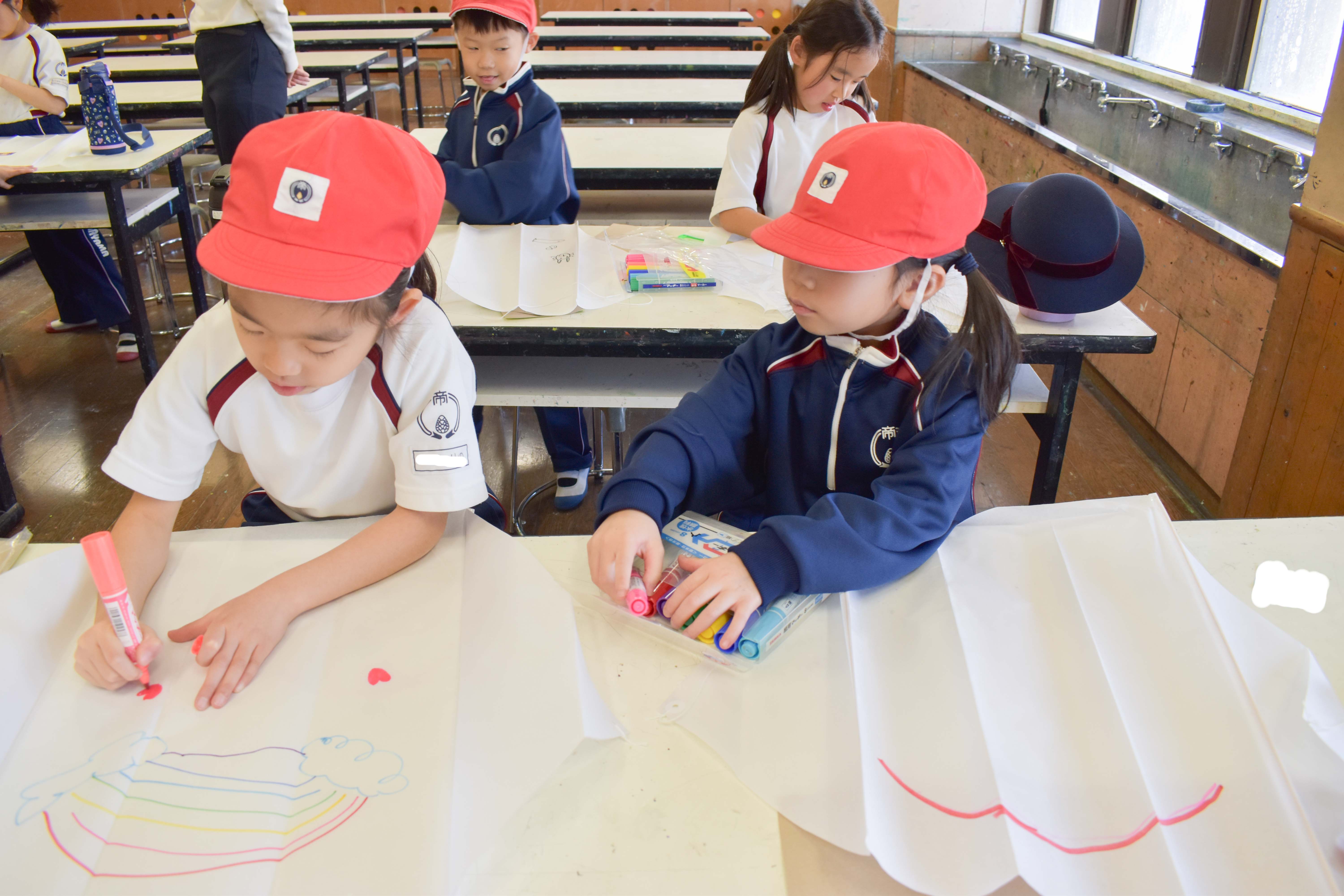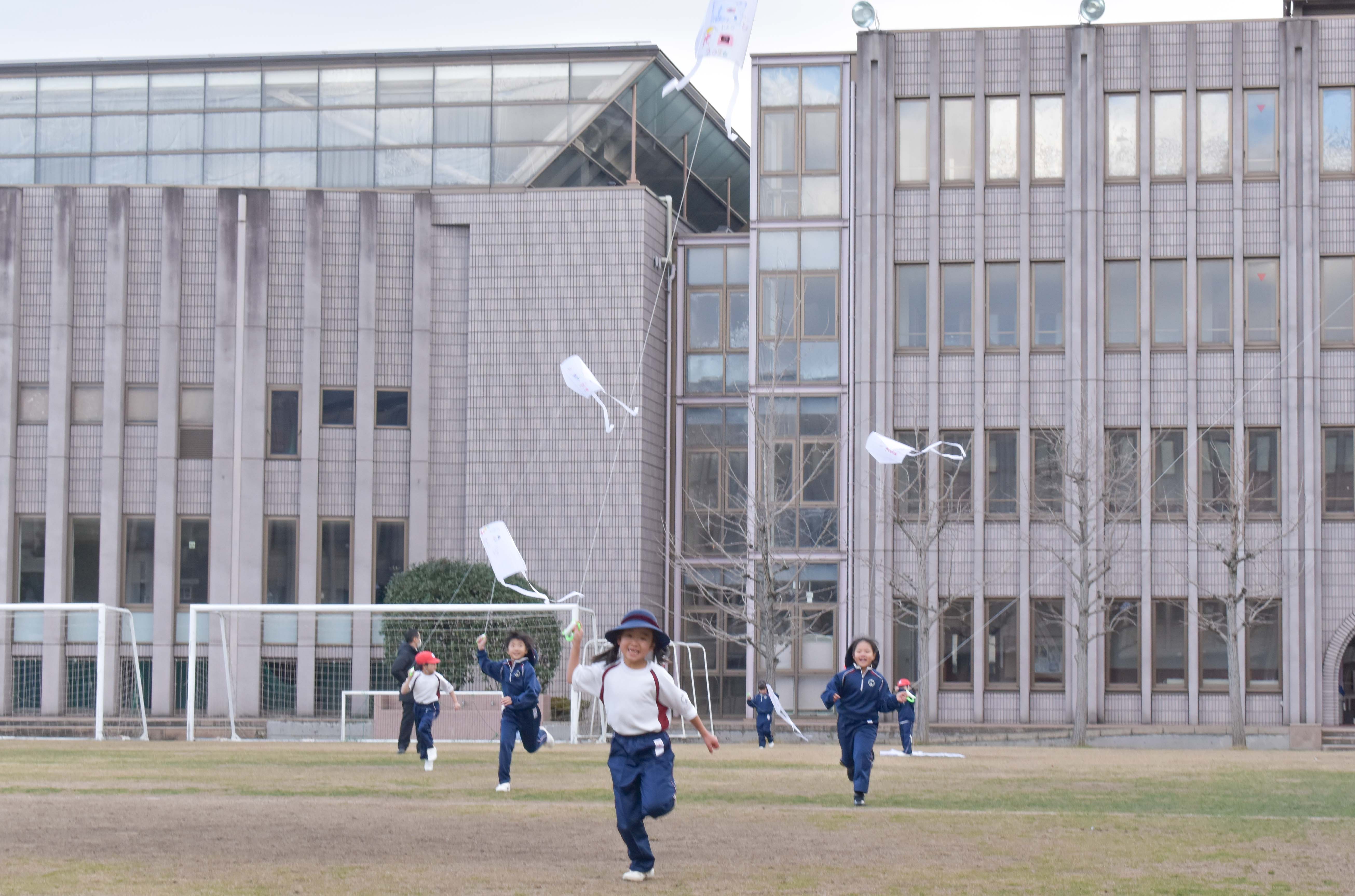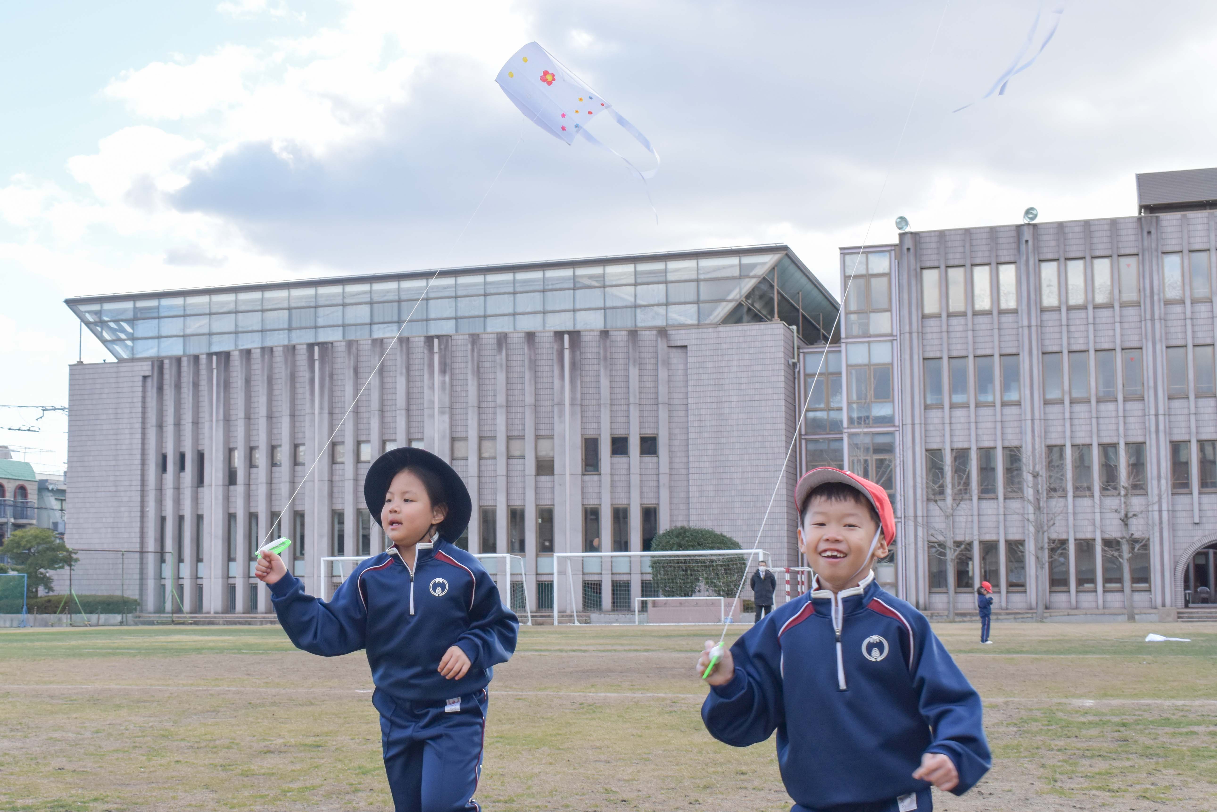 まずは凧に好きなように絵を描き、そのあとに運動場で凧あげをしました。