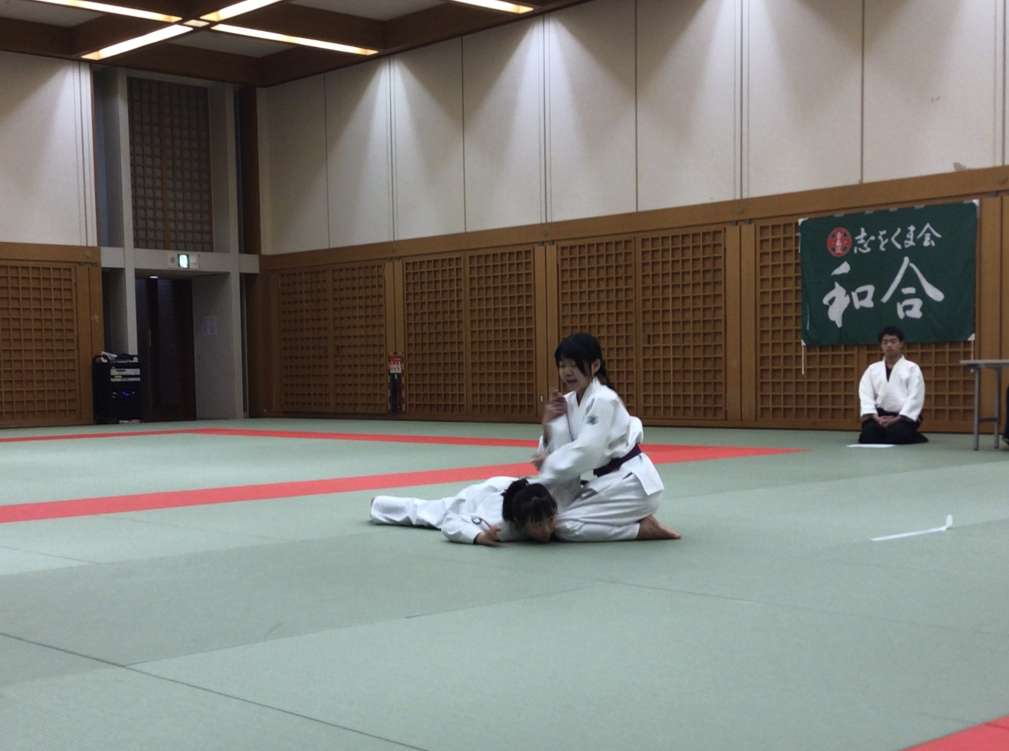 2月1日(日)の審査に引き続き、2月2日(月)から2月6日(金)も早朝練習に臨んだ合氣道部員は、2月7日(土)に大阪市立中央体育館で、第15回志をくま会合氣道大会に参加しました。到着してから始まるまでに時間があったので、膝行じゃんけんでウォーミングアップをしました。そして、1組ずつ演武を発表していきました。どのペアも気合十分、迫力のある技を披露することができました。