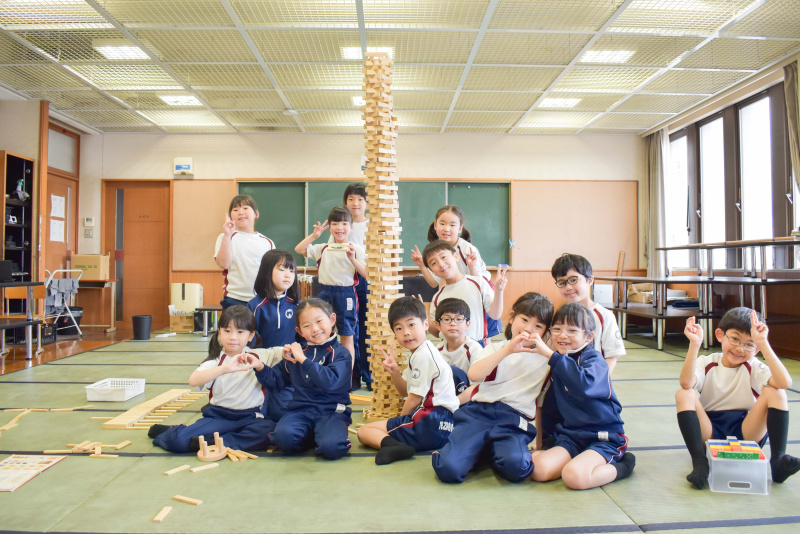 中でも1年生は身長よりずっとずっと高いカプラのタワーを見せてくれました。みんなで力を合わせて作った大作を見上げ、子どもたちみんな嬉しそうにしていました。
