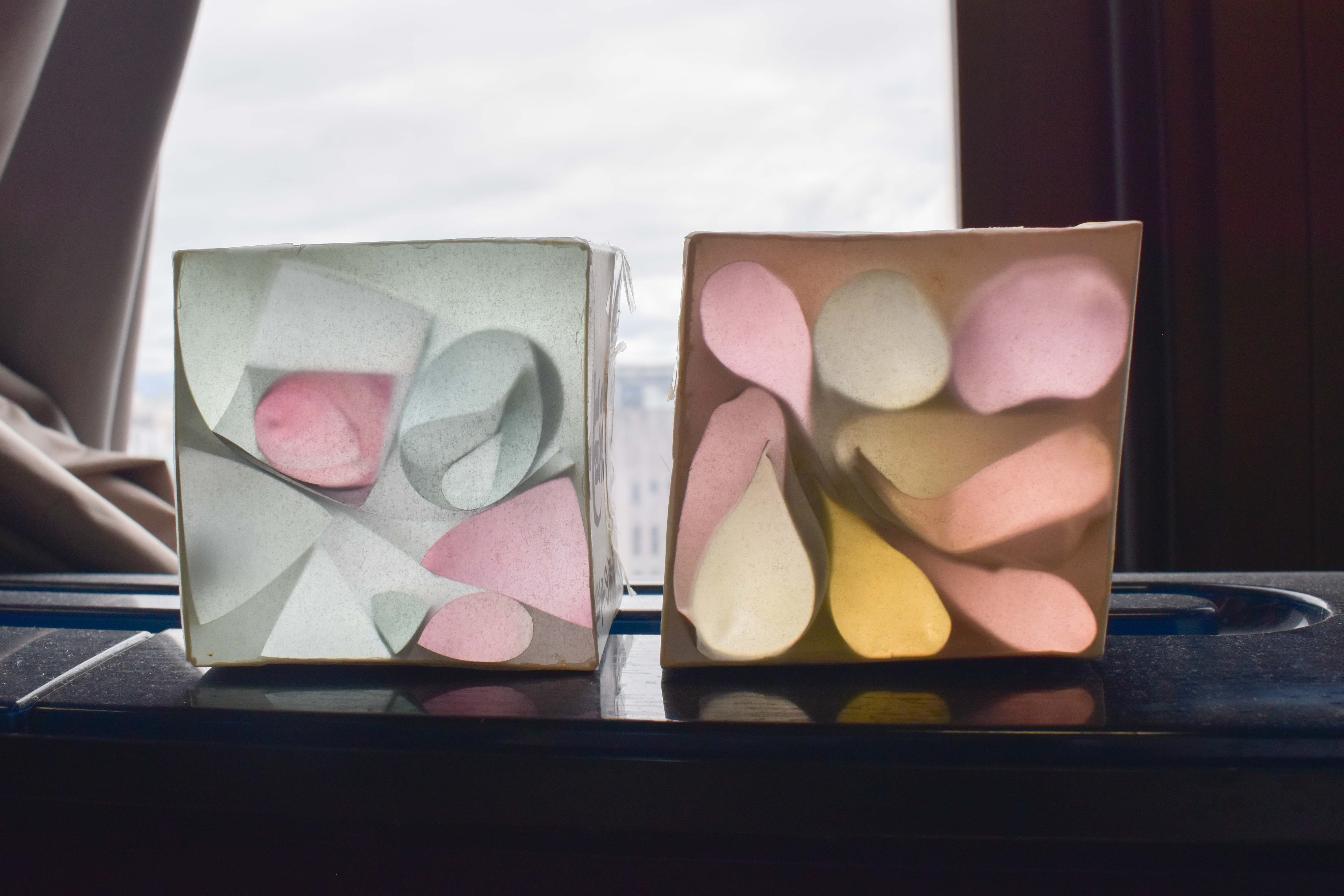 銀テープをハートや円などの形に曲げて牛乳パックに入れ、透明のフィルムを貼ります。