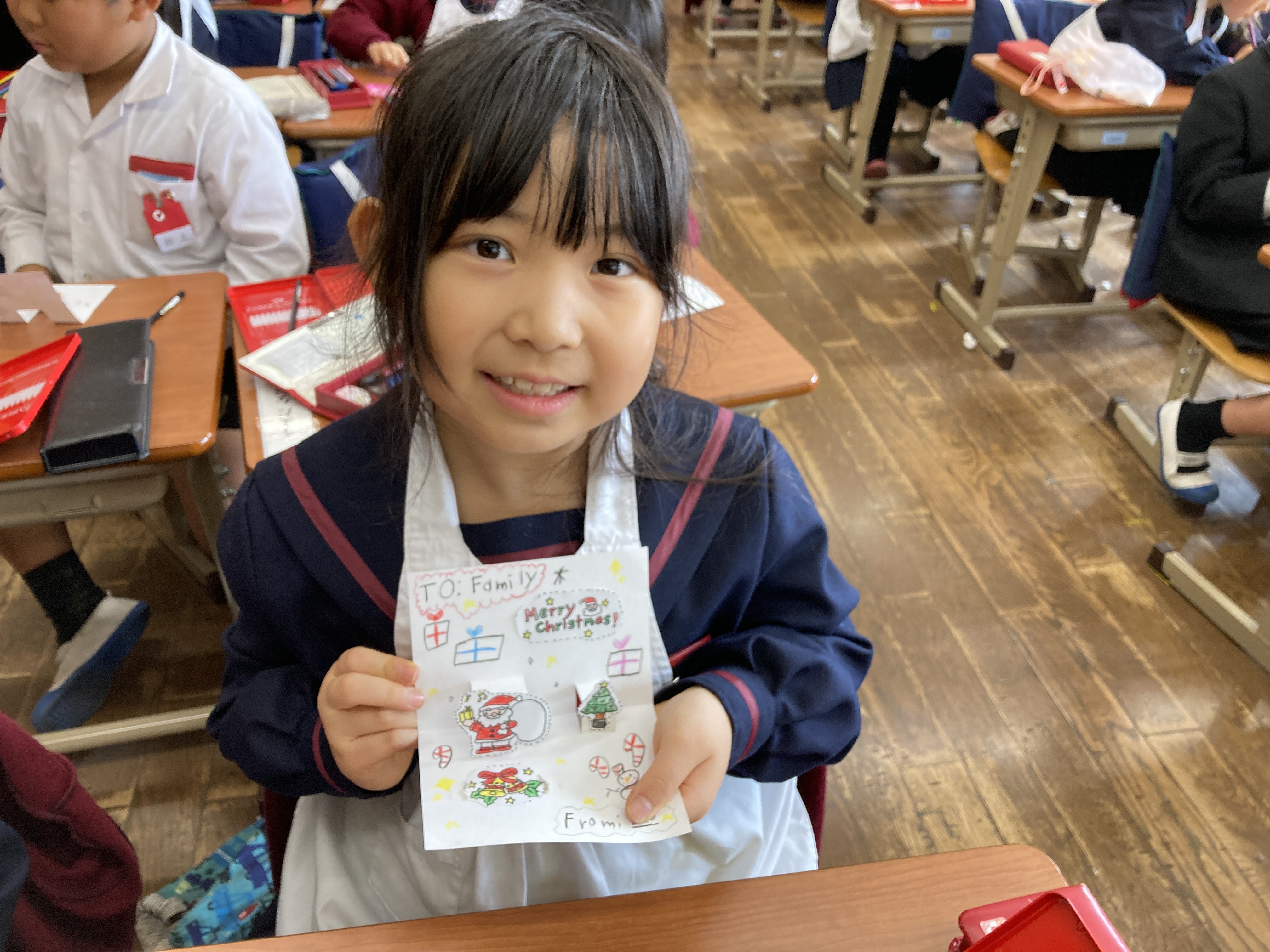 英語科では毎年1年生から4年生の児童が2学期の英語の最終授業でクリスマスカードを作成しています。