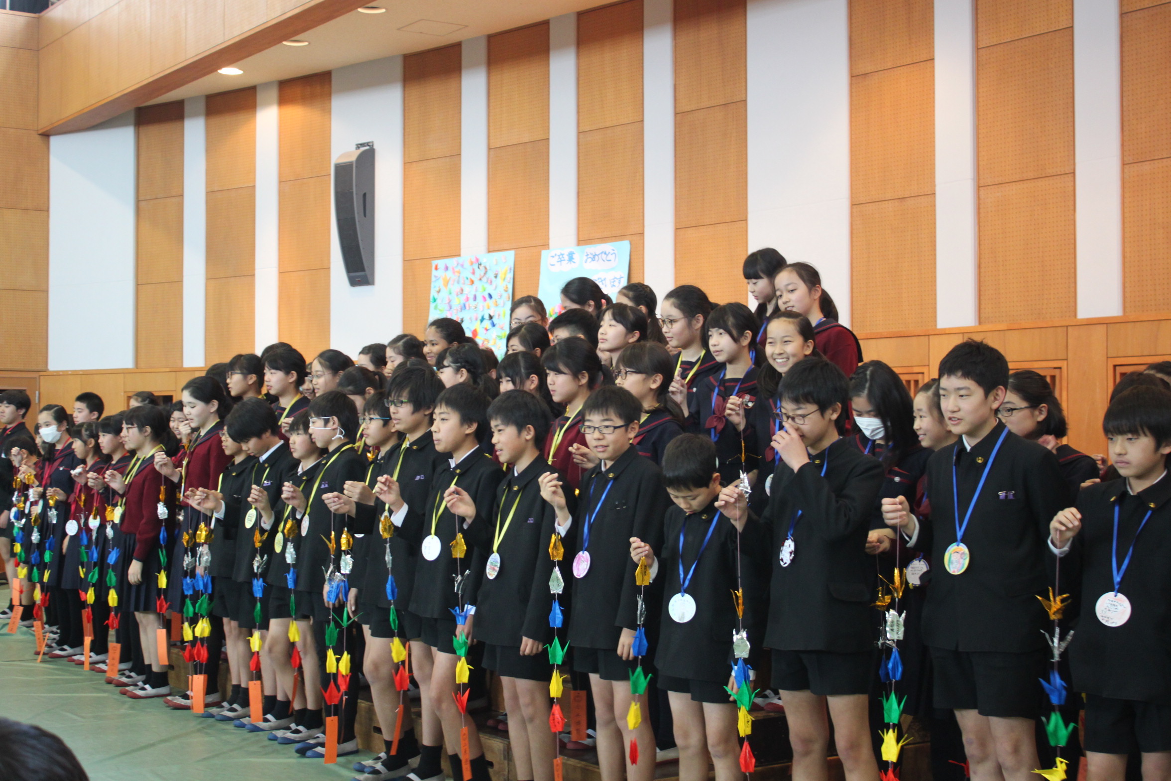 送る会の最後には1年生から5年生までがこの日の為に、心を込めて作った折鶴を6年生にプレゼントしました。