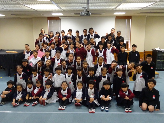 その後、給食場で「祝賀の集い」があり、軽食を食べながら、各クラスの歌を聞いたり、