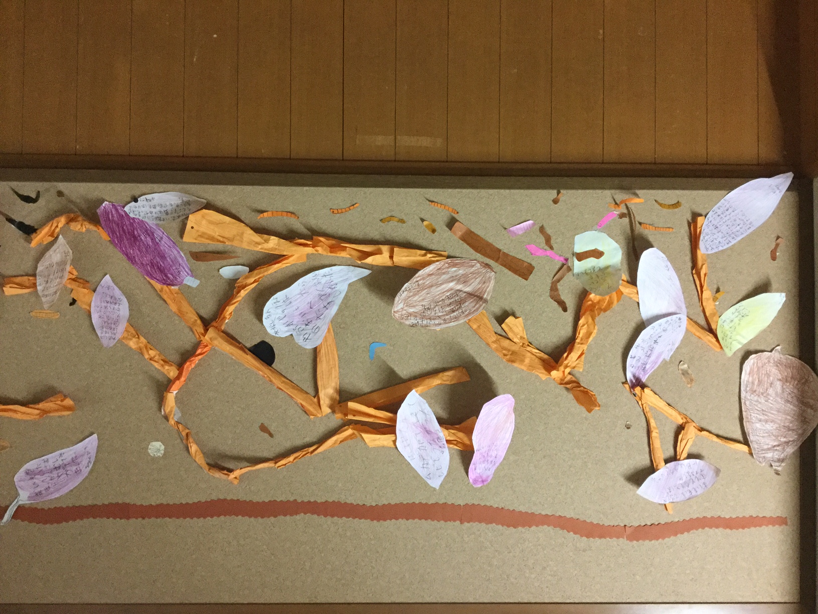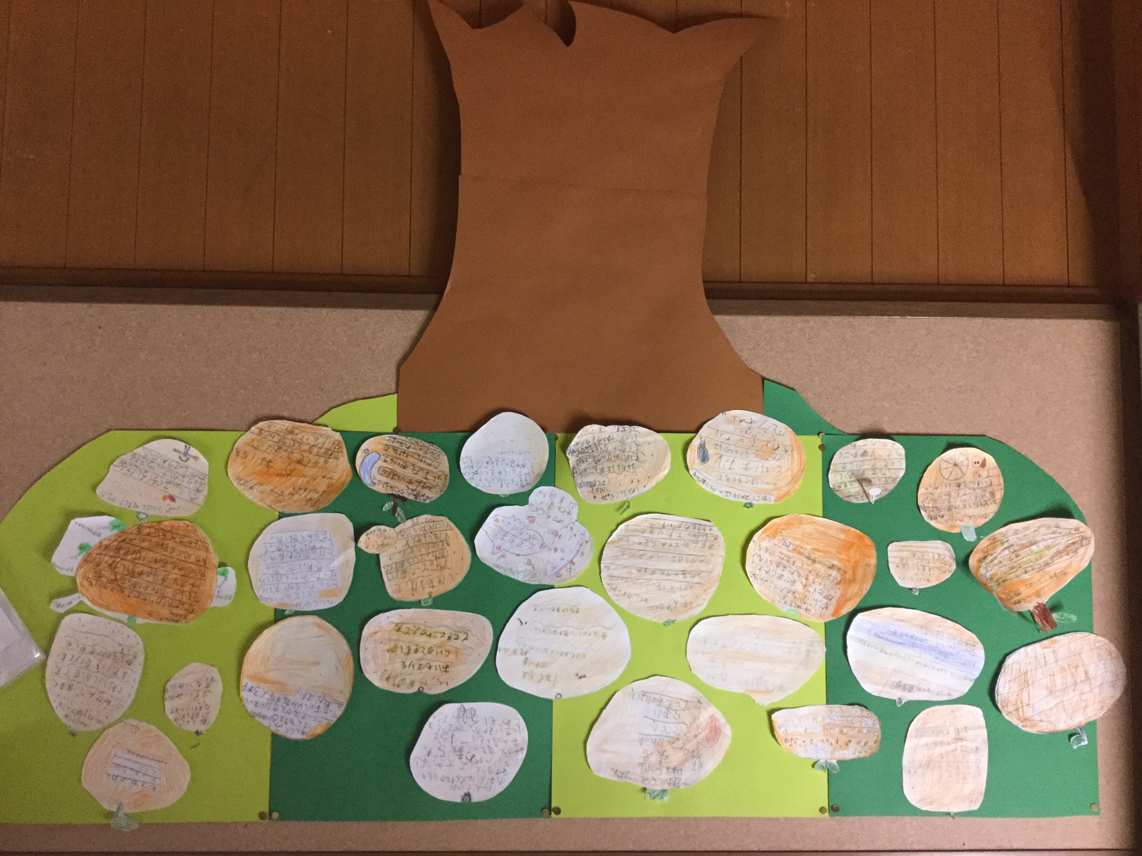その時の思い出を、みかんやお芋の形に切った紙に書いて、教室前に掲示しています。