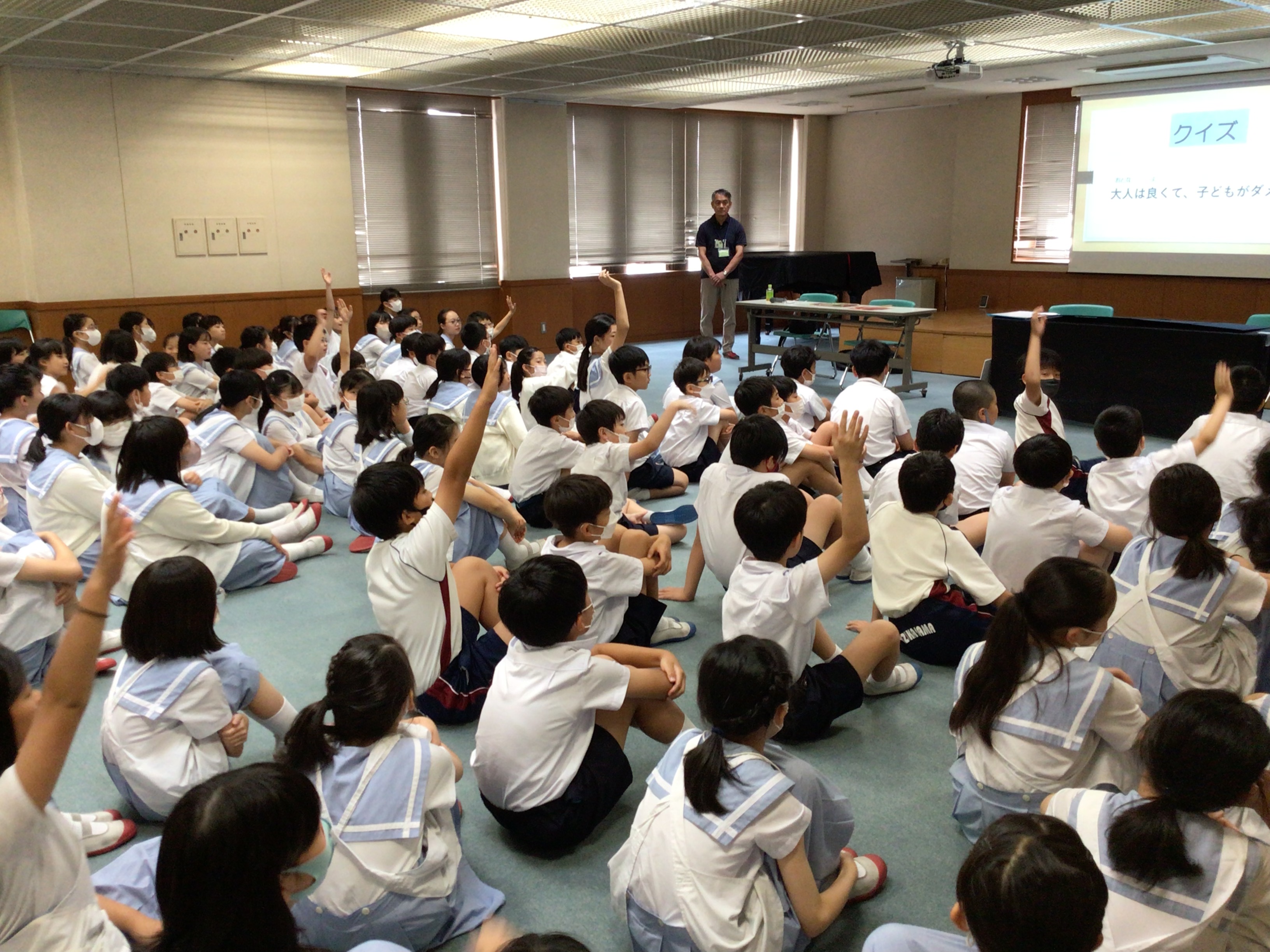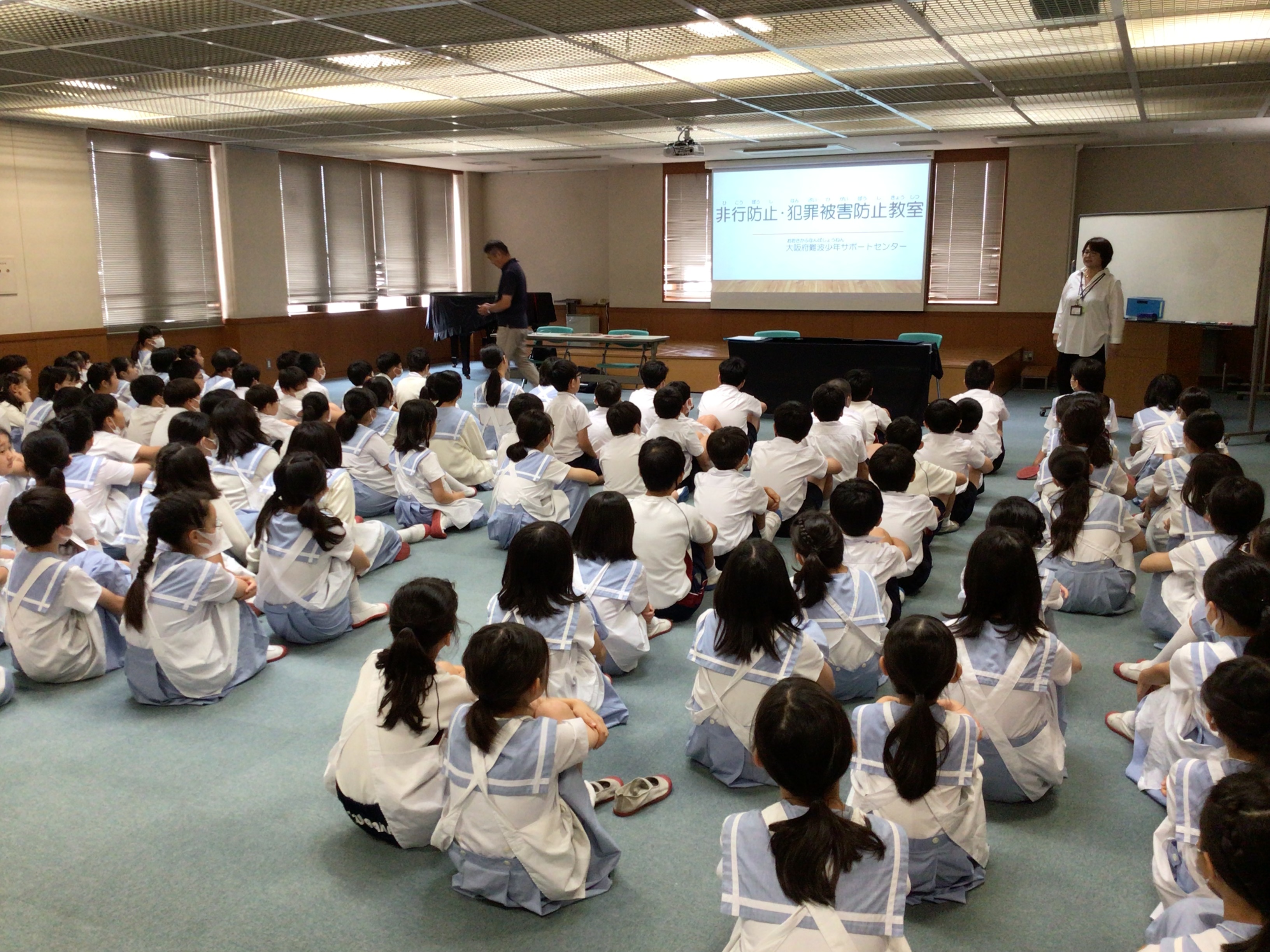 5年生では夏休みに入る前に、非行防止•犯罪防止教室を行いました。なんばサポートセンターの方が、非行のはじまりである万引きについて劇でわかりやすくお話ししてくださったり、身近な犯罪についてのお話をしてくださいました。