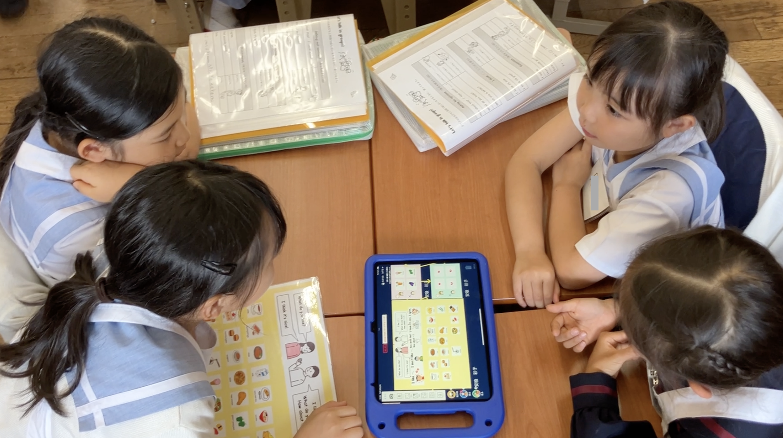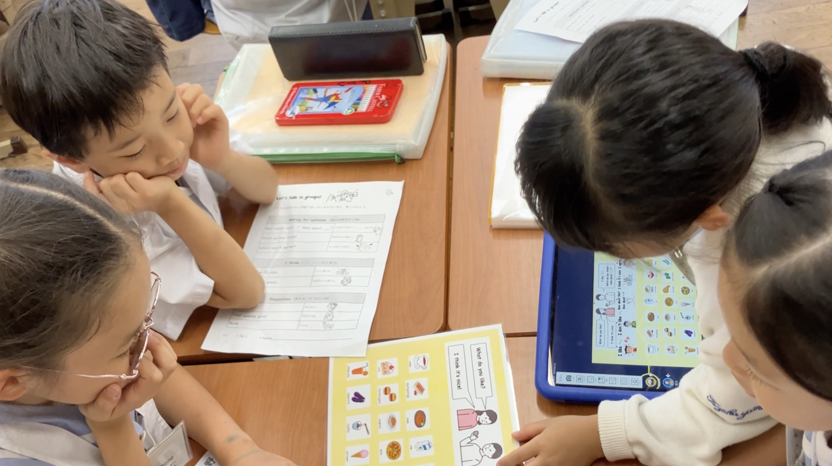 帝塚山学院小学校では恊働学習を進めており、今回2年生では初めて「英語で意見を出しあう」ということを目標としてグループでオリジナルのI like songを作る活動を行いました。