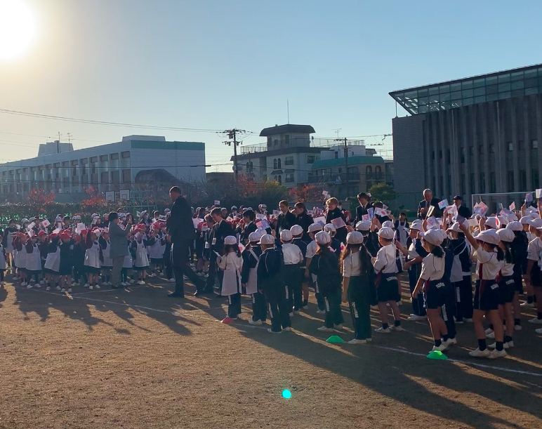 高学年は拍手で、1、2年生がオーストアリアと日本の旗を振ってTASの児童を歓迎しました。