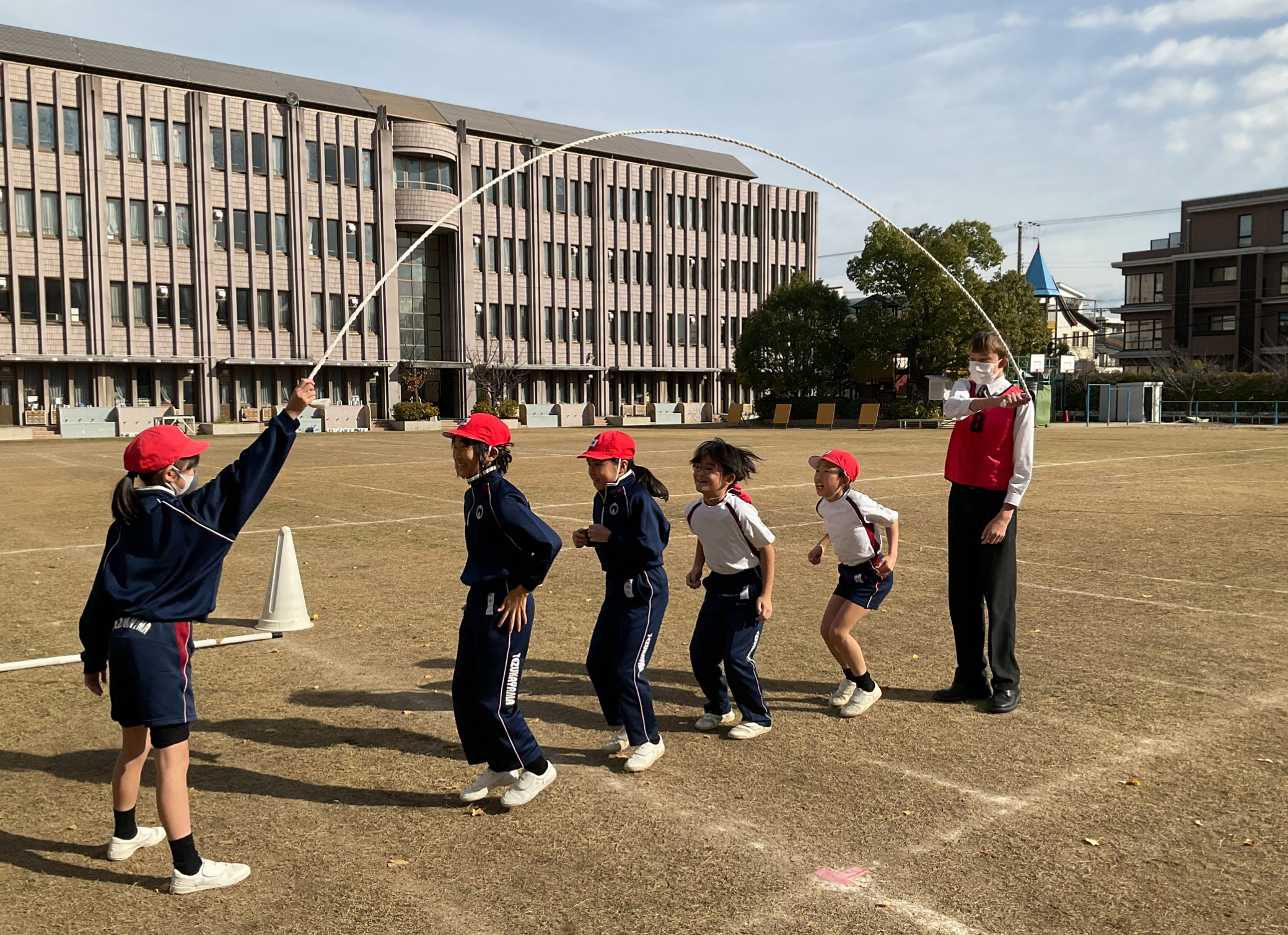 アーミデイルの子どもたちが体育の授業に参加してくれる!ということで、みんなで体育大会で行われていた、他学年の団体行事(+大なわ)に取り組みました。