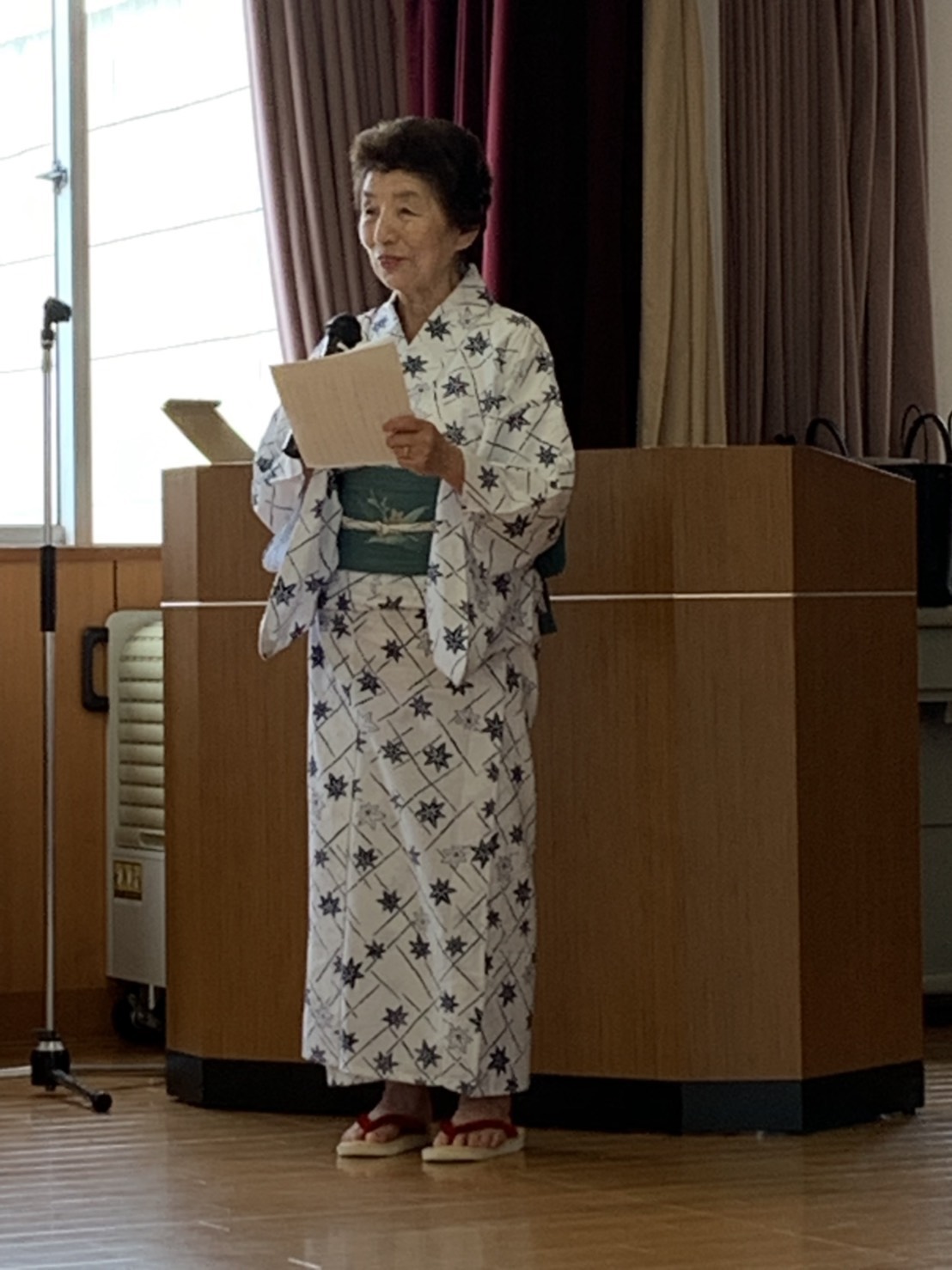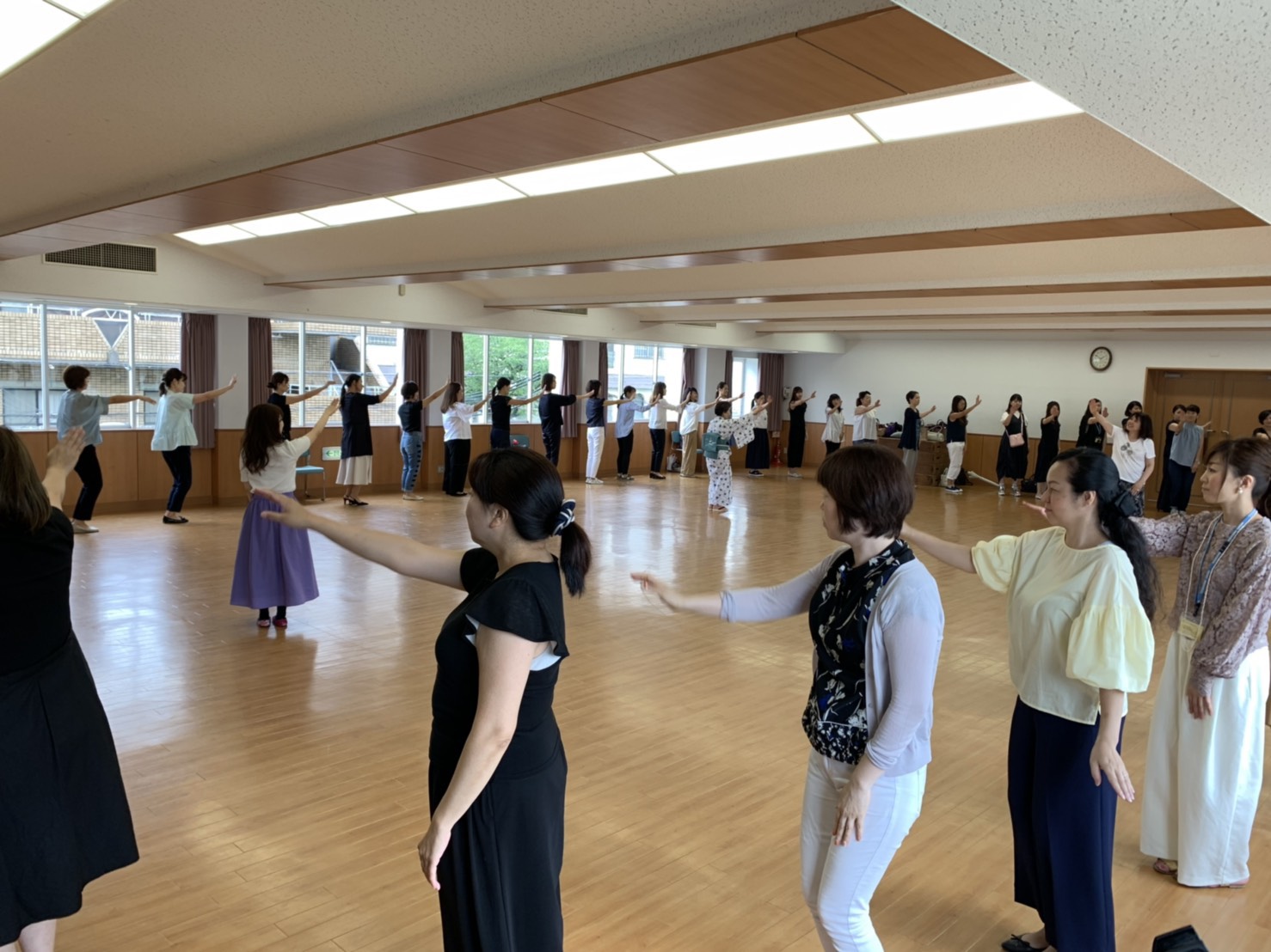 林 早苗先生にお越し頂き、まず「帝塚山学院音頭」と「七夕おどり」の由来についてお話しがありました。続いての踊りの練習は、手の動きや視線など細かなところまで丁寧にご指導をいただきました。