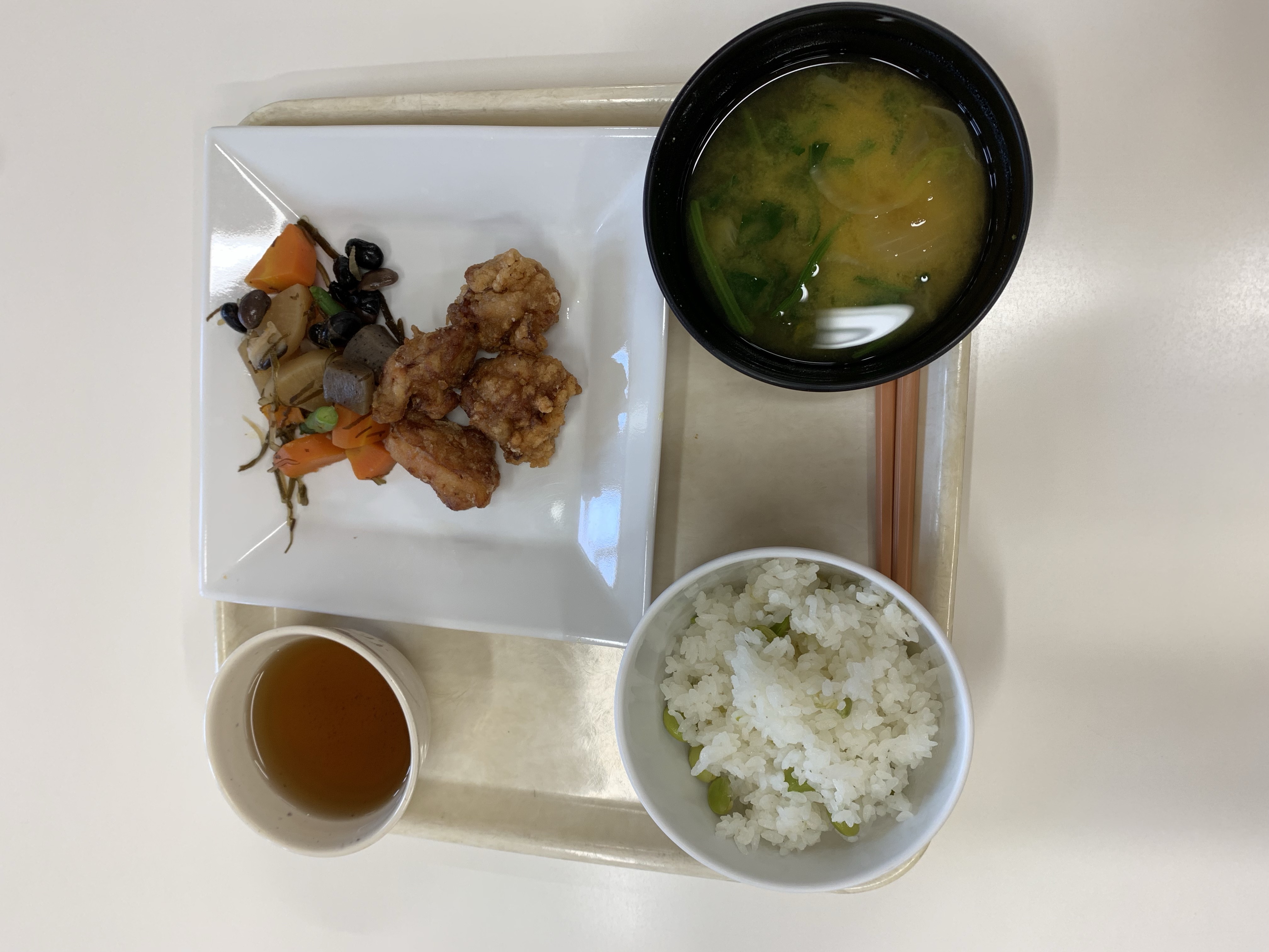 枝豆ごはん、鶏の唐揚げ、こくしょう煮、味噌汁