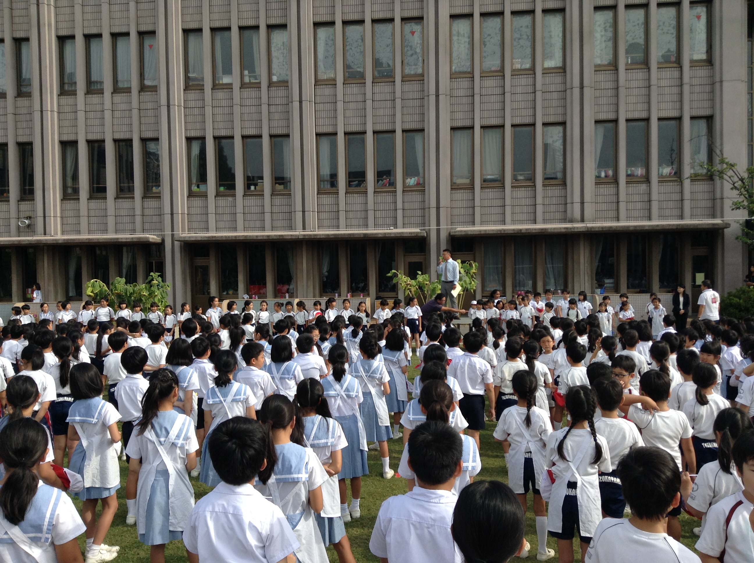 芝生のグランドには、毎年秋になると沢山のトンボが飛んでいます。 朝礼では全校児童で空を見上げ、秋空への変化を感じました。