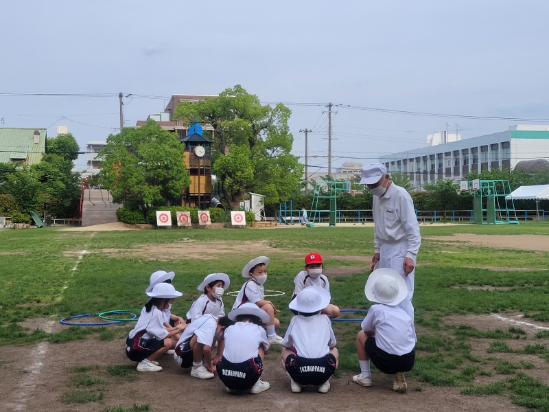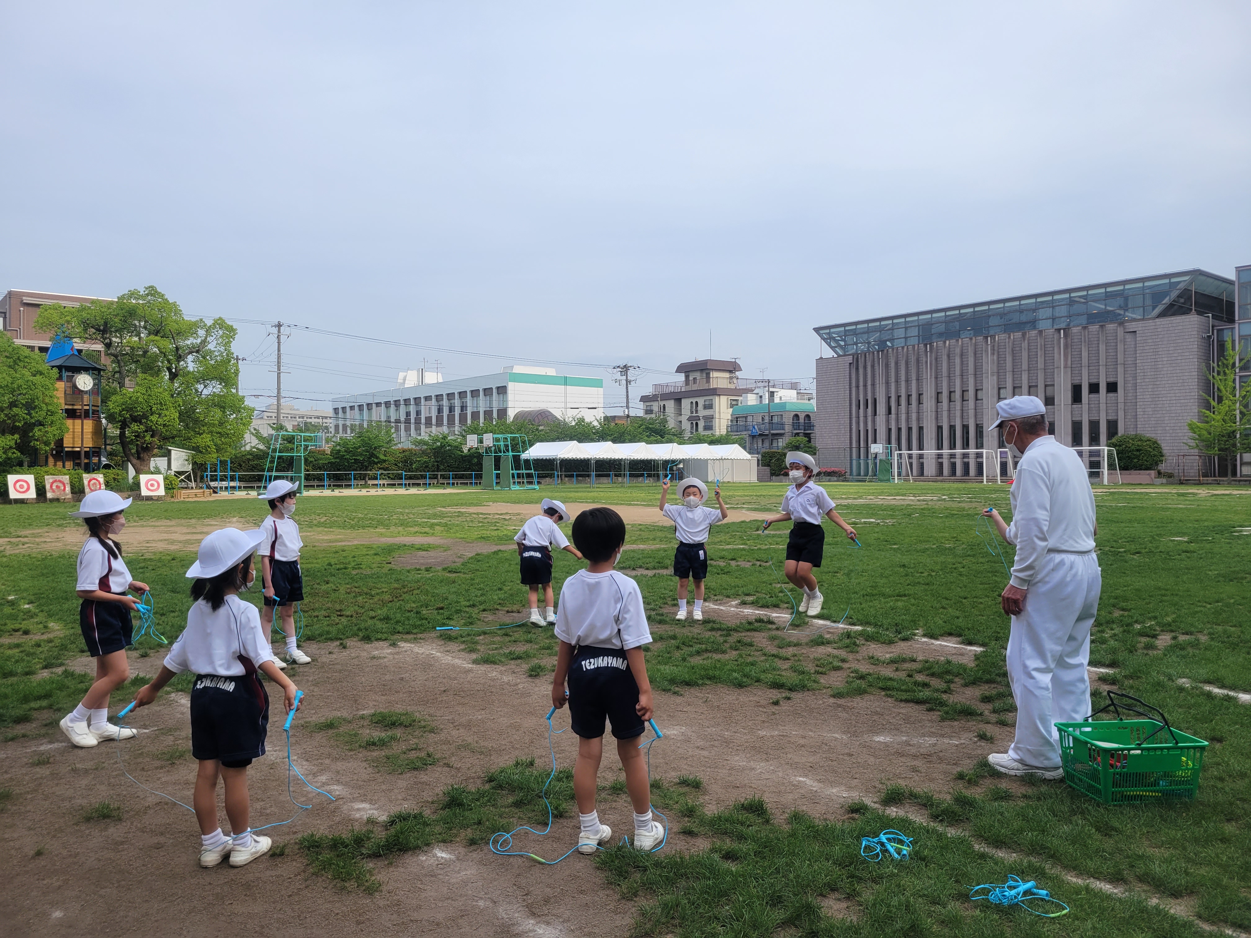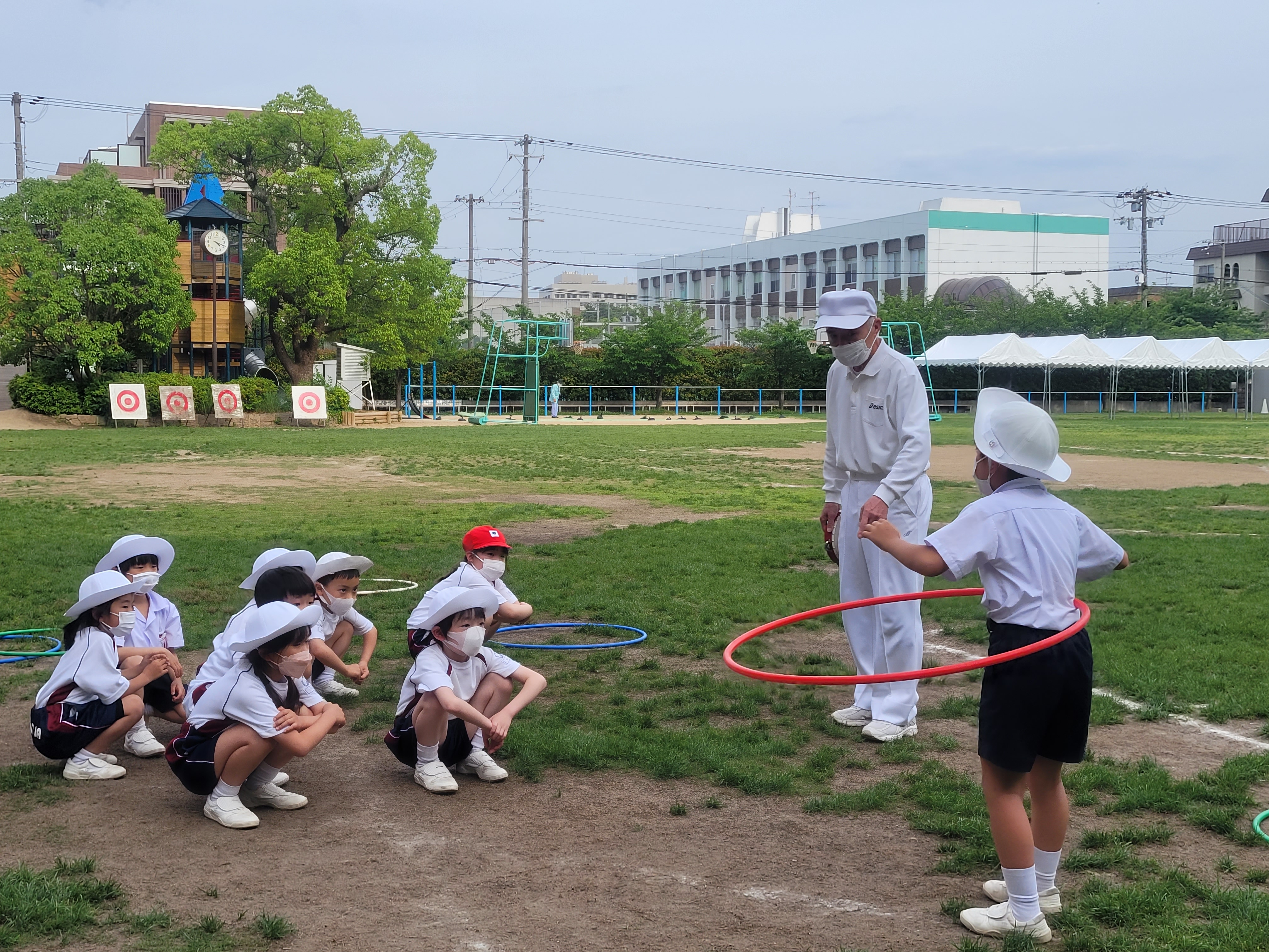 一人ひとりの健康観察をした後、フラフープ、短なわとび、長なわとび、ボール遊び、ゲームなどを50分程度します。途中何度も水分補給をして話し合いをして運動遊びをします。いつも2人組、チームを作り励まし、助け合っています。なわ操作がうまくできない子どもには助言をしています。子どもができたときの表情はにっこりして、できた喜びを体いっぱいに表現します。みんなも大きな拍手を送ります。こうした体験は子どもの大きな自信になります。