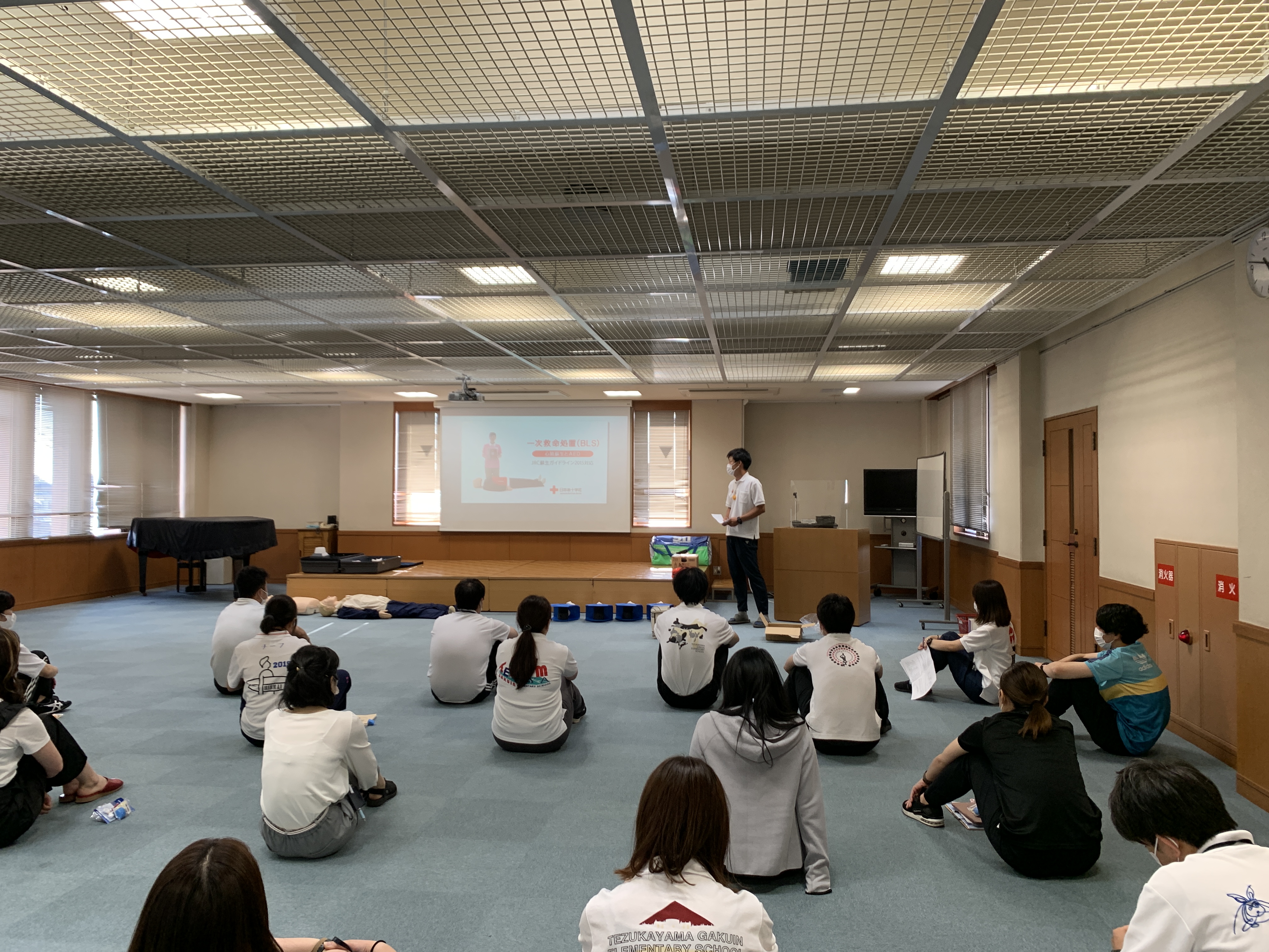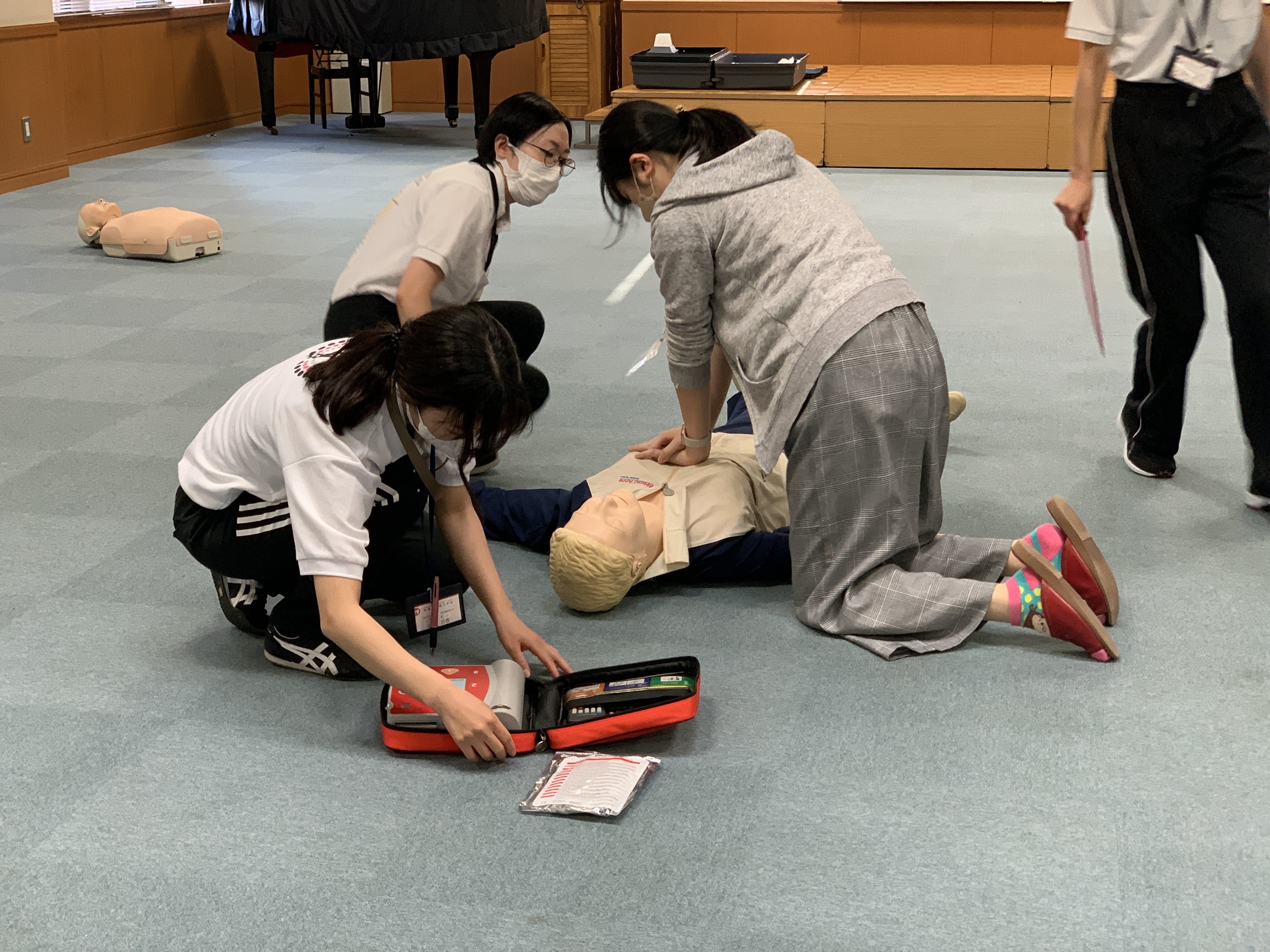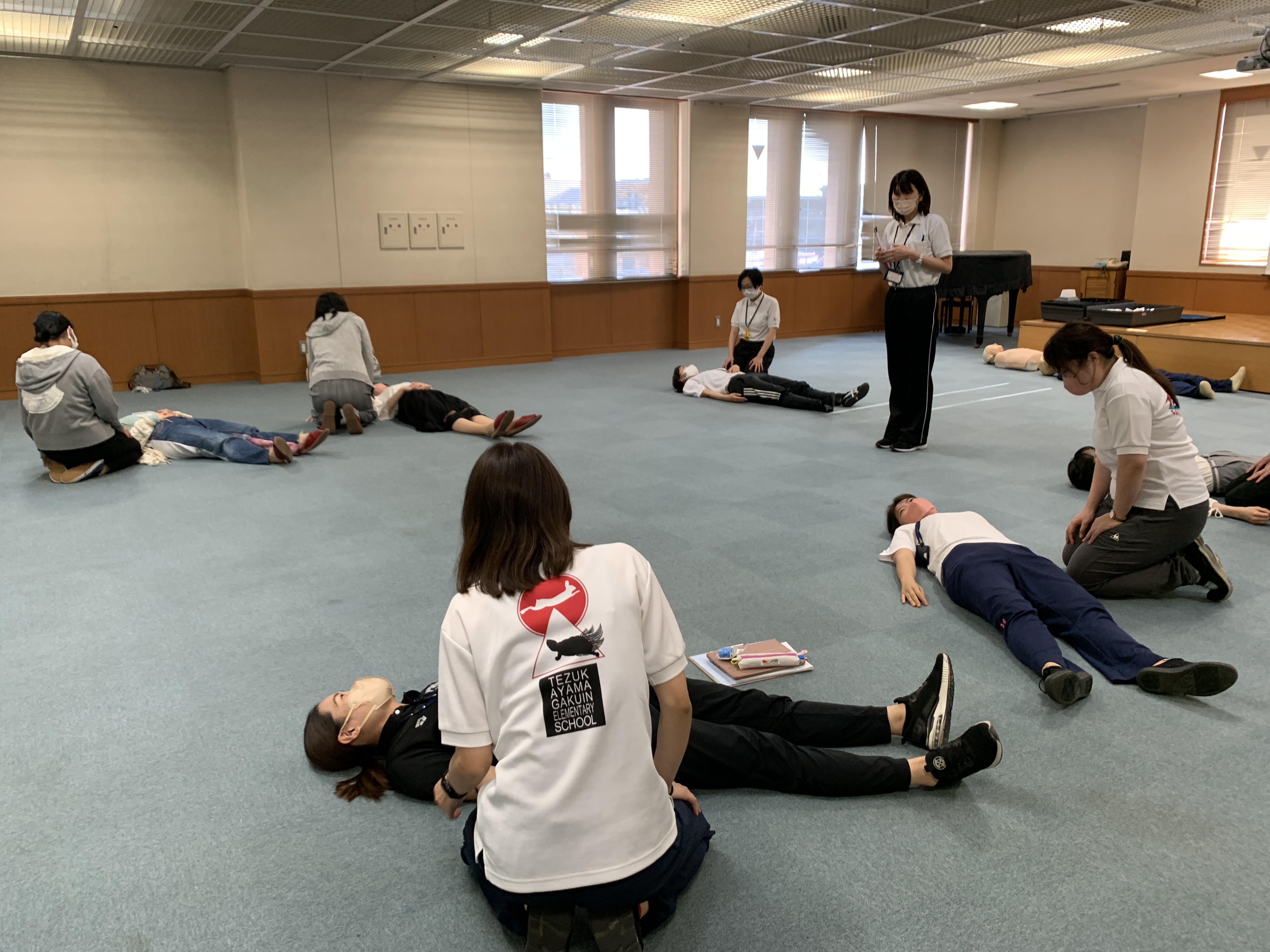 主に一次救命を取り扱い、万が一の事態に備え、各自の動きを迅速にするための研修です。基本の救命処置に加え、コロナ禍においてのガイドラインを確認しました。