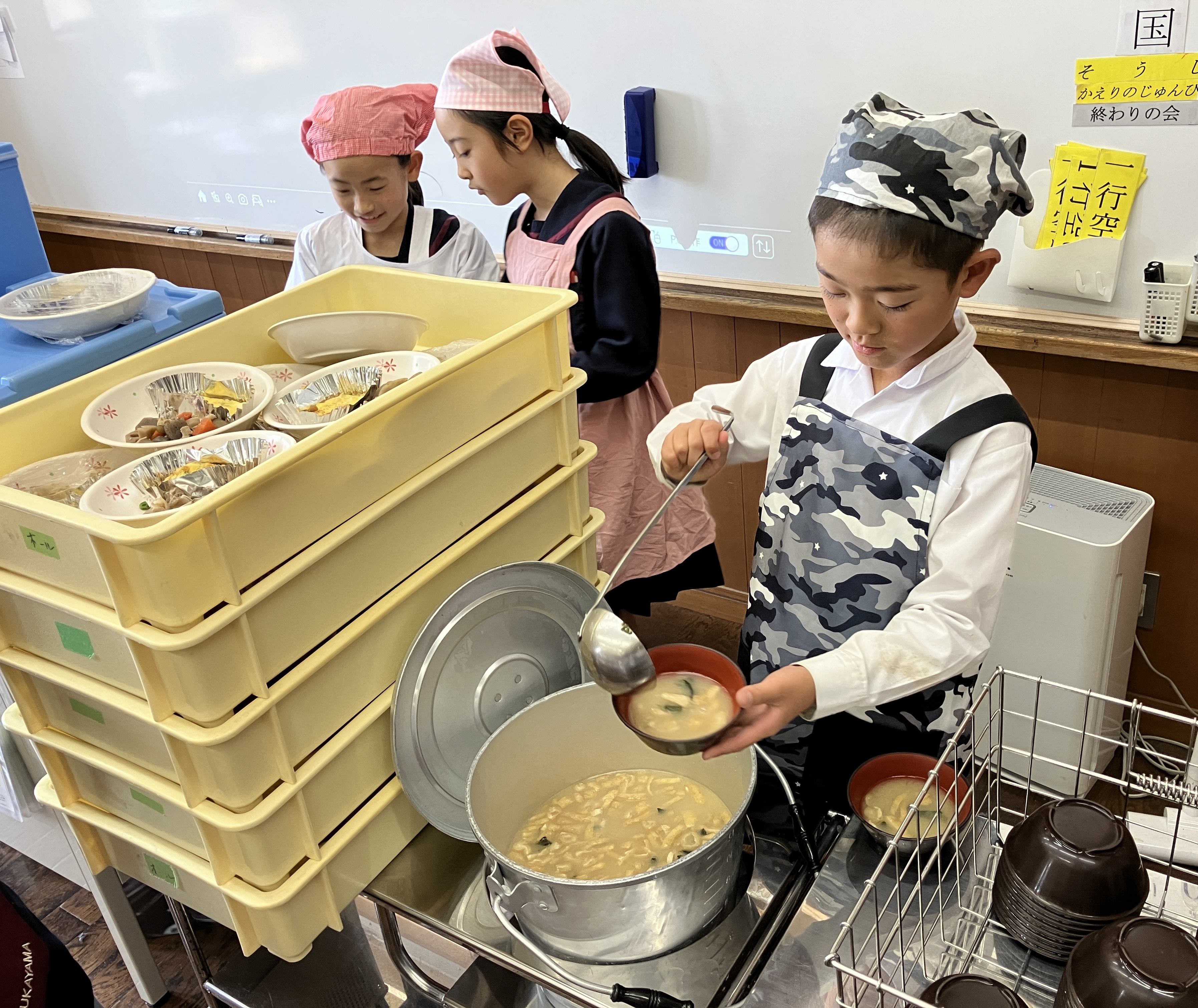 お味噌汁を初めて注ぐ時は、「上手に注げるかな。」と不安がっていた児童もいました。回数を重ねるたびに、上手に注げるようになってきました。