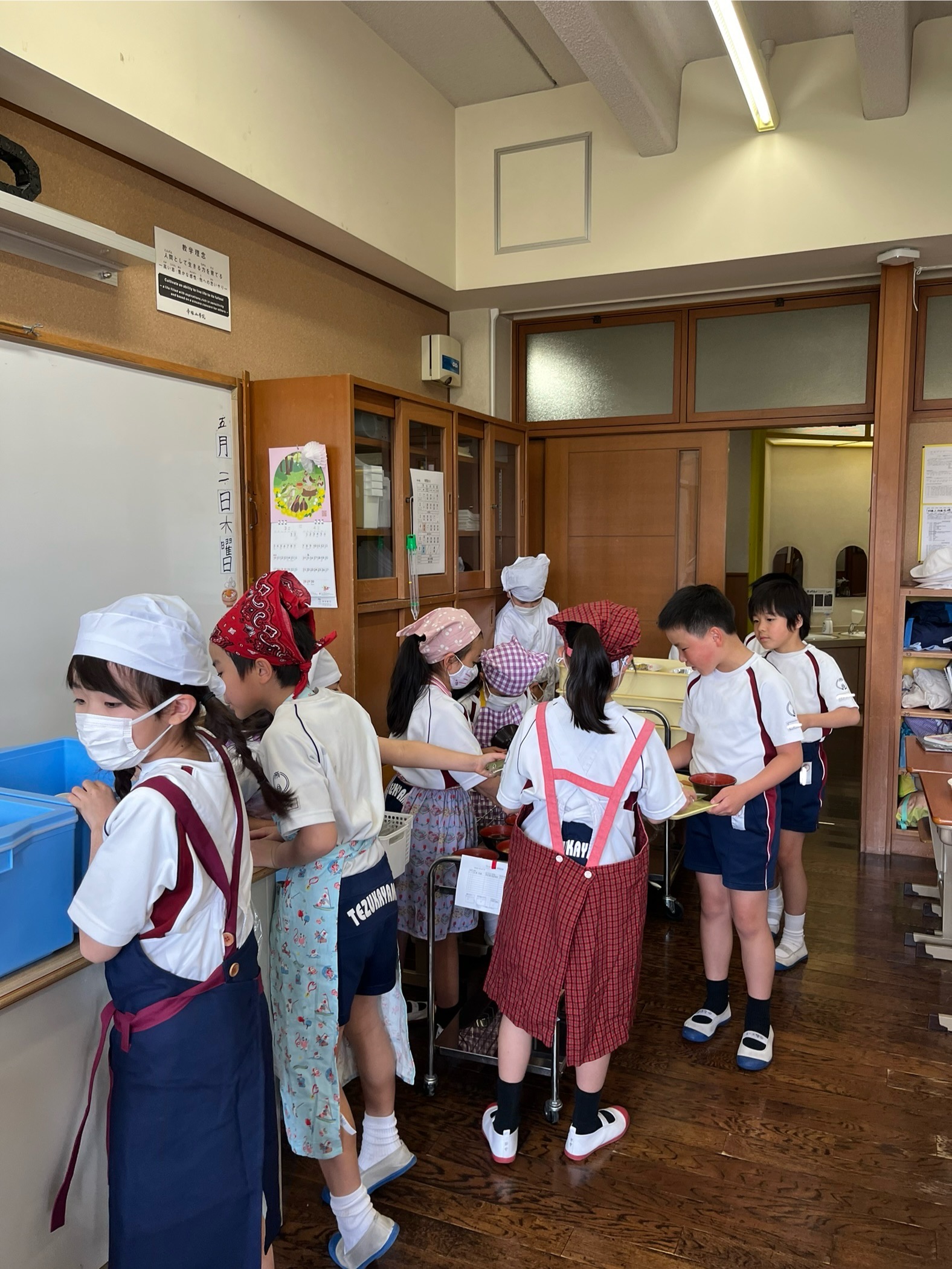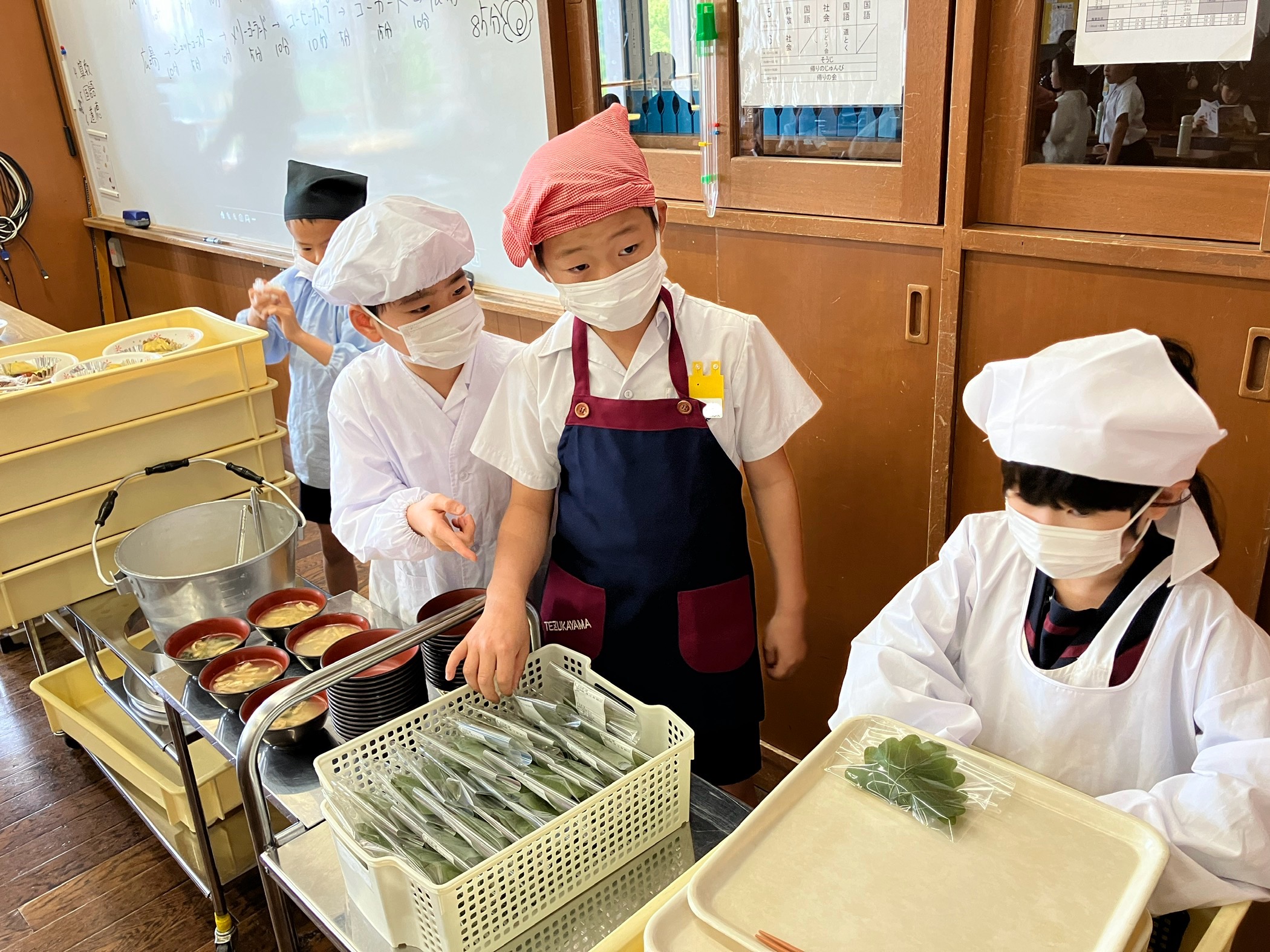 3年生から、給食の配膳を全て自分たちでするようになっています。