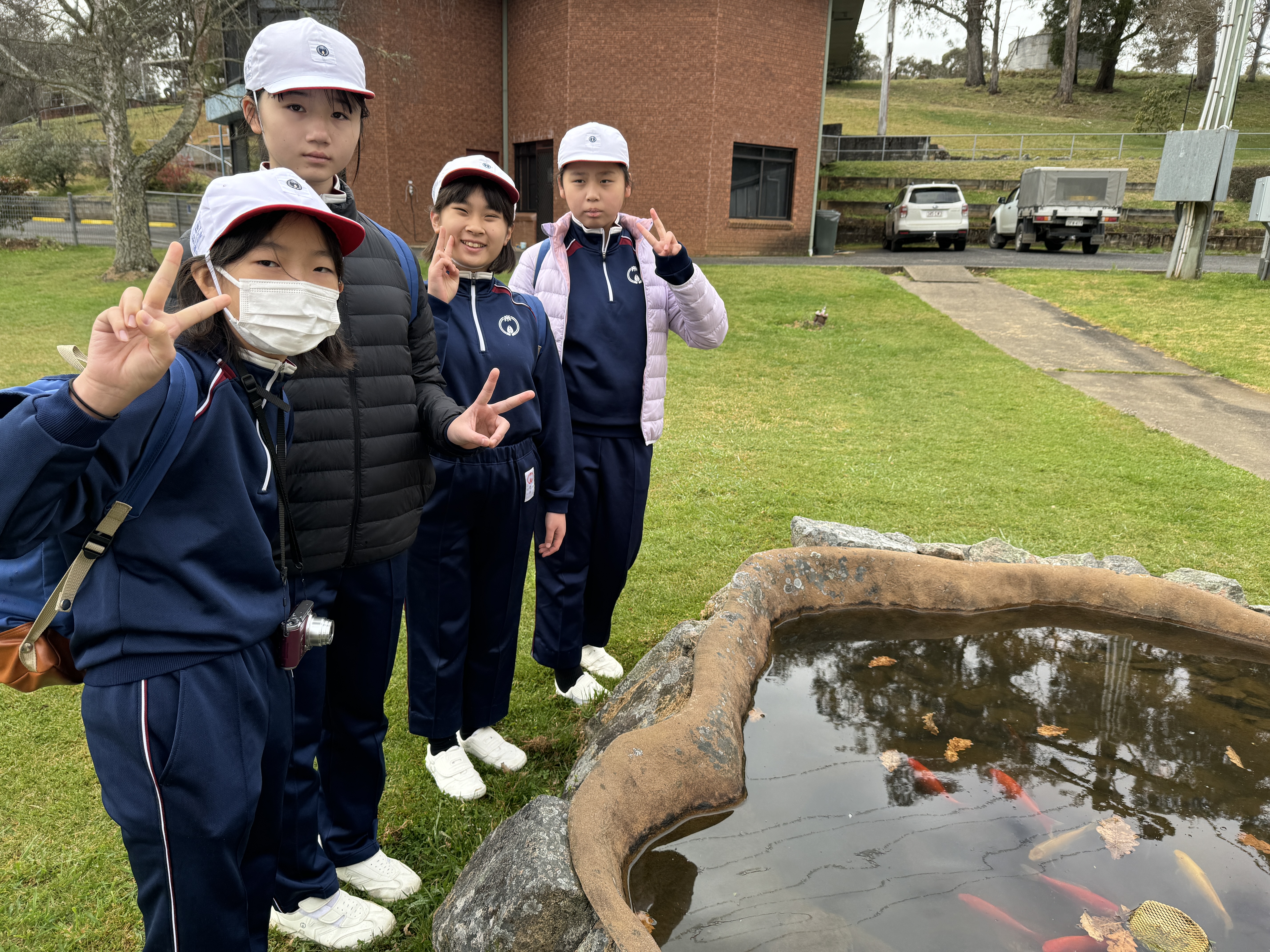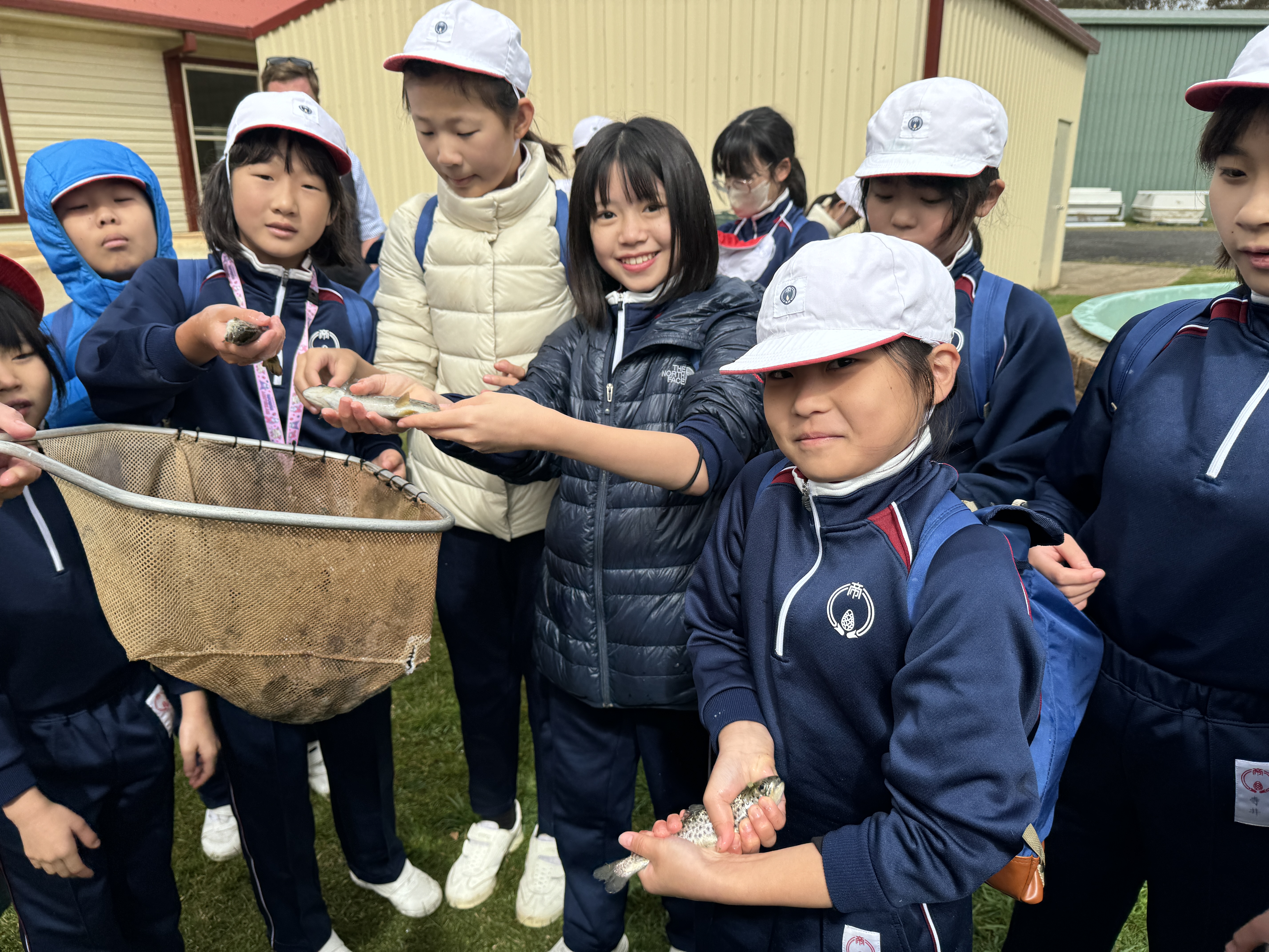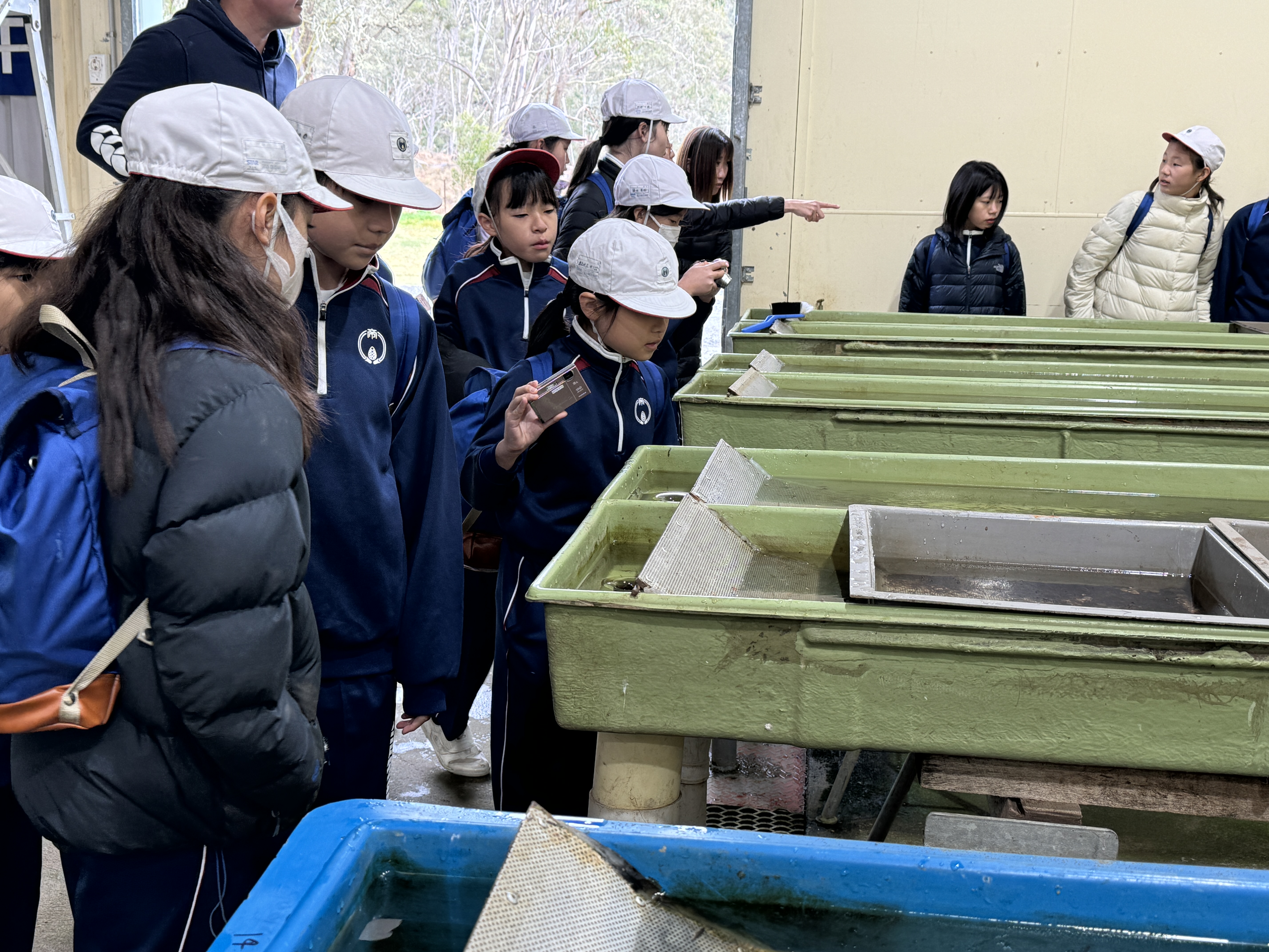 午前中は、マスの養殖場に社会見学に行きました。児童たちは、魚のプロからマスについての説明を聞いたり、エサやりをさせていただきました。