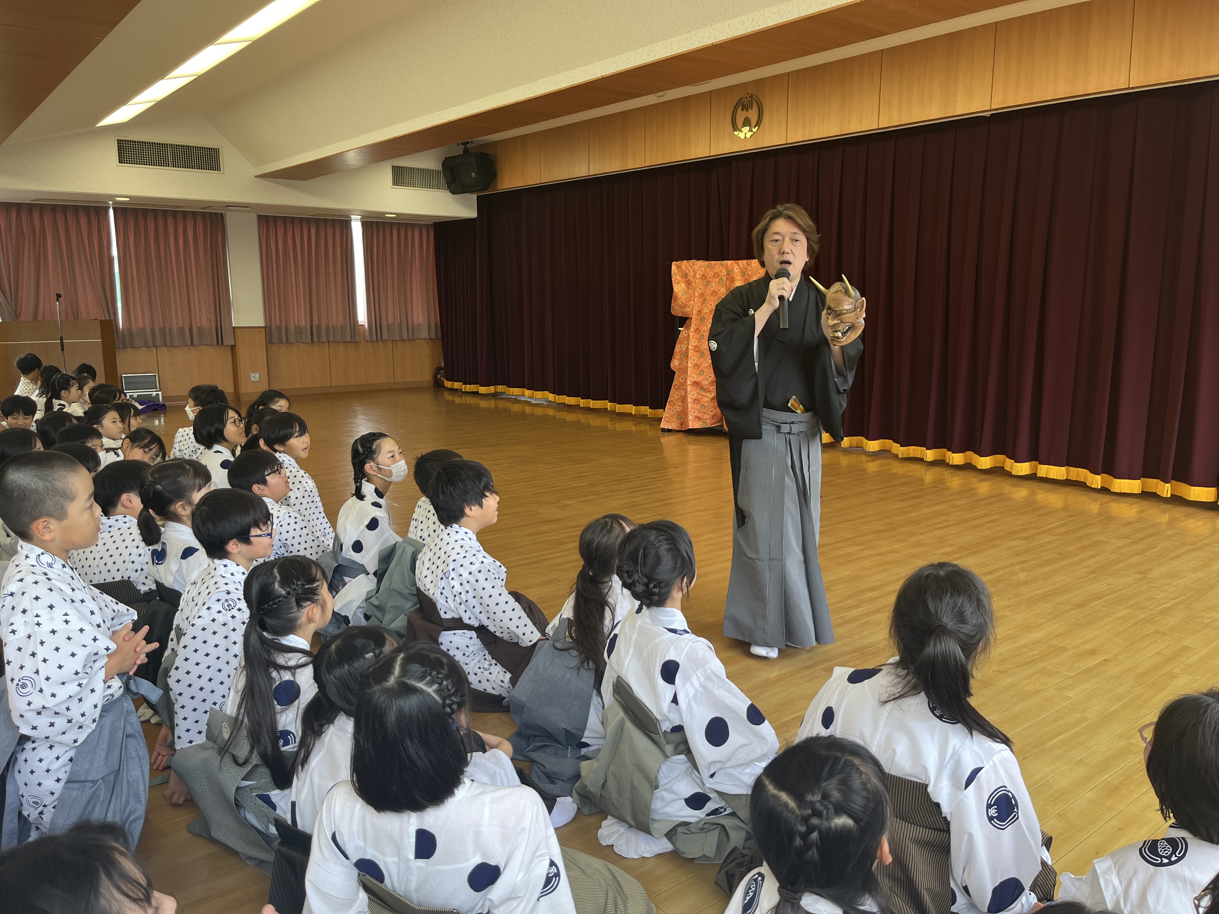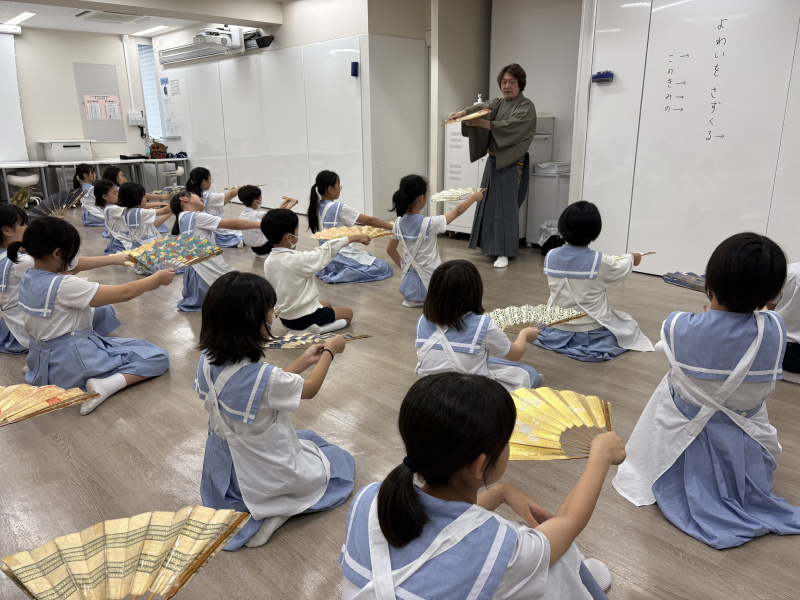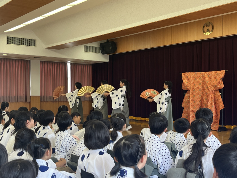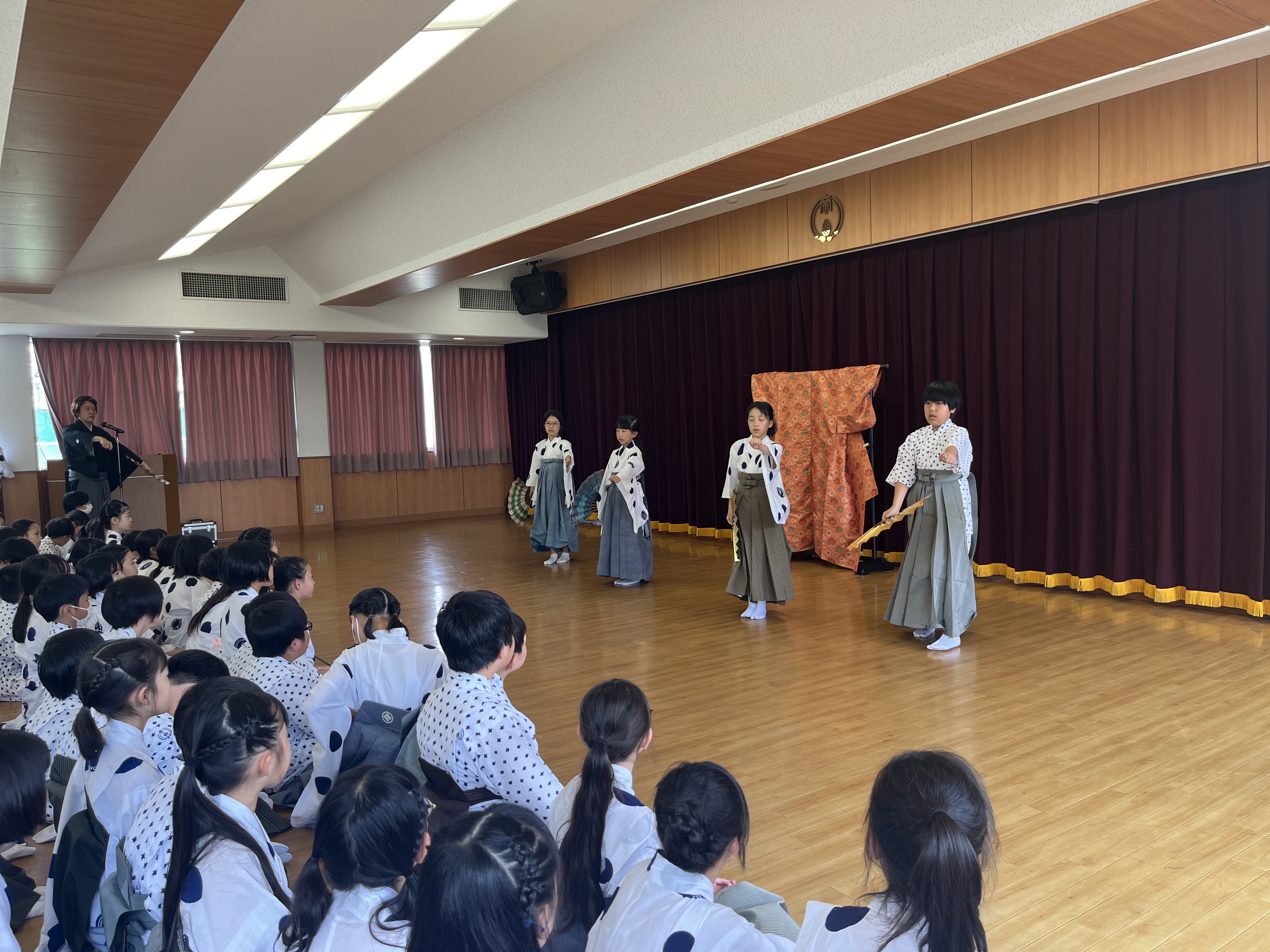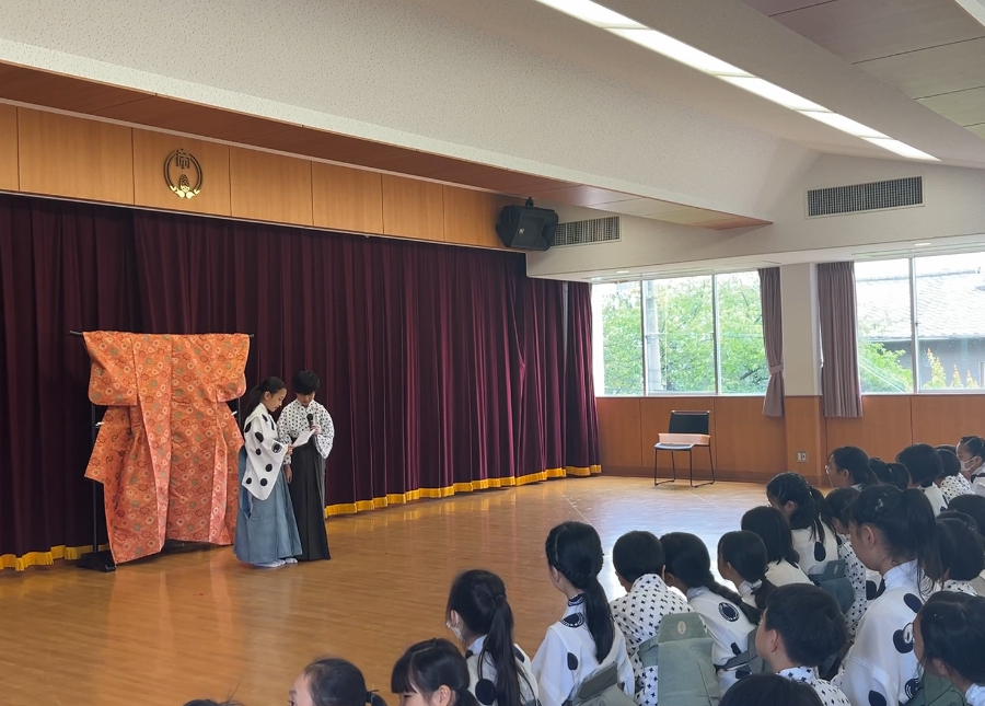 子どもたちは、山中迓晶(がしょう)先生のご指導のもと、緊張しながらも、堂々と舞いを披露しました。