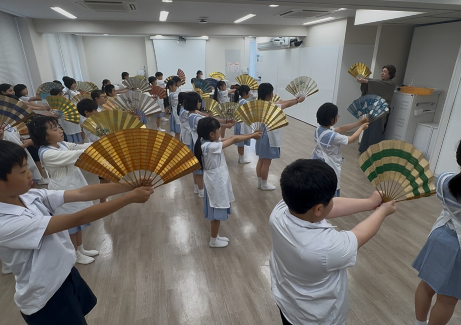 初日は能の歴史について学び、「老松」の歌を練習し、2日目からは扇を持って踊りのお稽古をしています。