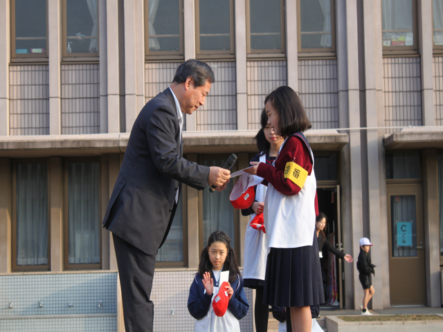 本日、外朝礼にて昨日行われた児童会役員選挙の認証式が行われ、新しい役員に認証状が渡されました。