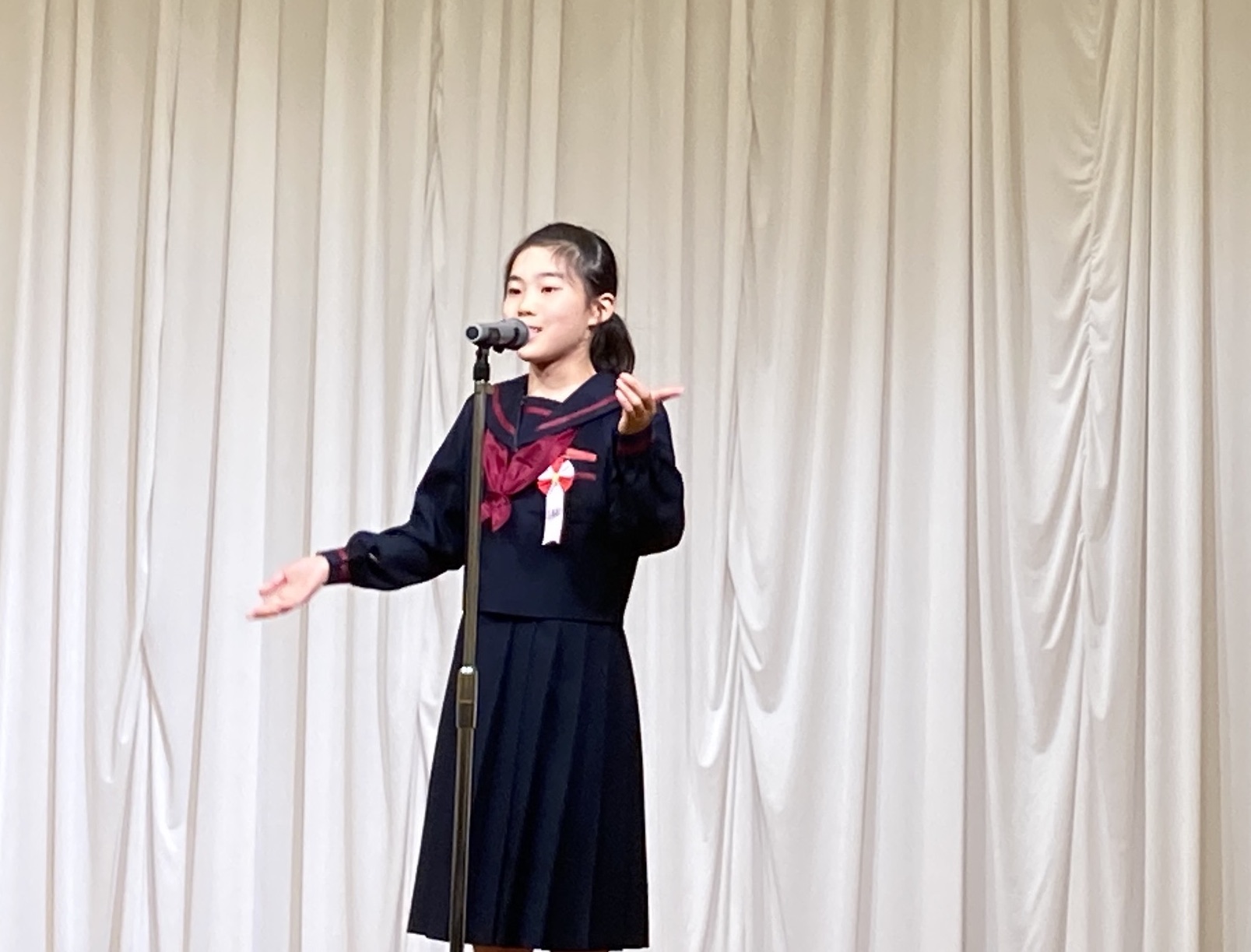 2名とも、校内コンテストの後も練習を重ね、発音やイントネーション、表現力にさらに磨きをかけてきました。日を追うごとにどんどん上手になっていく様子はとてもたくましく、本番も堂々とその練習の成果を発揮してくれました。2人とも暗唱発表の後には会場から「笑い」も起き、物語の面白さをお客さんに伝えられていたことがわかる、とても嬉しい瞬間でした。