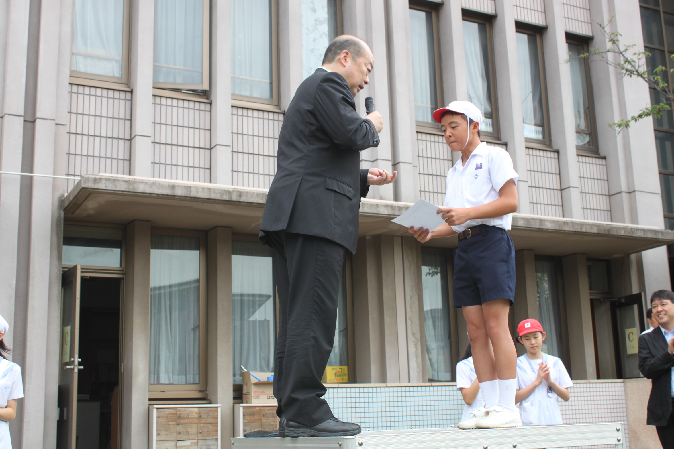 校長先生から、役員児童に認証状とバッジが手渡され、全校児童に紹介されました。