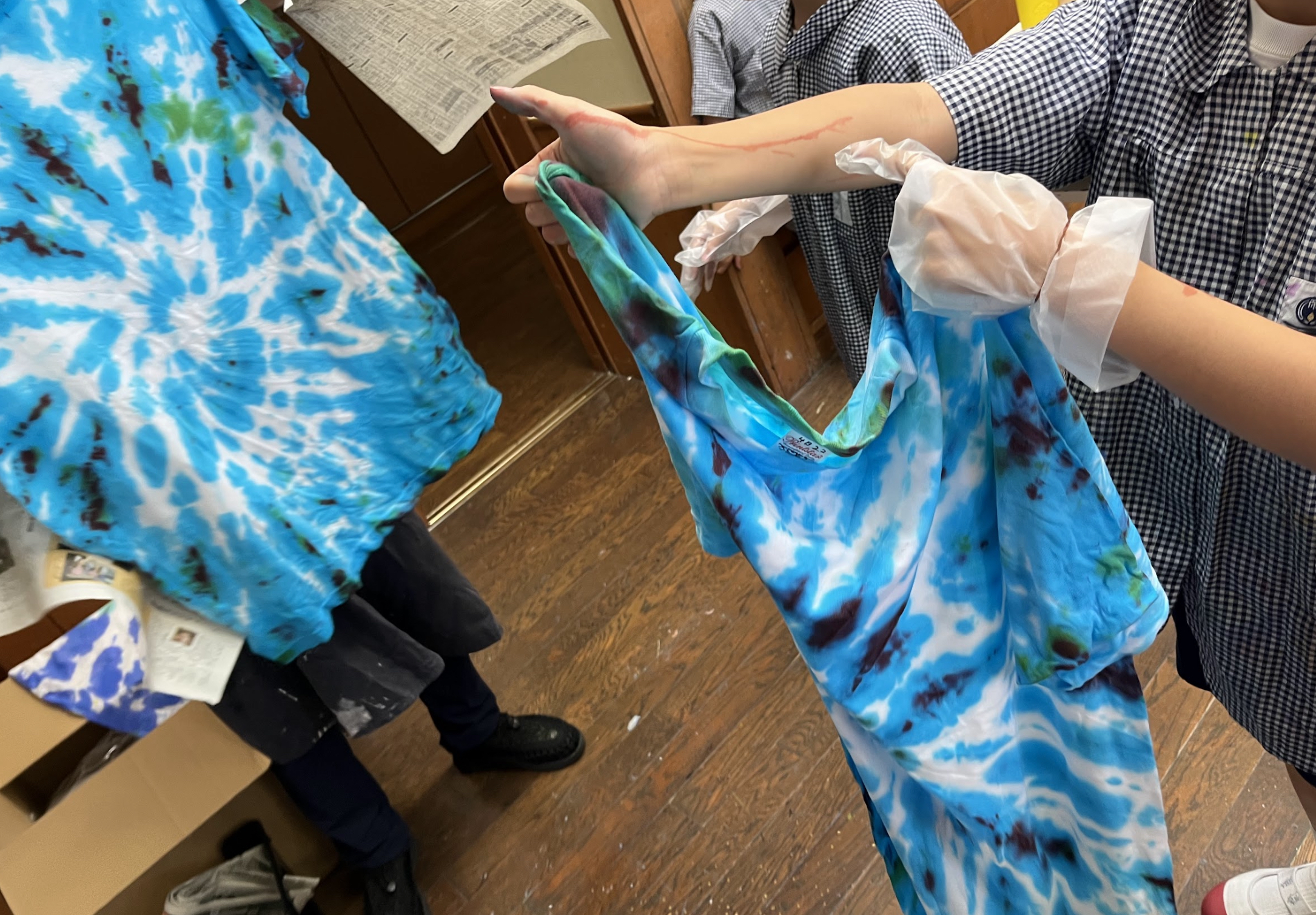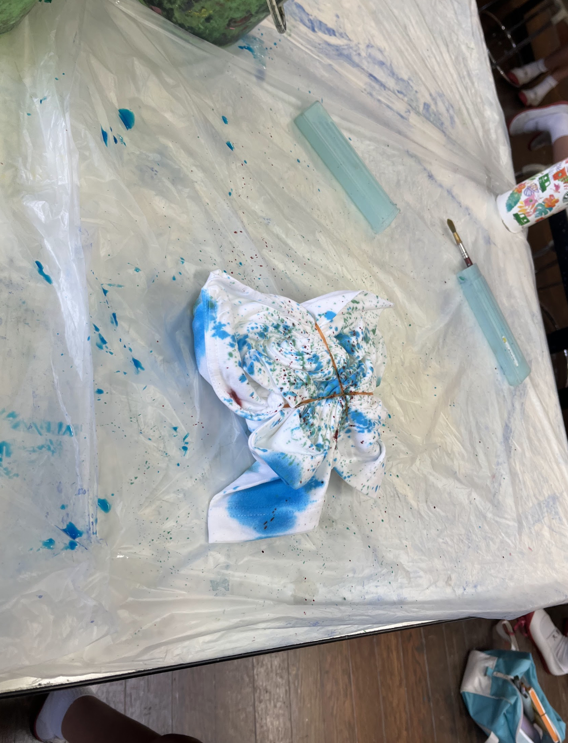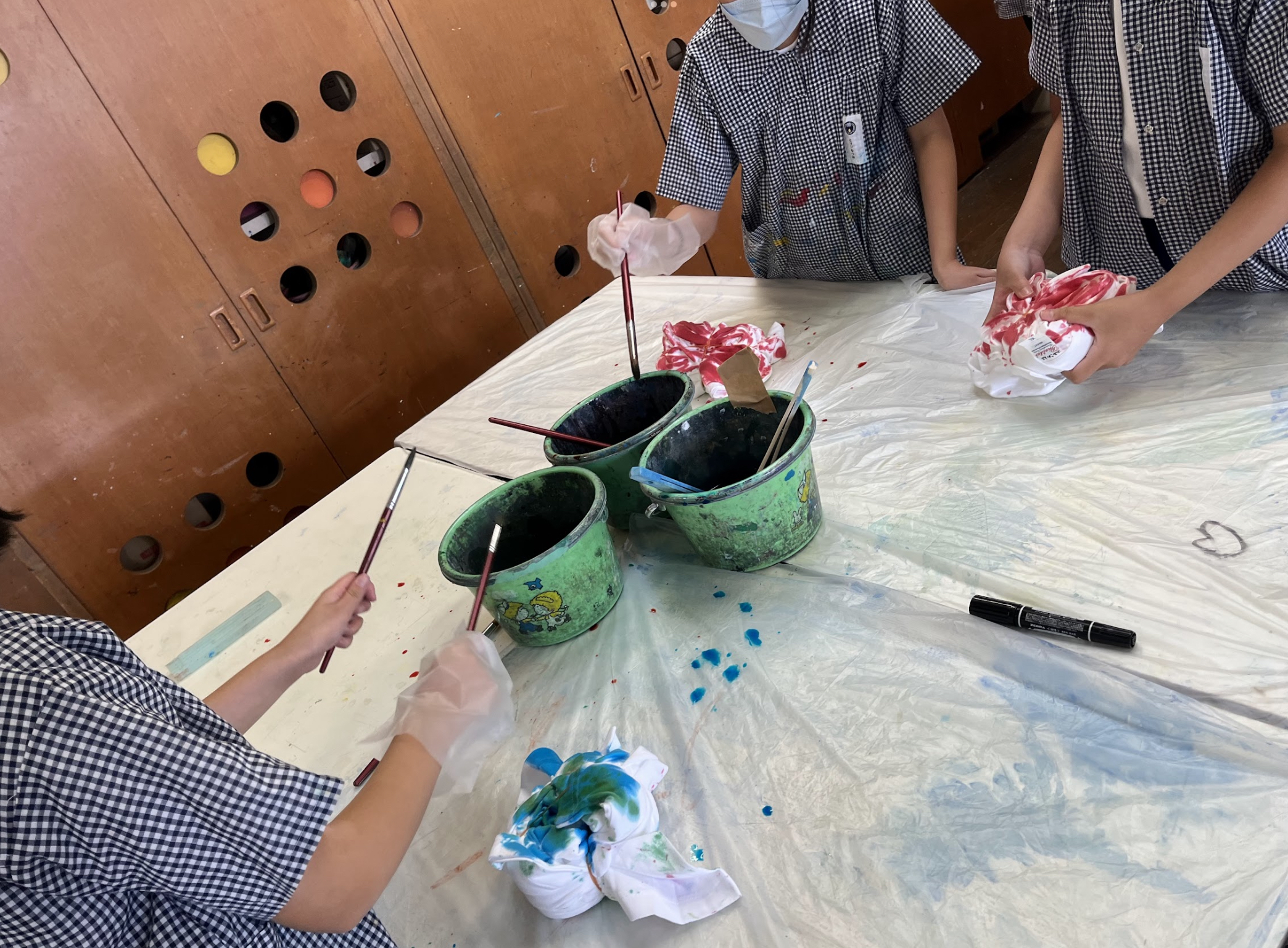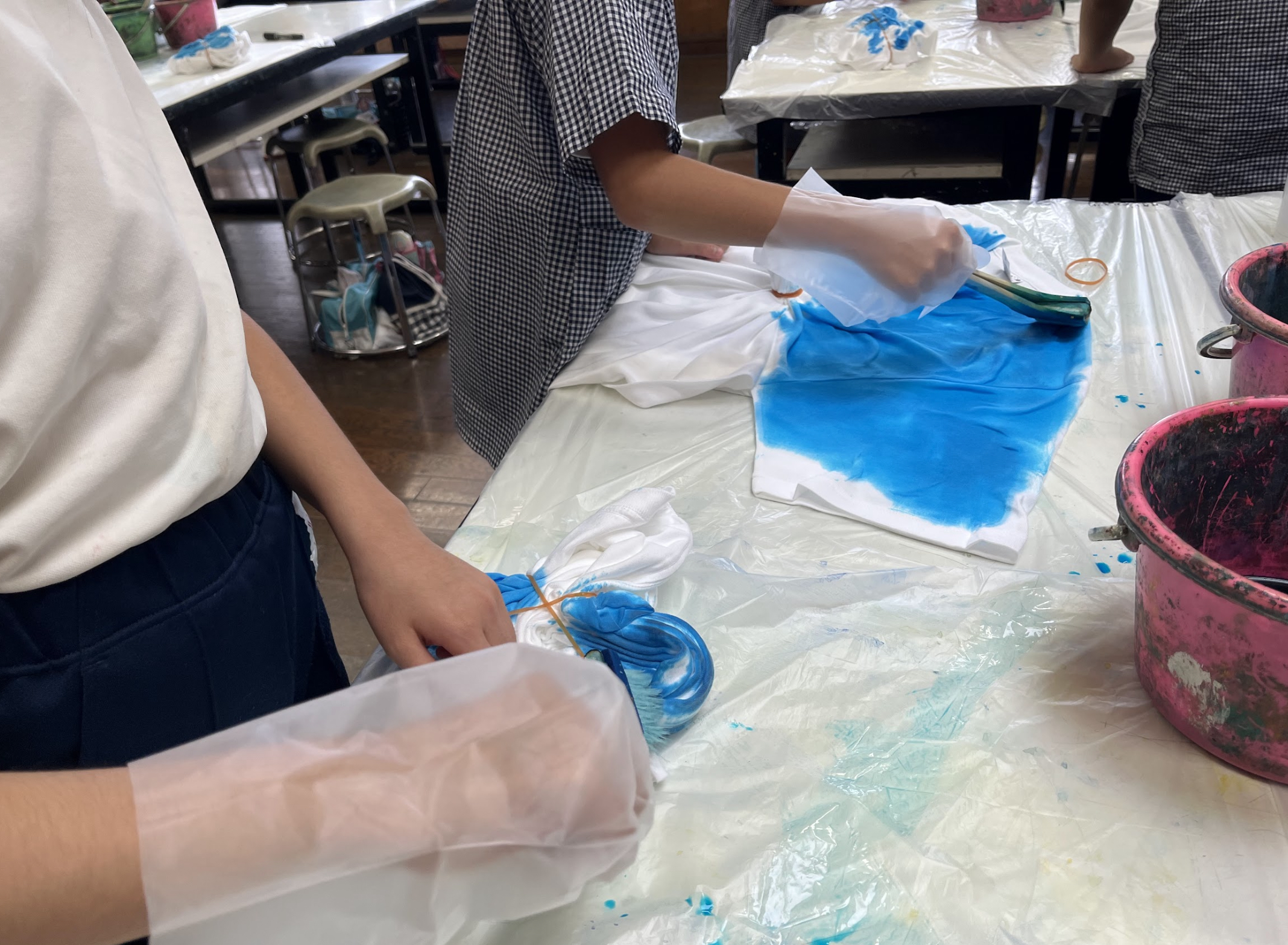 ねじねじしたり、くるくるしたりして、ギュッと絞り、染料を入れていきました。同じものが一つもない、その子だけの色で染めた法被に、ソーラン節に込める想いを漢字で一文字入れて完成となります。(今回は染めるのみです)