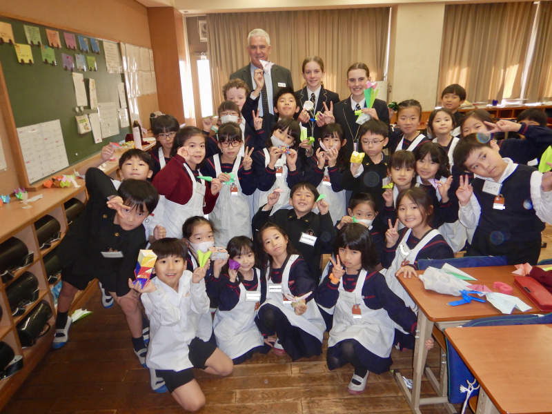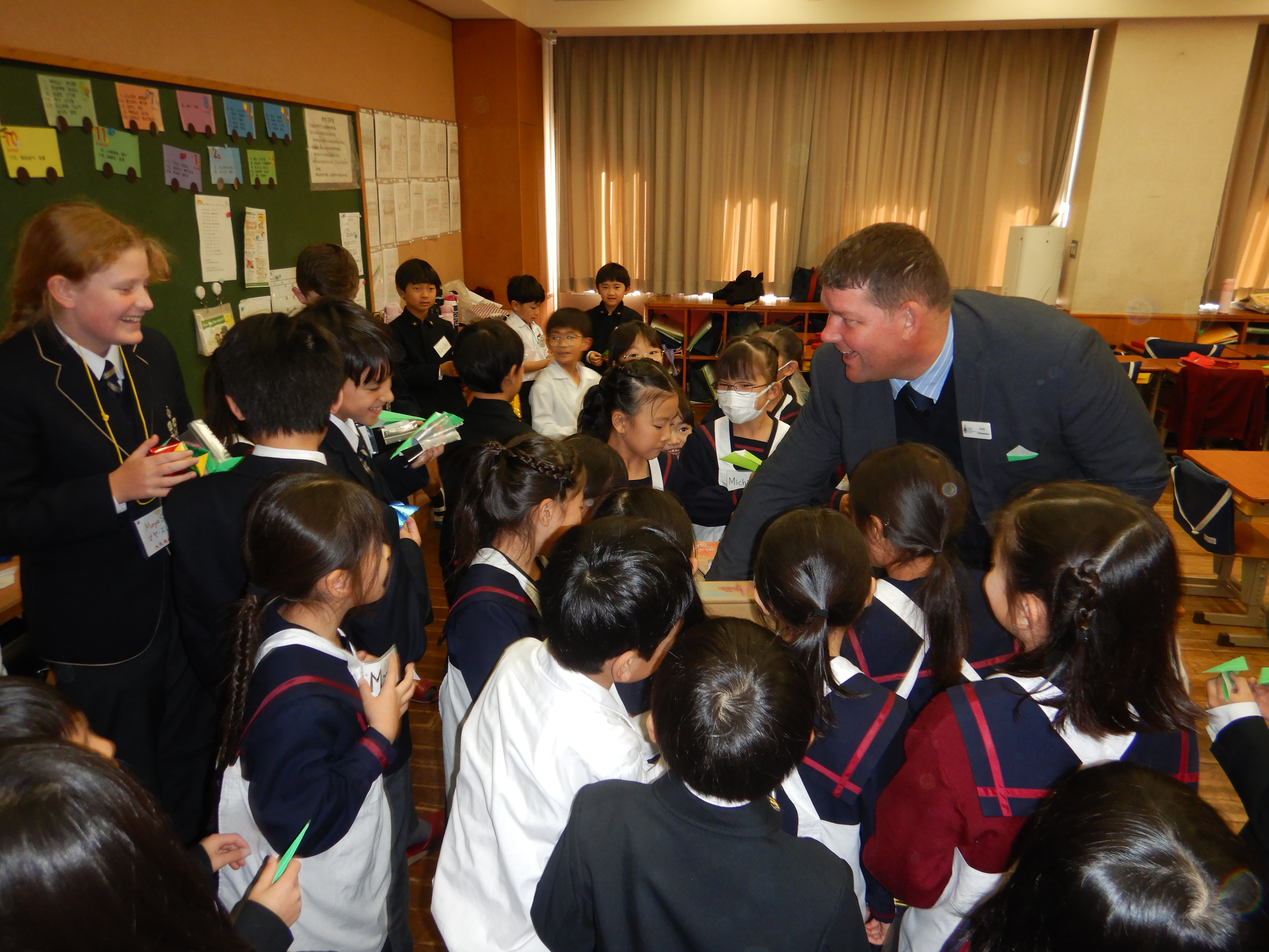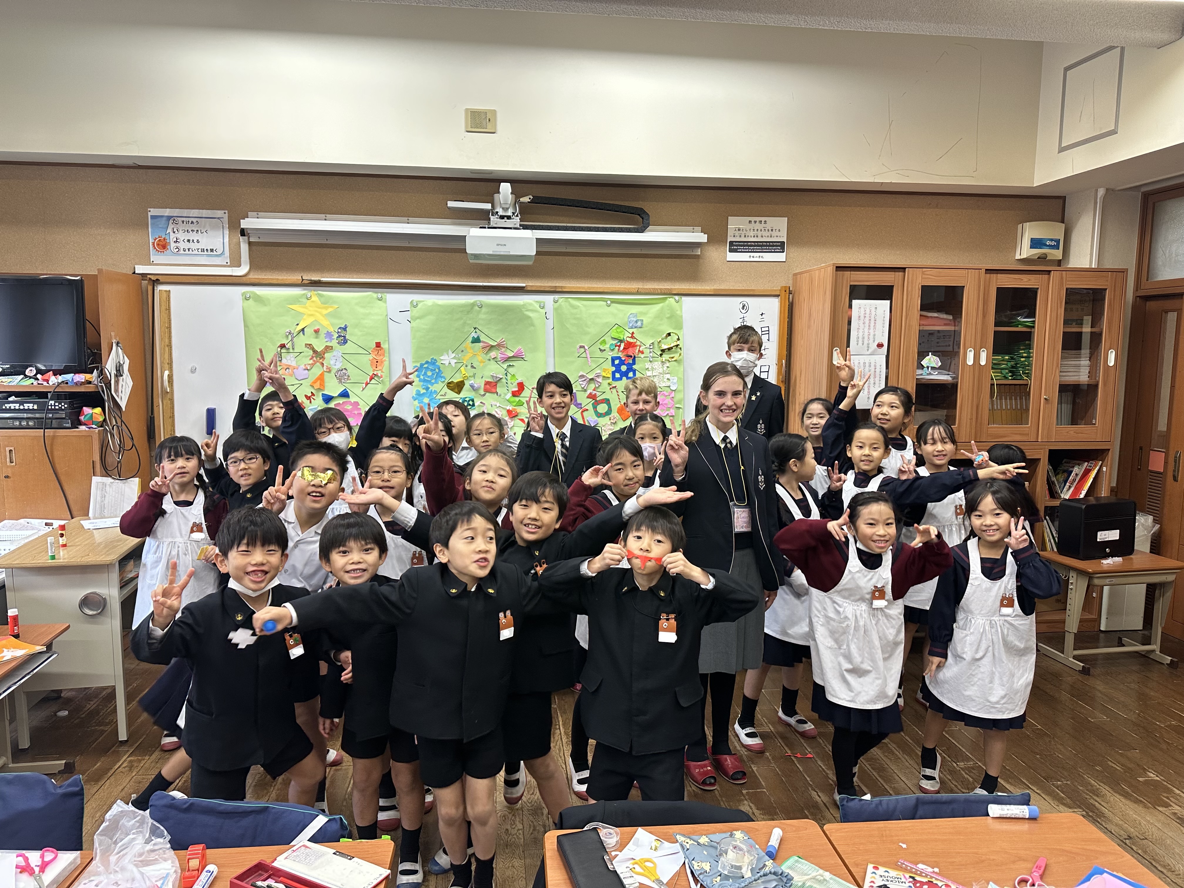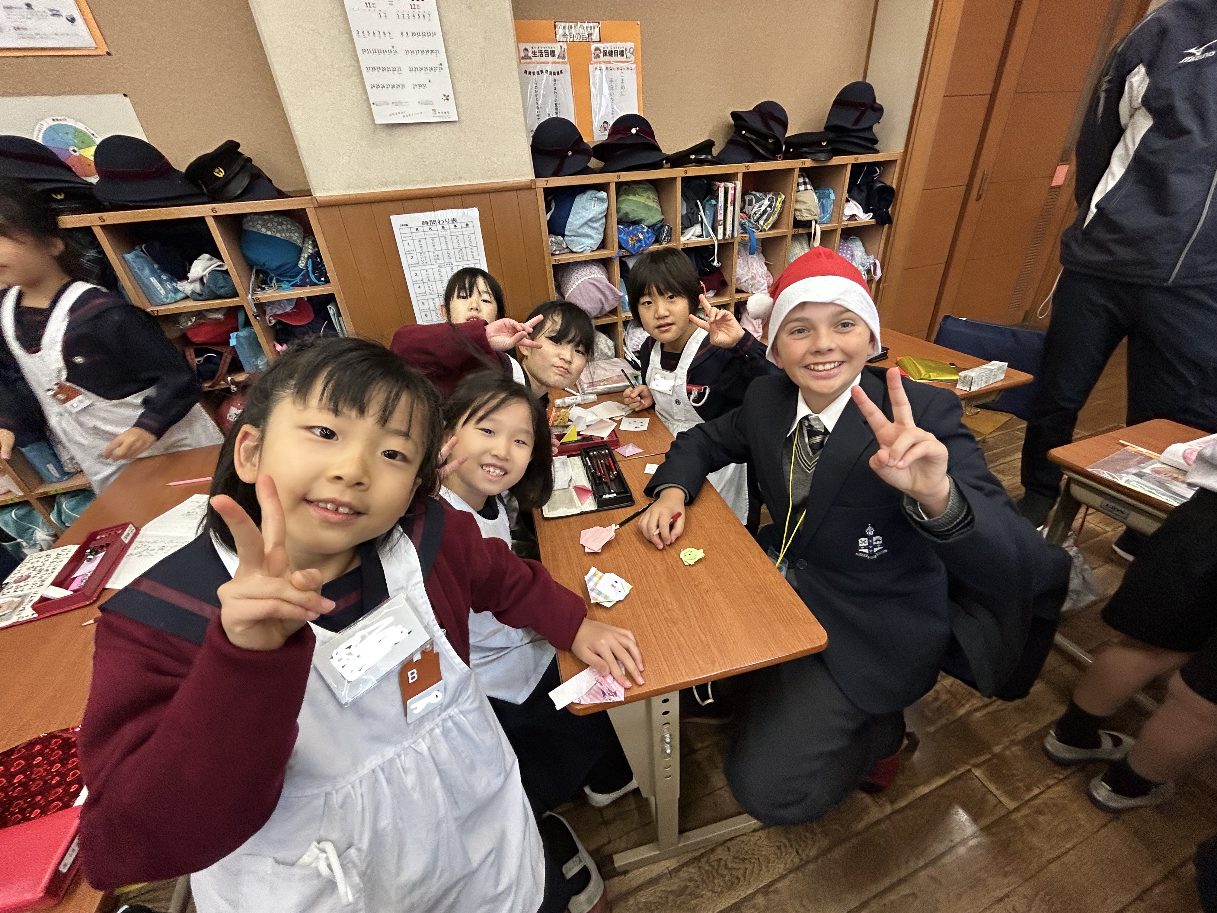 また、2年生ではクリスマスツリーがかかれた模造紙に、星やサンタなどの飾り付けを一緒にしました。また、折り紙で作った鶴やかぶとなどをプレゼントするとアーミデールスクールの児童たちはとても喜んでいました。