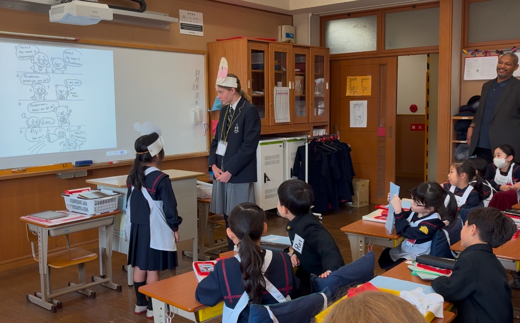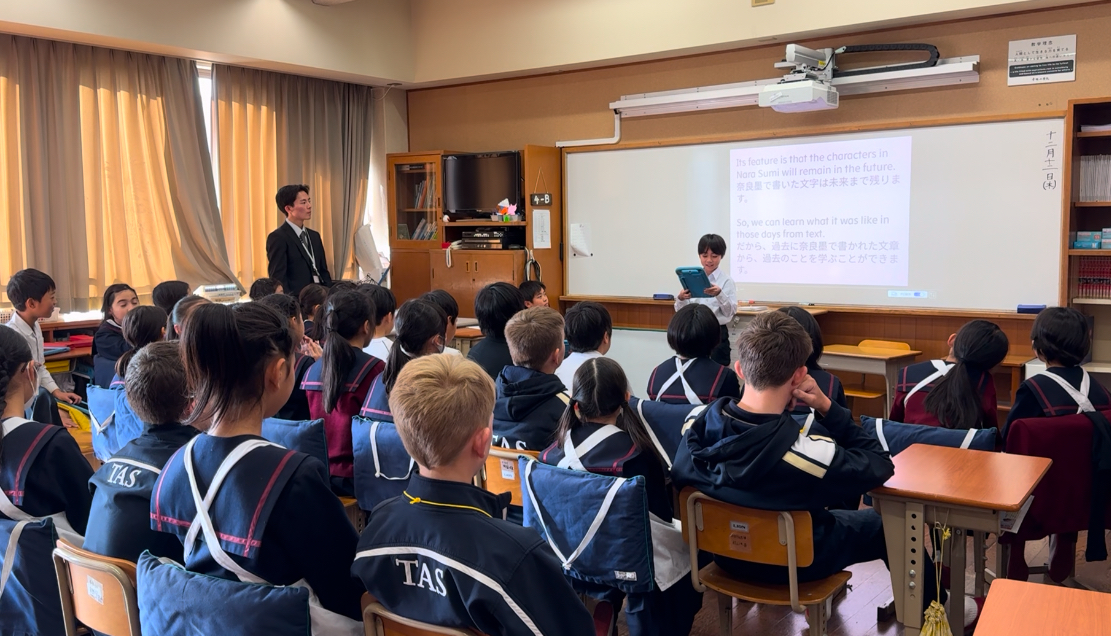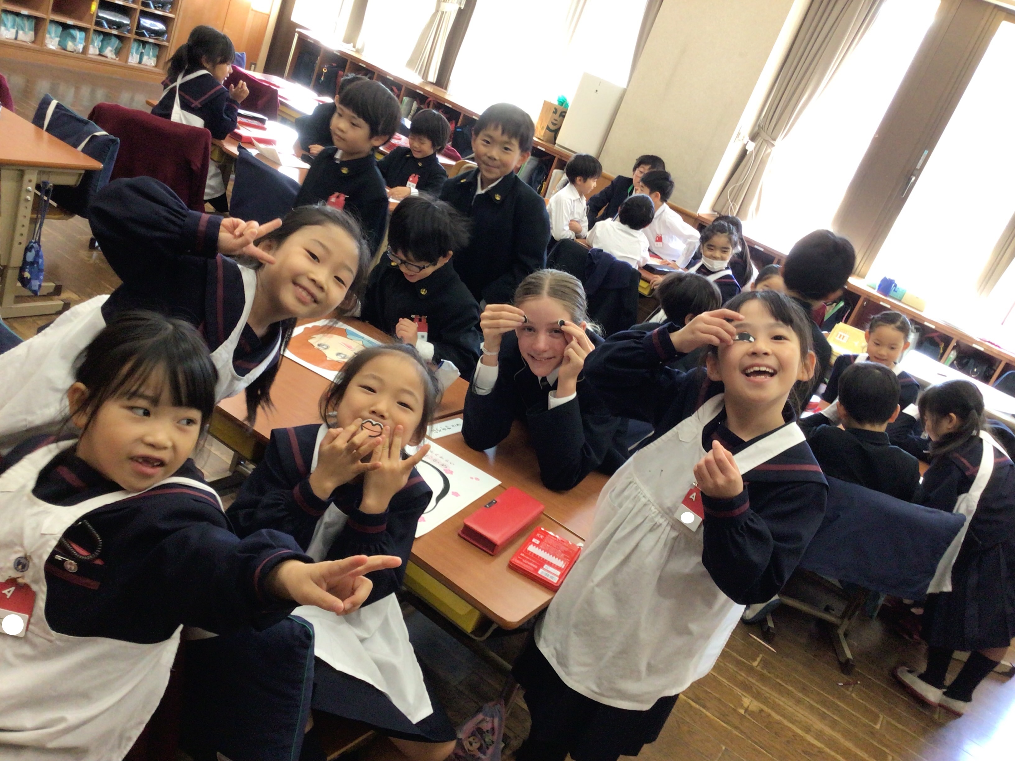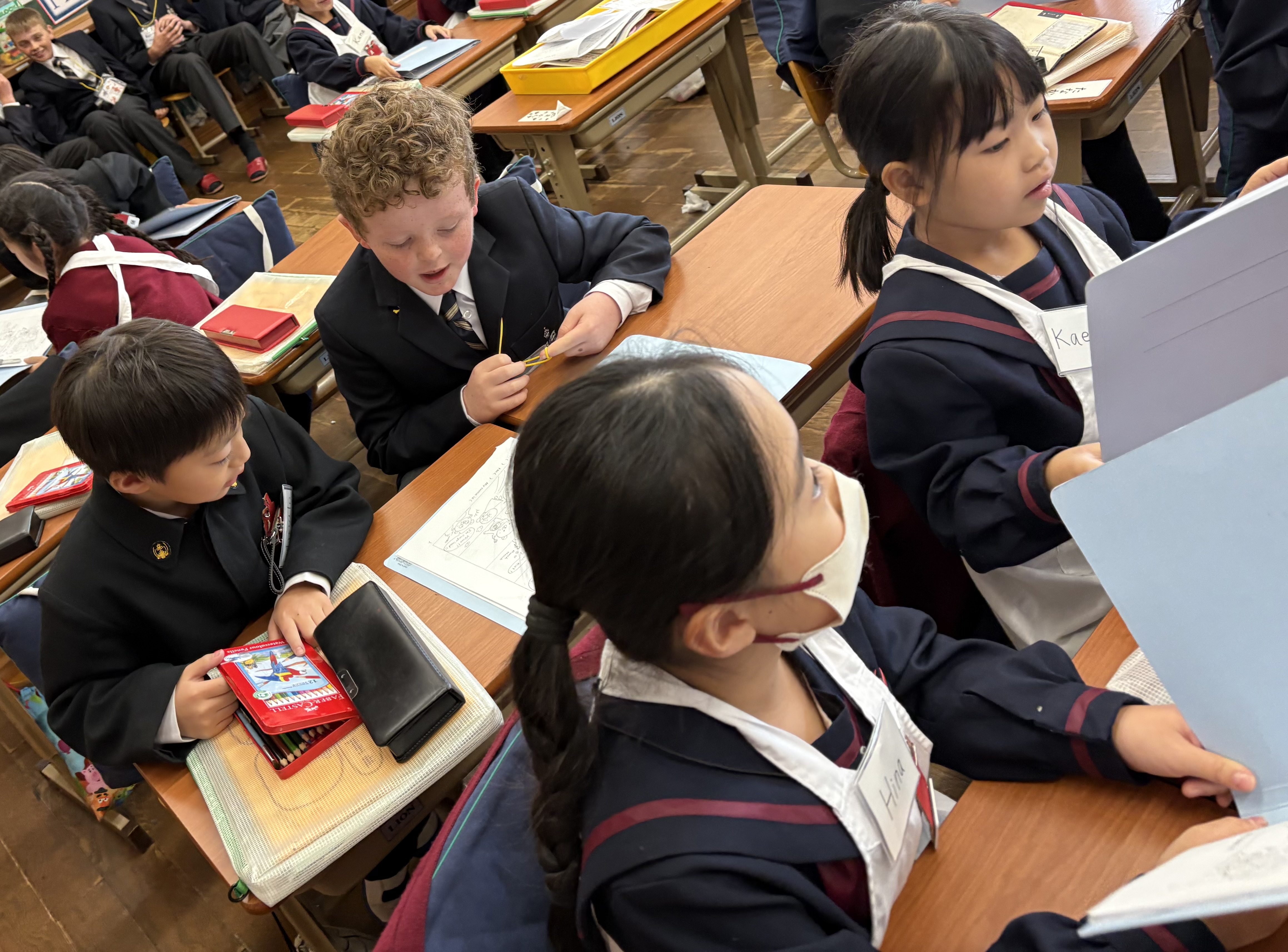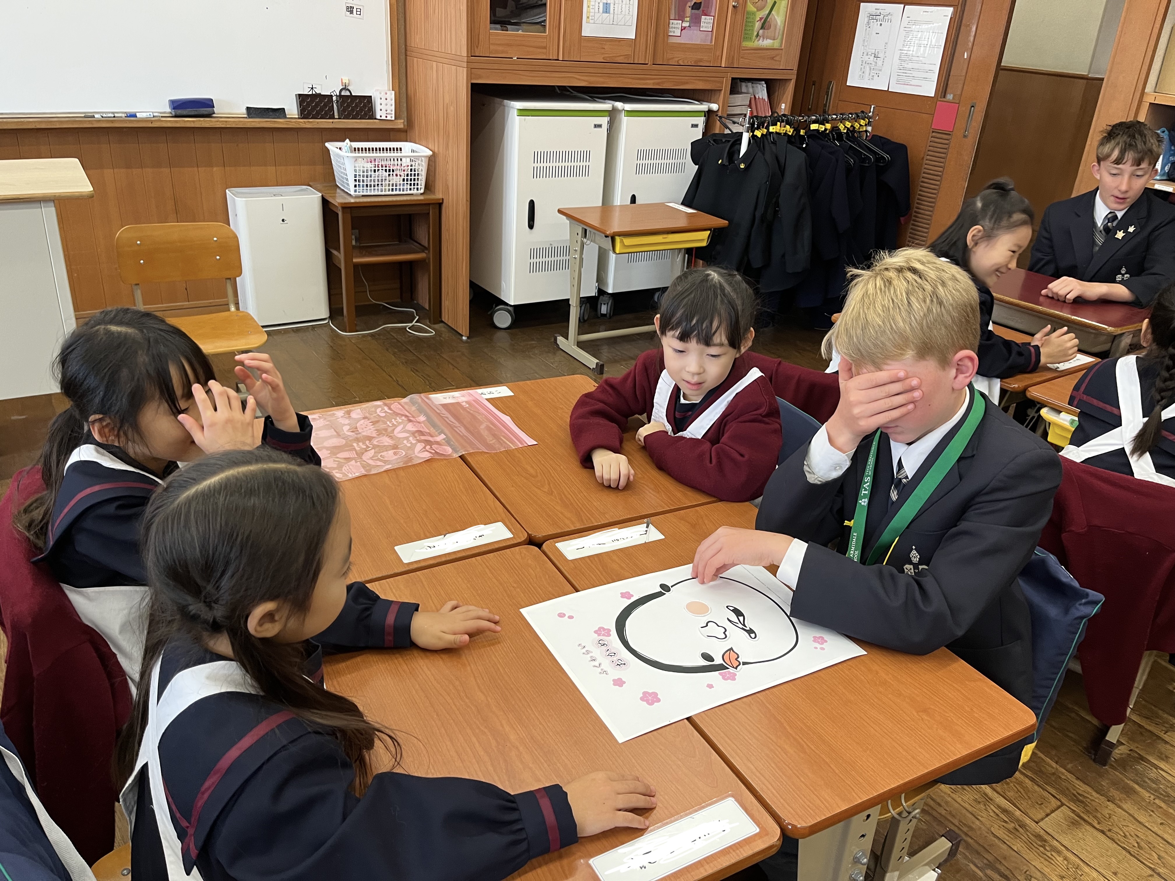 また、2年生ではクリスマスツリーがかかれた模造紙に、星やサンタなどの飾り付けを一緒にしました。また、折り紙で作った鶴やかぶとなどをプレゼントするとアーミデールスクールの児童たちはとても喜んでいました。