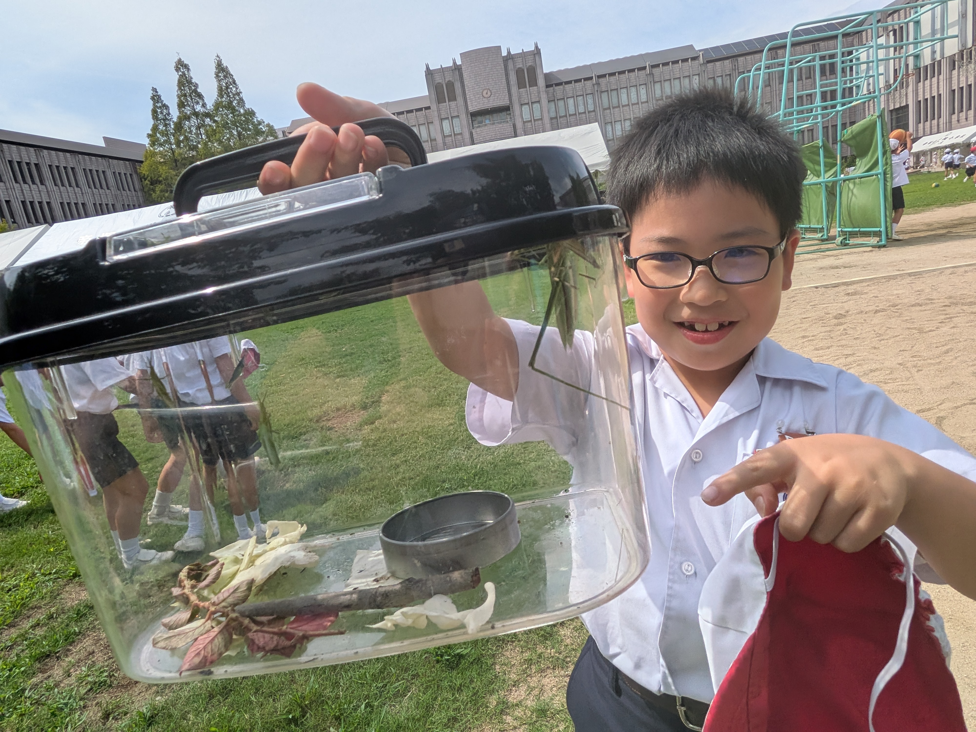 今日は、2年生がバッタ探しに夢中になっているところを発見。学校にこんなに大きなバッタがいるなんてびっくりです!(2枚目は先生(撮影者)の服にたまたまバッタがくっついていることを発見してびっくりしている様子です)
