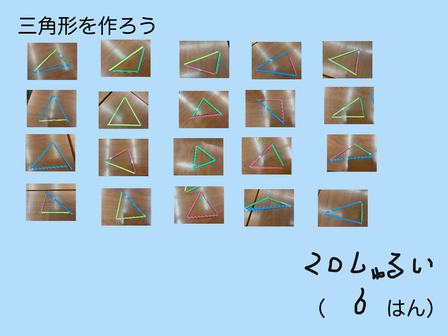 3年生の算数では、色ぼうを3本組み合わせて三角形づくりに取り組みました。班ごとに協力しながら工夫して、多くの三角形をつくることができました。「全部で何種類の三角形ができるのかな?」と、子どもたちの探究心も高まっています。次回は、できあがった三角形を仲間分けし、正三角形や二等辺三角形の学習へとつなげていきます。