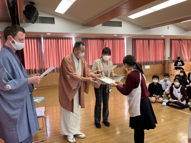 第2部ではかい枝さんによる古典落語と英語落語、福龍さんによる英語落語を鑑賞しました。ジェスチャーや顔の表情、仕草の一つひとつまでおもしろく、あっという間にみんな落語の世界に引き込まれたようです。終始笑いの絶えない鑑賞会となりました。