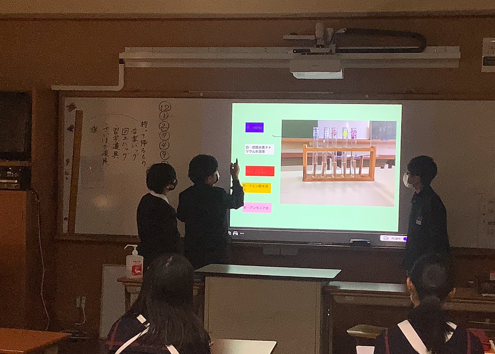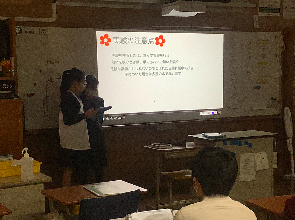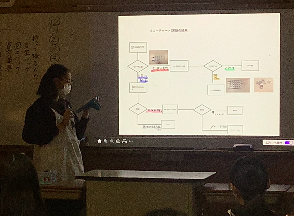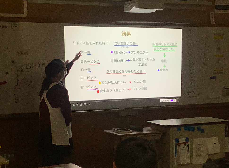 写真は、自分たちで行った実験のまとめ発表の様子です。