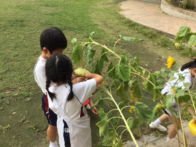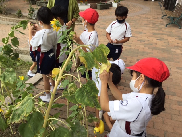 6月に1年生と園児のみなさんが種をまき、育てたひまわり。
