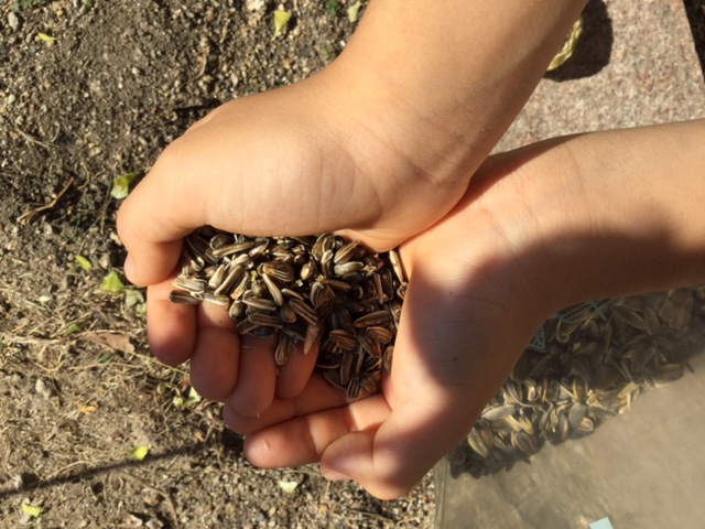 この種は来年、新1年生と園児のみなさんのひまわりの種まきに使われます。